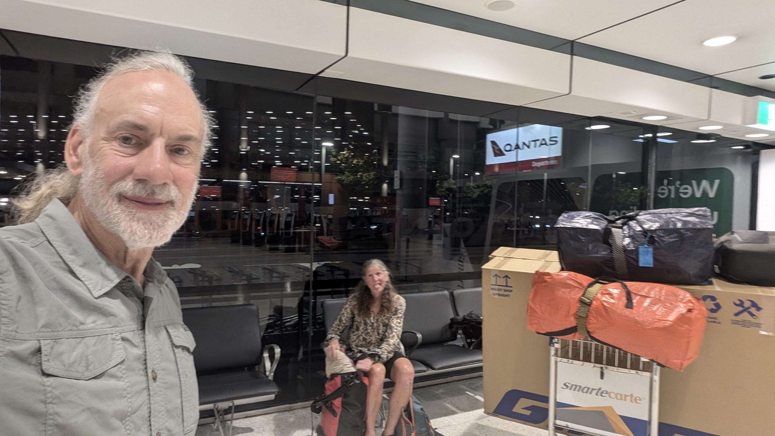 Now we’re at the airport and the Qantas counters are closed until 3 AM. So, we set up or own little sleeping “fort” in hopes of getting a couple zzzzzs before our 5:15 flight to Sydney.