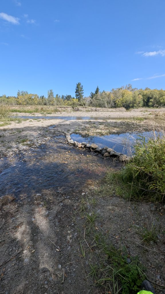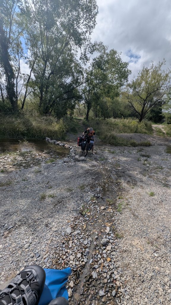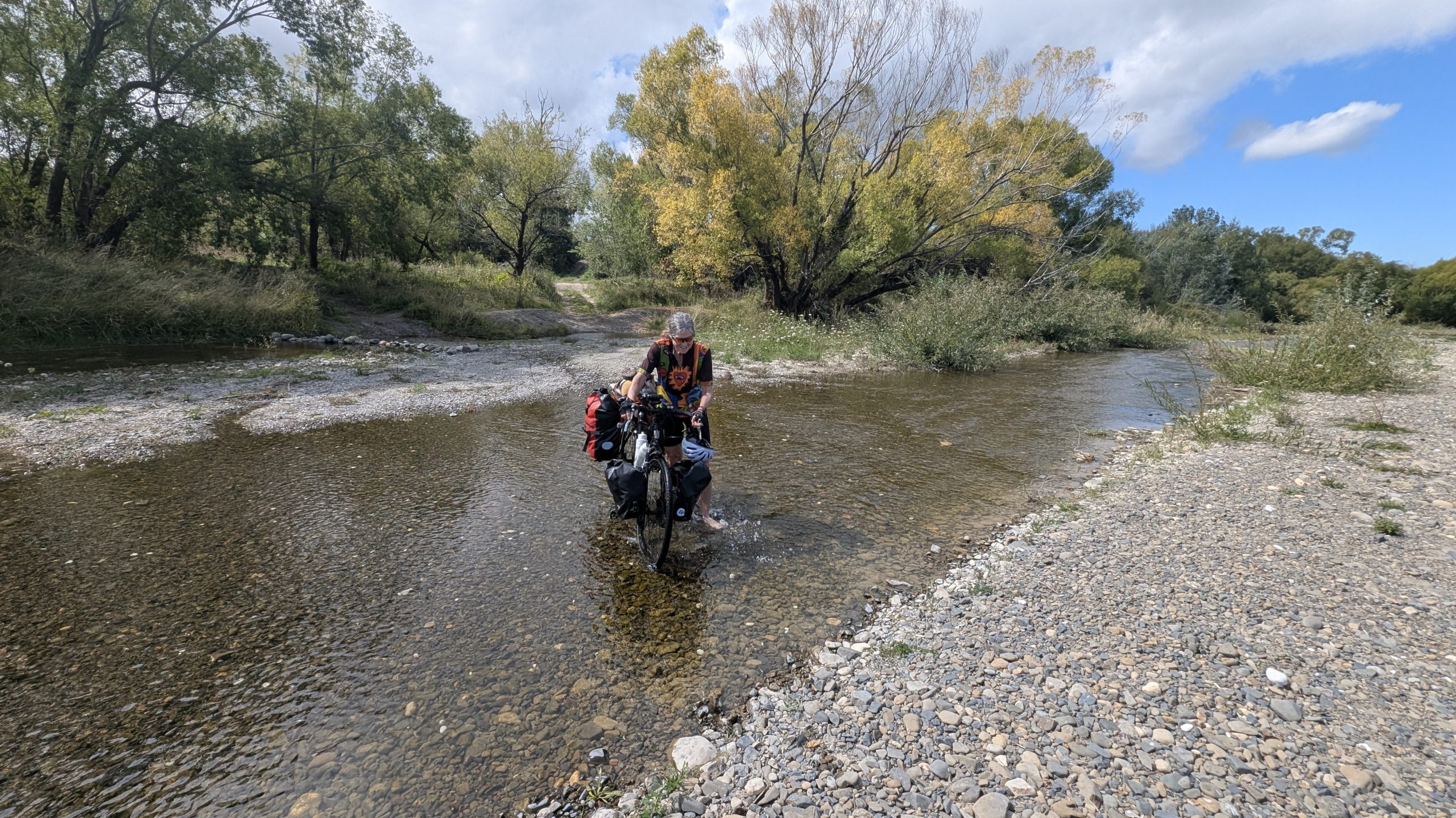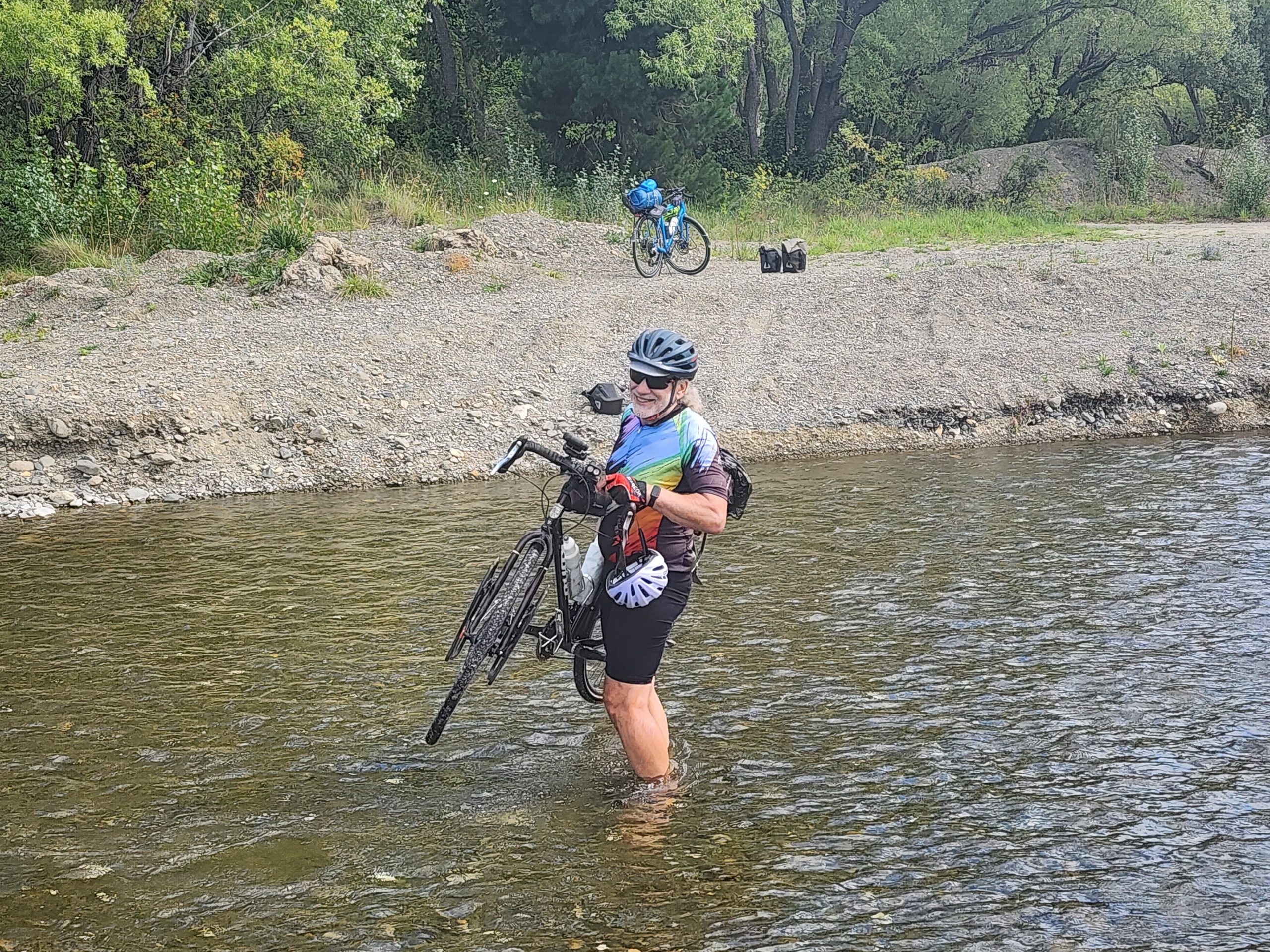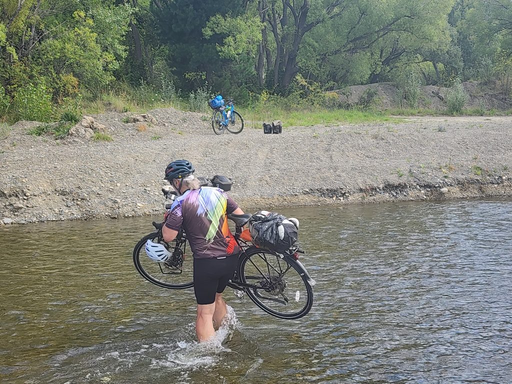 Today’s stop will be in Amberley or Amberley Beach if we have the gumption to go 6 extra miles (which also adds more on tomorrow). On the way to Amberley, Ride With GPS (via Google) routed us to a 3 stream channel. Rather than go retrace our steps and spend any more time on RT 1, we decided to ford across. The last stream was too deep to walk the bikes through, so it was portage time. We took off all the bags and shuttled them and the bikes across to the other bank. All in all, it took about a half hour to get across.