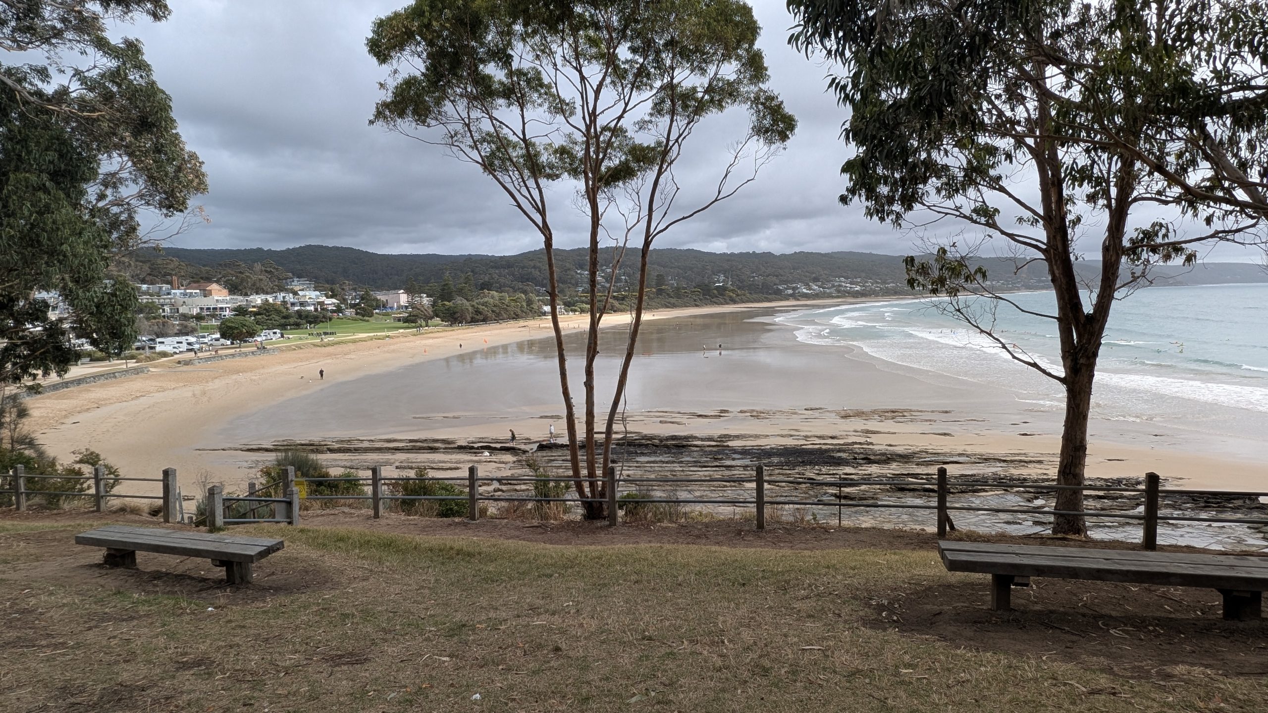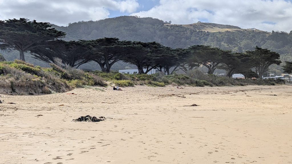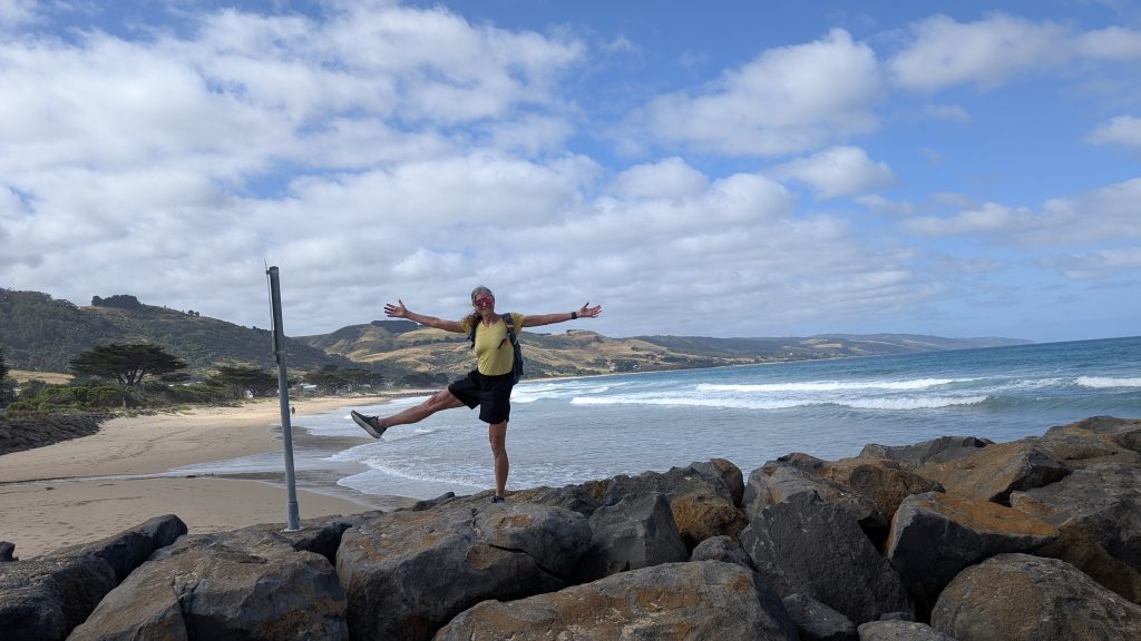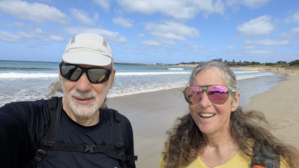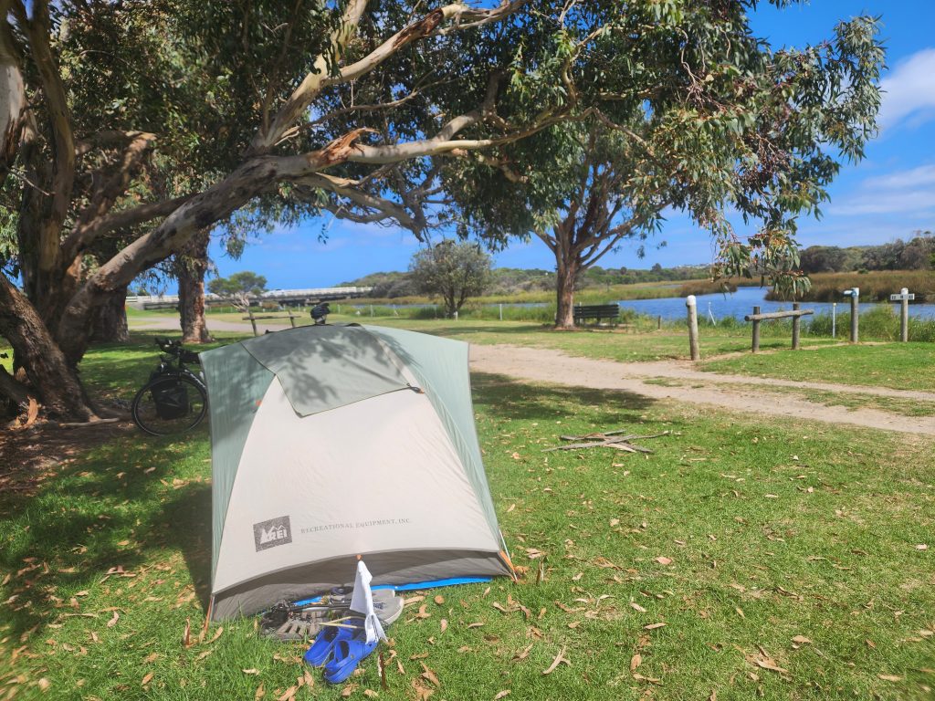 Except I wasn’t. Halfway to Apollo Bay (AB), I was bonking, struggling with the hills and the headwinds, and it was only the first third of a lot of climbing. By noon, I was only ½ way to AB and I texted Dana that I wasn’t going to make it to Johanna and there really weren’t any other options in between Apollo Bay and there that didn’t involve gravel roads and awful climbs. Reluctantly, she scouted a campground in AB. Once I finally made it there, we walked the beach and the town, got some refreshments, had a great Thai meal, then picked up some groceries for the couple days of camping we were anticipating.