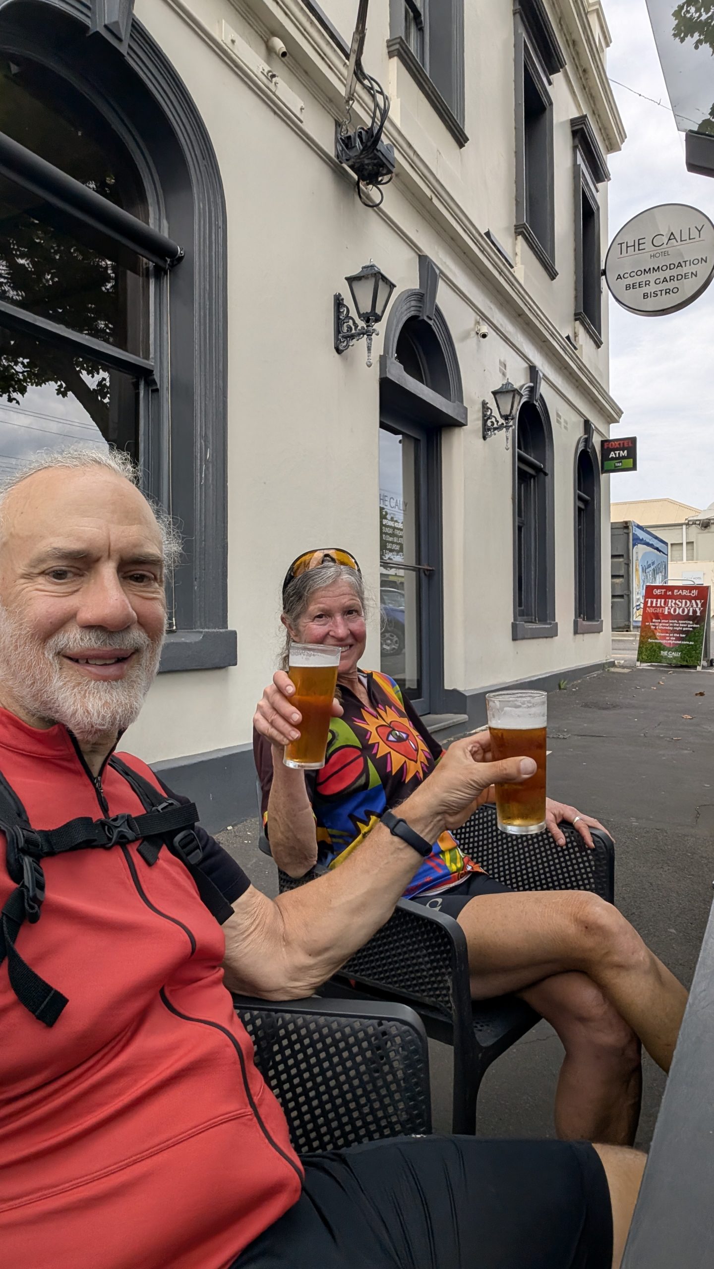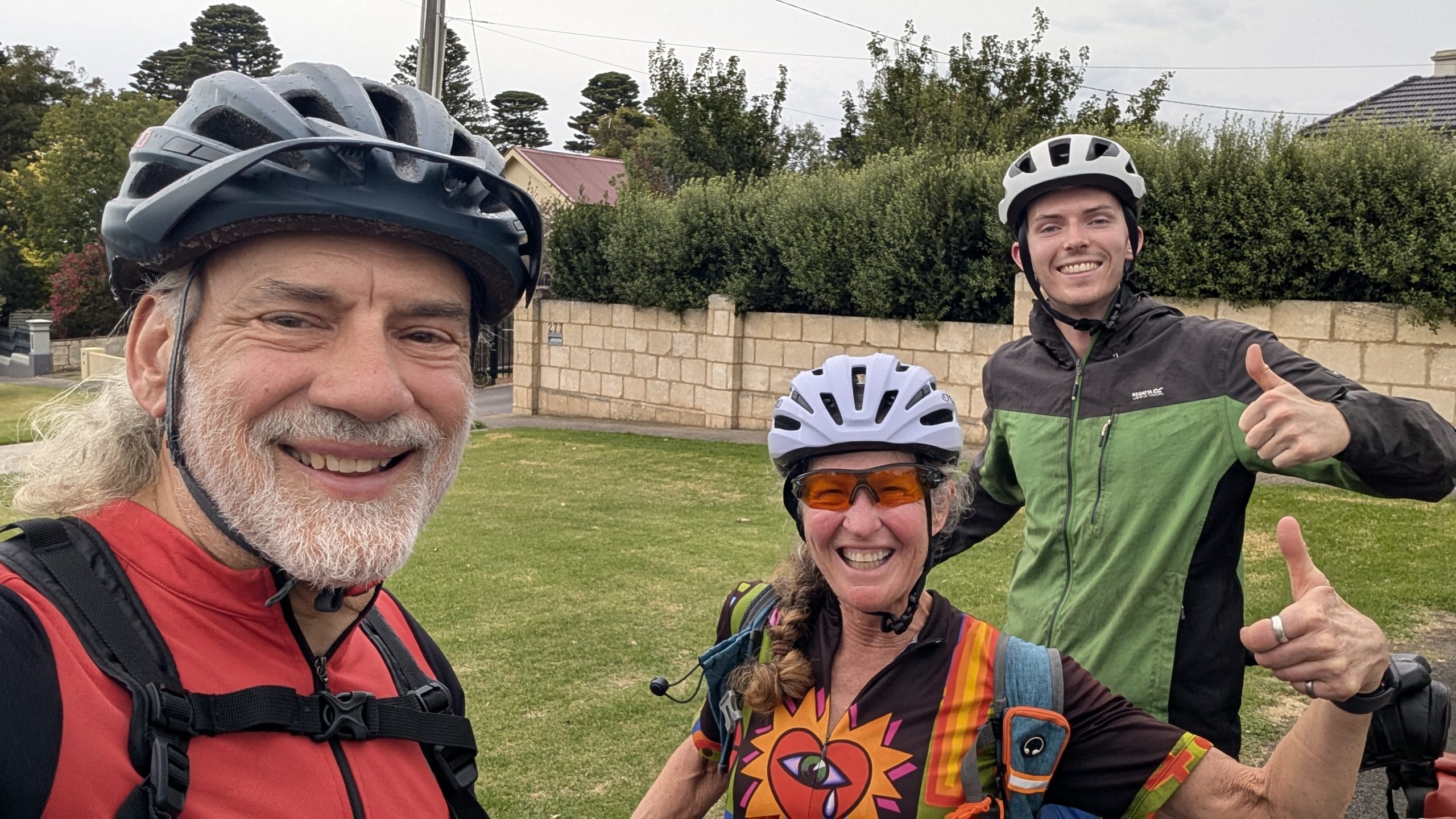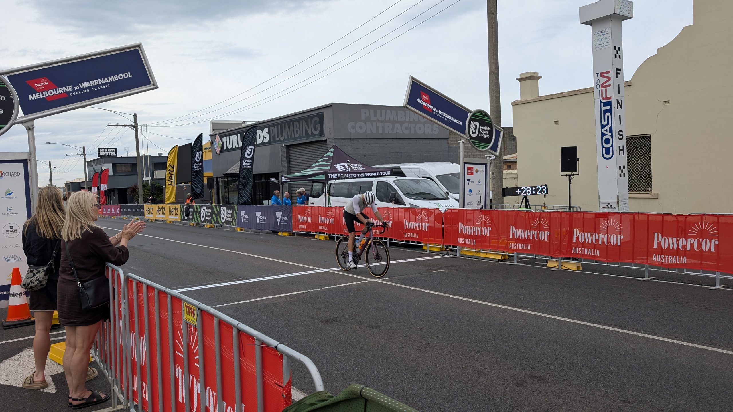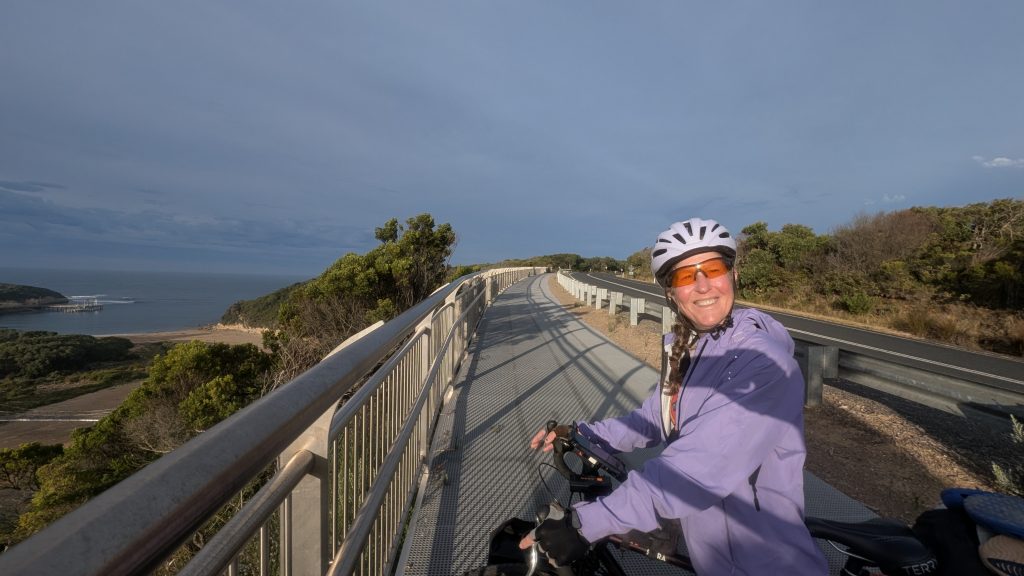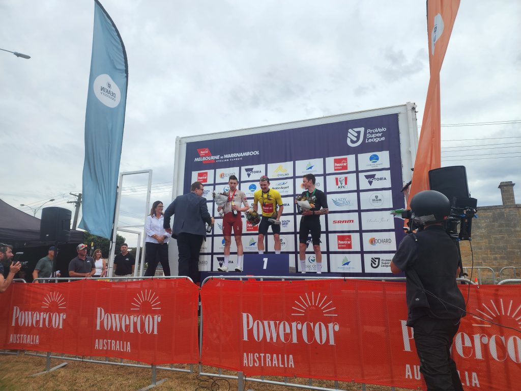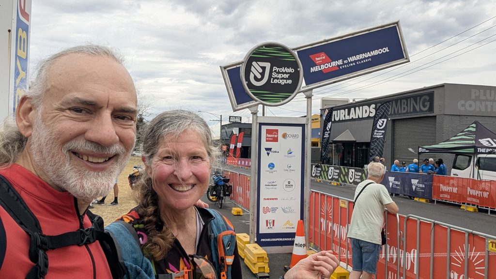 One of the first things we saw was an outdoor store, and I stopped and went in to find some cooking gas. At long last! We also visited the Aldi’s, got some groceries and pretzels – something rather rare in AUS — crisps galore , but very few pretzels. After shopping, we went to what was on the map as a park, but was a sports field. We sat on a bench and made our lunch while watching some teens practice with a rugby ball. After lunch, we headed to the end of the race only to find the men had already finished, and well ahead of the predicted time. 270 km (167 miles) in 5 hours and 45 minutes. 47km/hr (30 mph) average. We were there with our fully loaded touring bikes and attracted a few people who asked what we were doing and I replied that we just did the race from Melbourne to Warrabool, but it took us 5 days! It was cool to see the winners come to the podium, and we promised ourselves we’d be there for the women’s finish tomorrow.