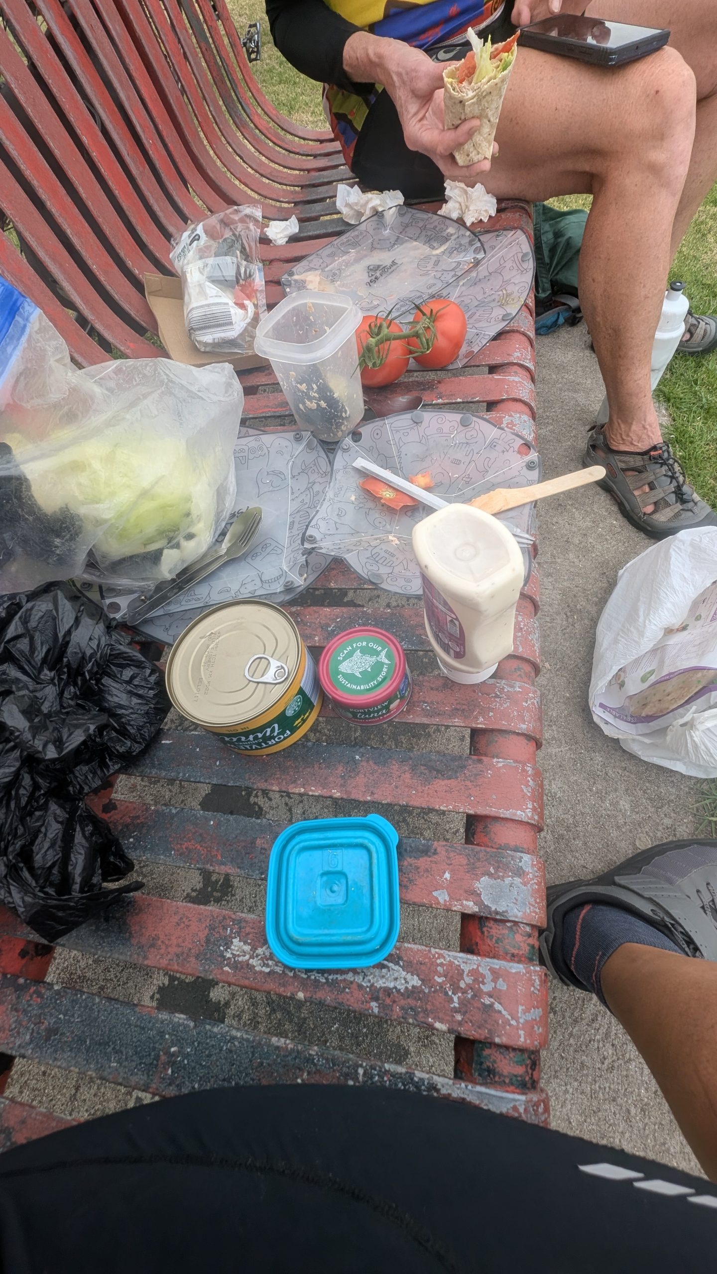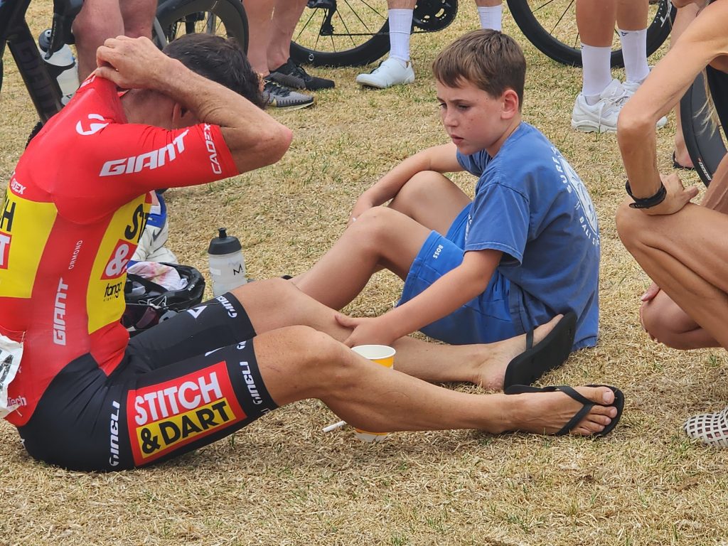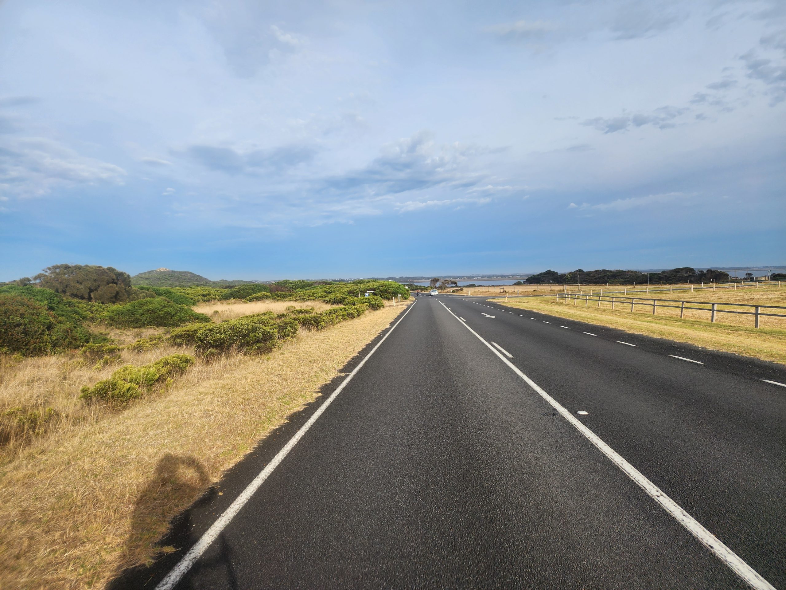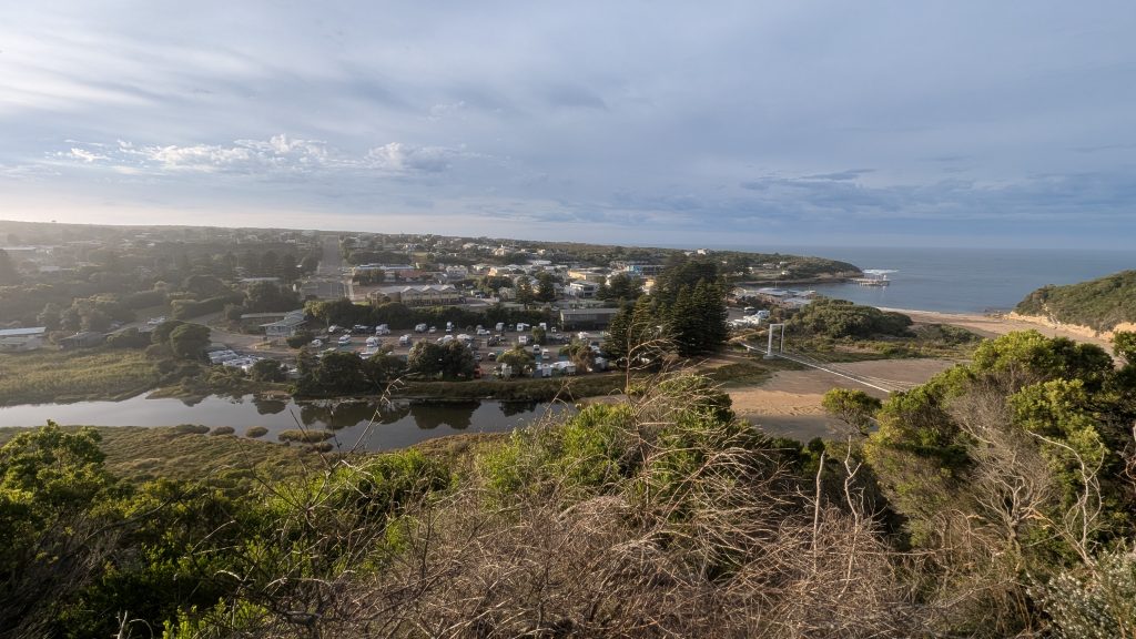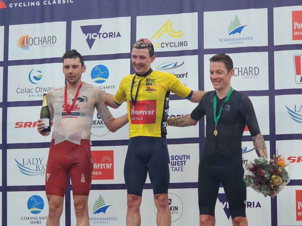 One of the first things we saw was an outdoor store, and I stopped and went in to find some cooking gas. At long last! We also visited the Aldi’s, got some groceries and pretzels – something rather rare in AUS — crisps galore , but very few pretzels. After shopping, we went to what was on the map as a park, but was a sports field. We sat on a bench and made our lunch while watching some teens practice with a rugby ball. After lunch, we headed to the end of the race only to find the men had already finished, and well ahead of the predicted time. 270 km (167 miles) in 5 hours and 45 minutes. 47km/hr (30 mph) average. We were there with our fully loaded touring bikes and attracted a few people who asked what we were doing and I replied that we just did the race from Melbourne to Warrabool, but it took us 5 days! It was cool to see the winners come to the podium, and we promised ourselves we’d be there for the women’s finish tomorrow.