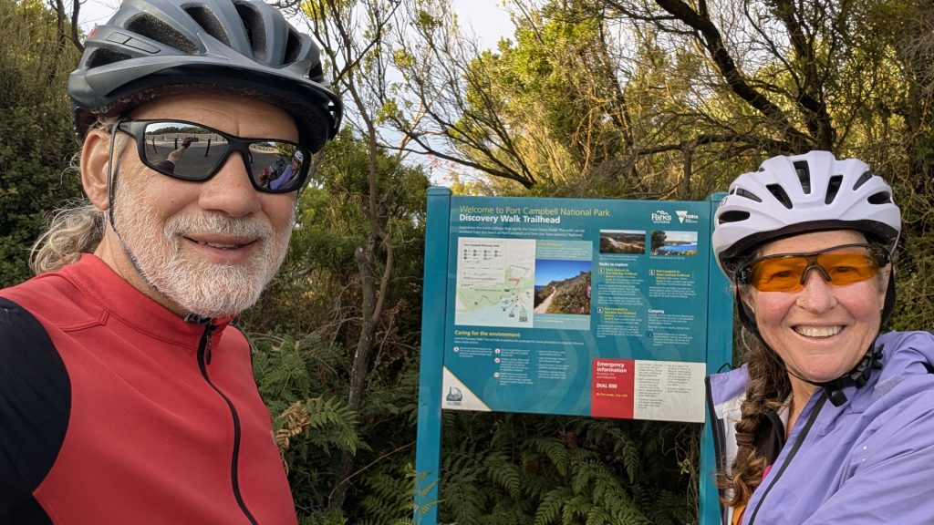 We broke camp pretty early, made some coffee and breakfast and got on our way to Warrnabool and the end of the Great Ocean Road at 8 AM. As it was early Sunday morning, the traffic was light, and the first few miles out of Port Campbell was a brand new bike path which we followed to its end. We never got more than 200′ above sea level. Traffic picked up later, but the roads were great and other than 4 or so miles of a gravel road, we thoroughly enjoyed it.