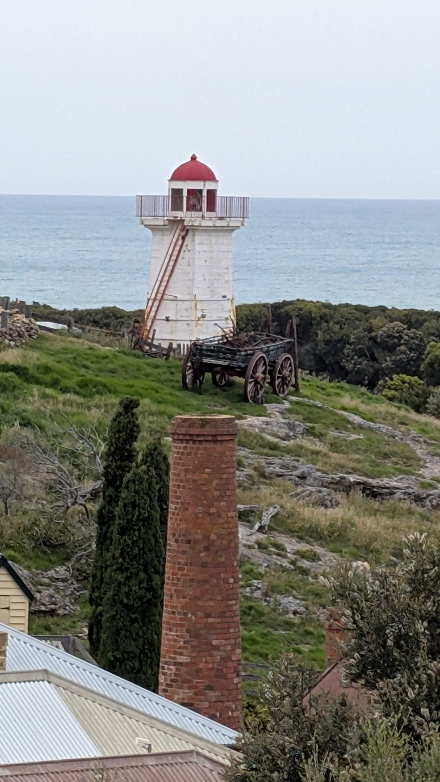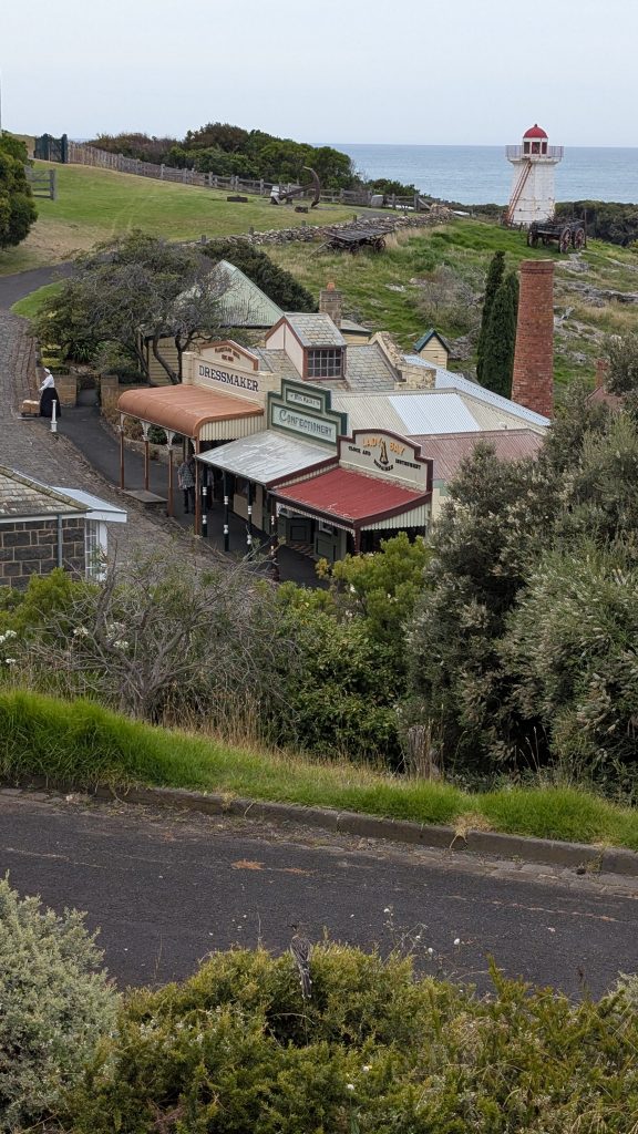 We got into Warrnabool and stopped at the info center which was also at the top of a recreation of a Victorian era fishing village – we got some pics of that, but didn’t visit. We did get a map and some info about the train back to Melbourne which we planned to take tomorrow. On the way in we had seen some markers and posters for a cycling race that was running that day. We found out about that, too — it was the annual Melbourne to Warrnabool race. Saturday, today, was the men’s race, and tomorrow was the women’s. We got an estimate of the finish time and location and headed out to explore Warrnabool.