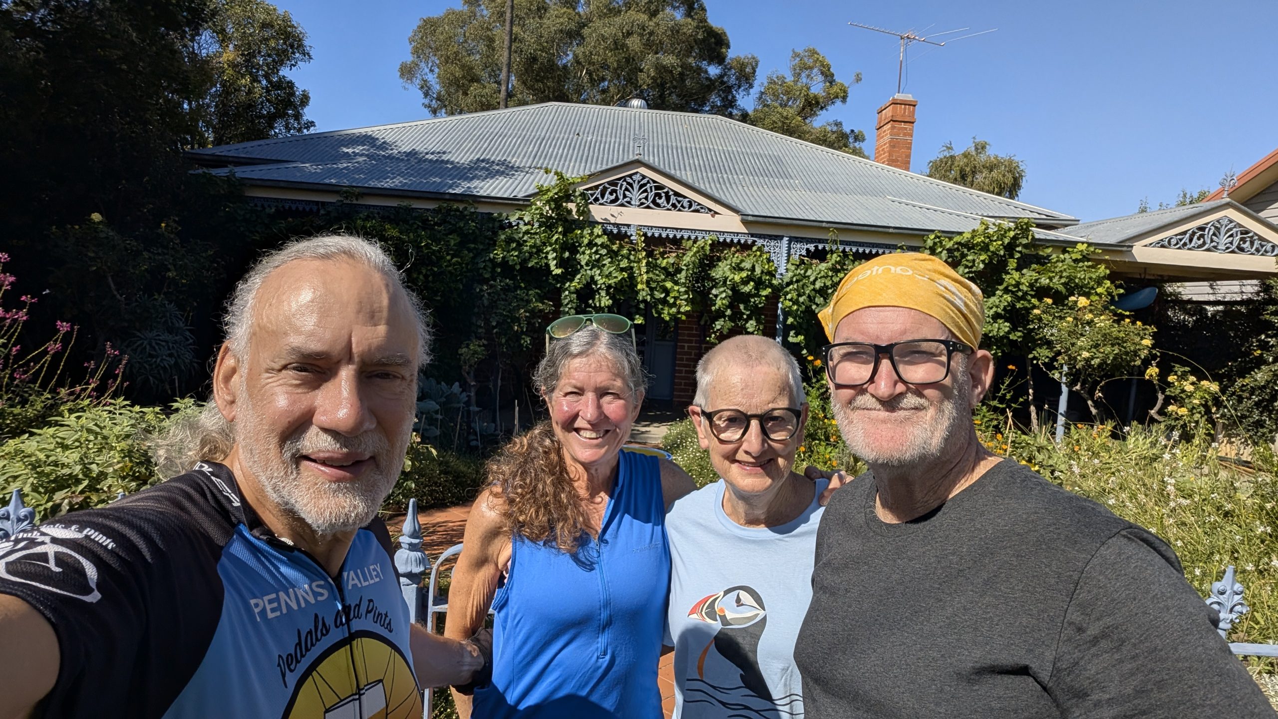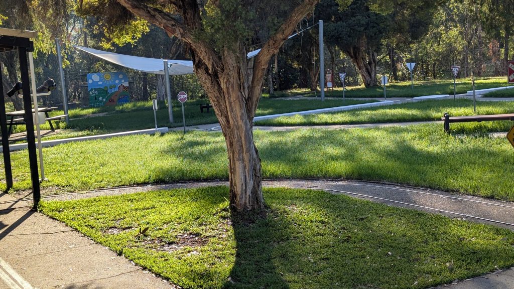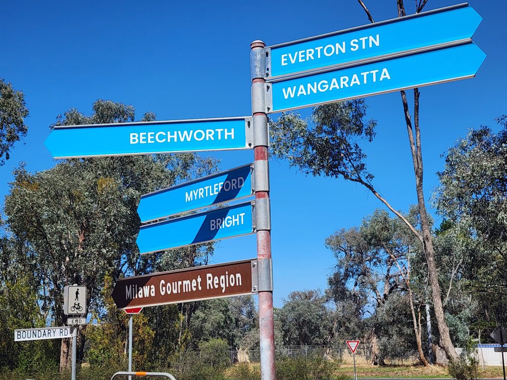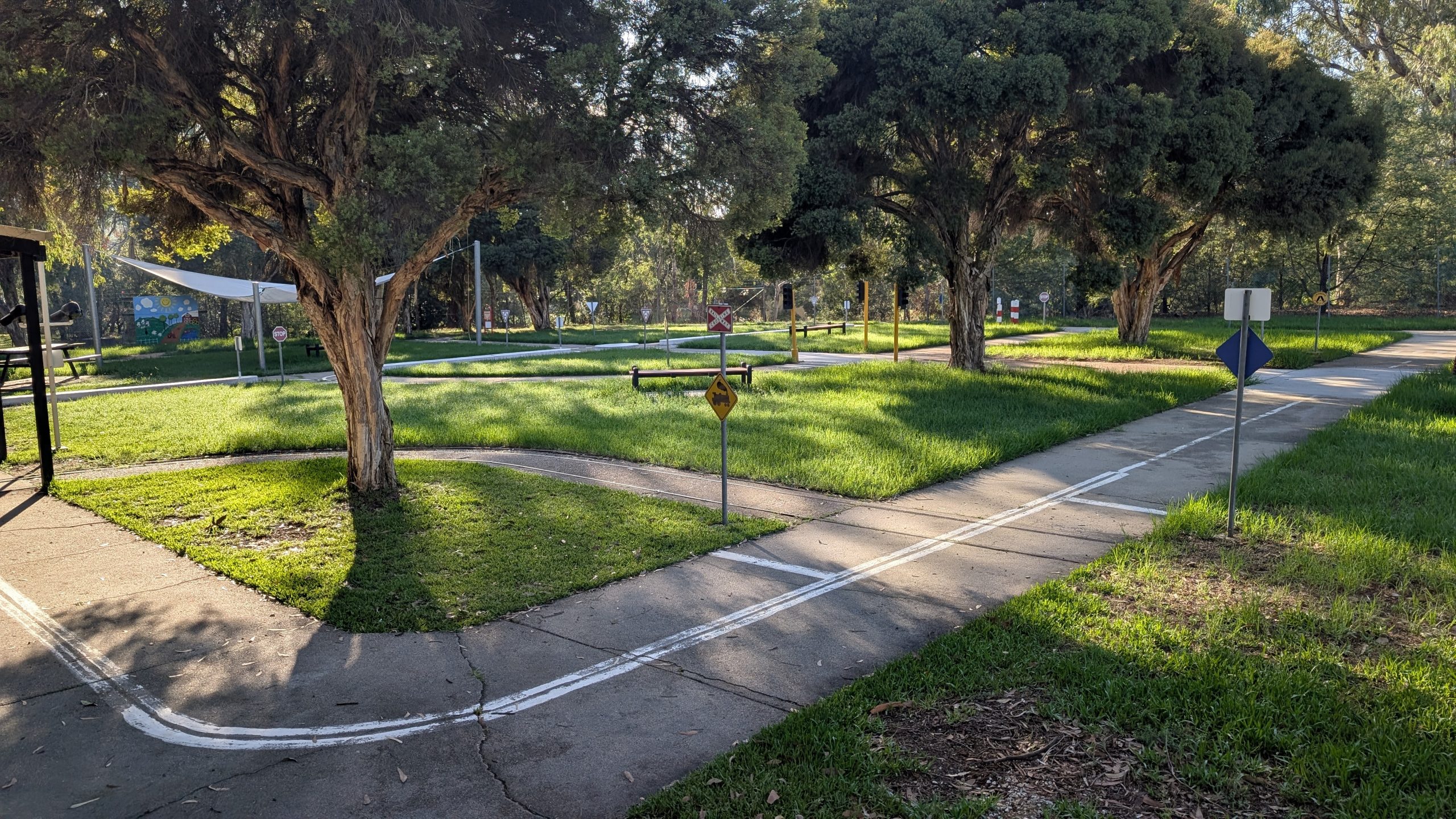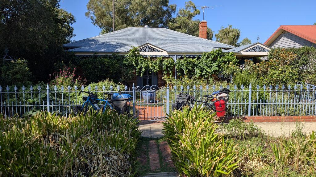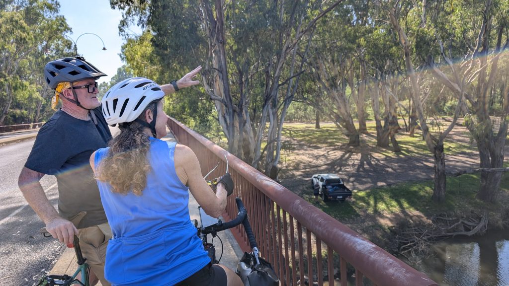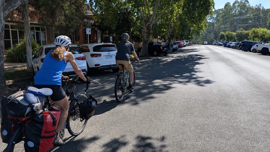 In the morning after a good rest and a hearty breakfast, we took a walk around Ian’s and Prue’s Wangaratta neighborhood. Saw a permanent kids’ bicycle training course, complete with a working railroad crossing. Quite a setup — would be great to have something like that in SC (along with an adult version! 😉 Ian then escorted us out of town on the bike path he suggested we take instead of heading straight north. I was happy because it was on 45 miles vs. the two 75+ days we just had.