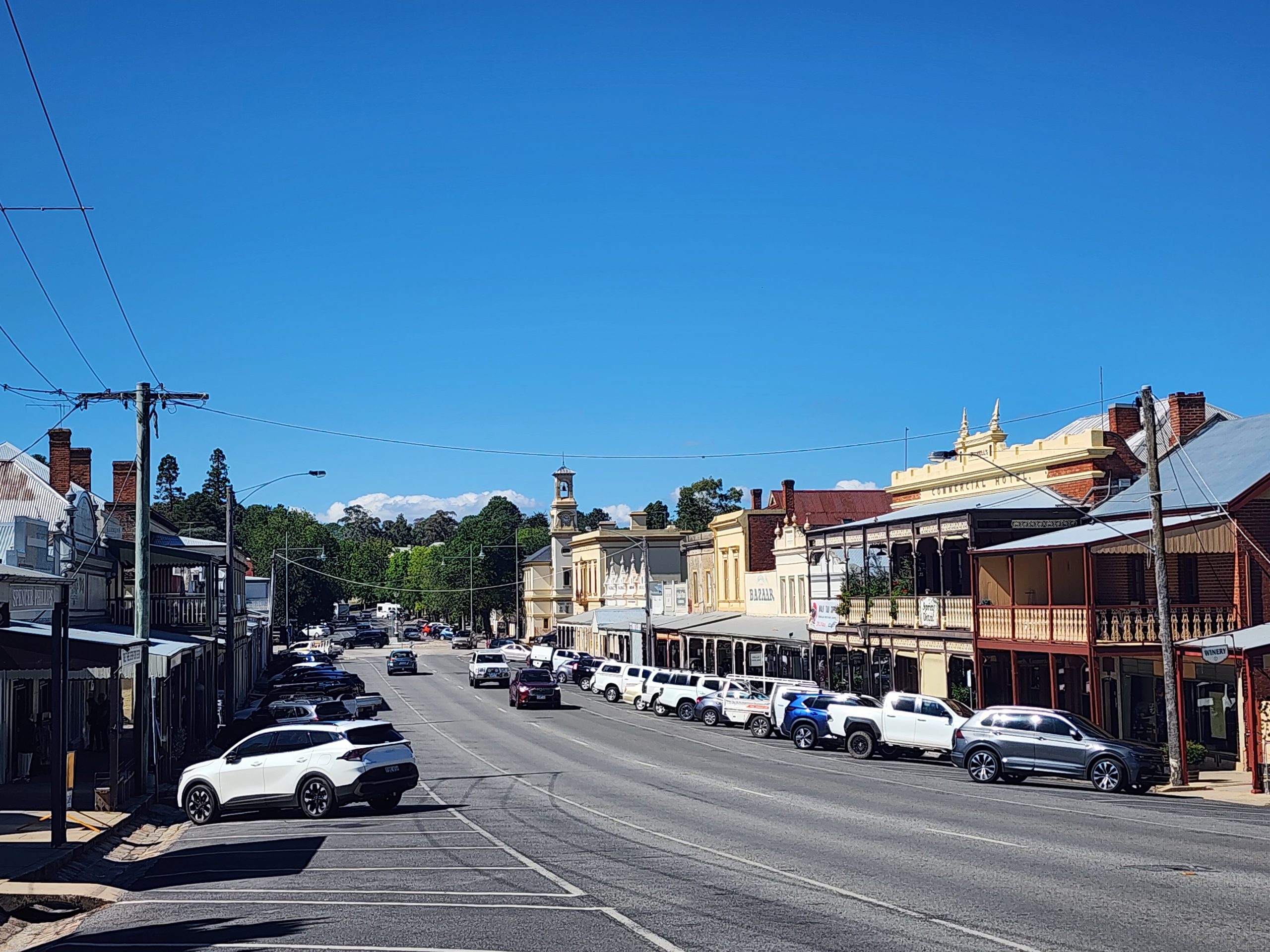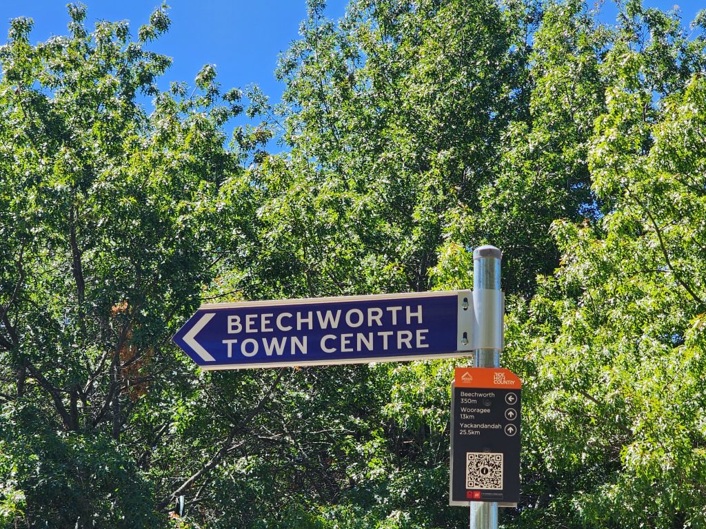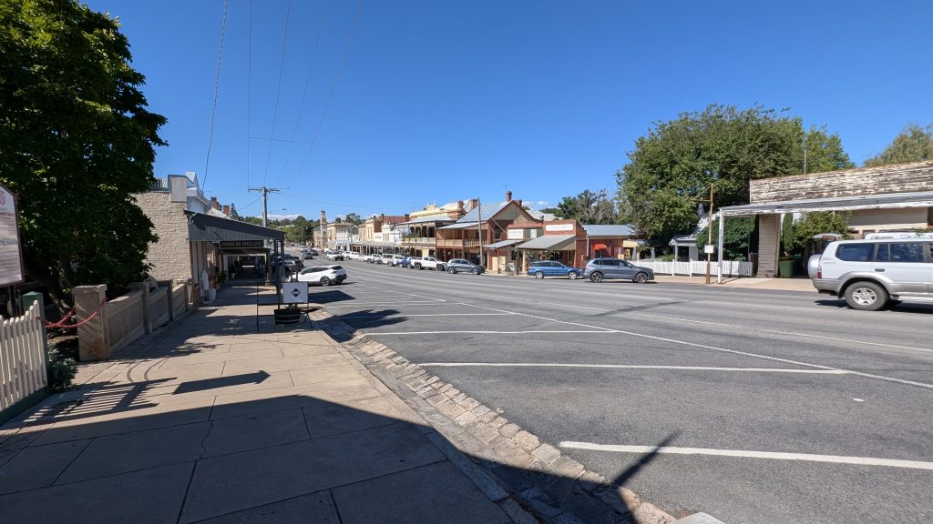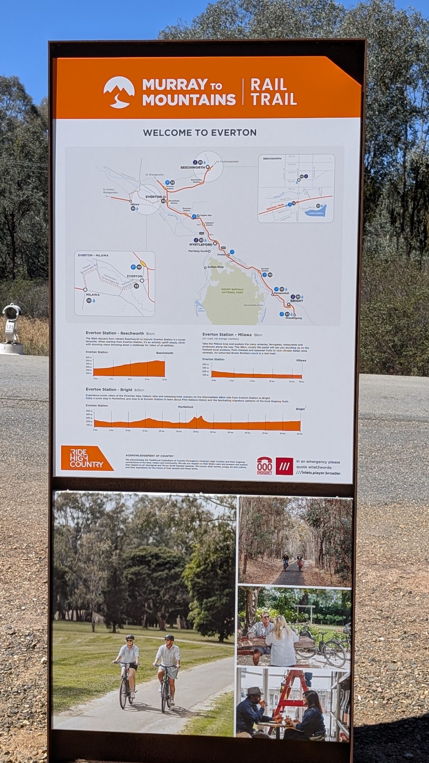 The trail was paved with very few rough sections and the first 12 or so miles were almost completely flat. Then came the climb to Beechworth. We’ve been on longer climbs on rail trails (17 miles on the Mickelson Trail in South Dakota last year for one), but none with these kinds of grades. Add in the heat, and it took me a while to get up to Beechwood. Dana was, as usual, way out in front, and was already scoping out refreshment and lunch spots and making friends in Beechworth by the time I got there.