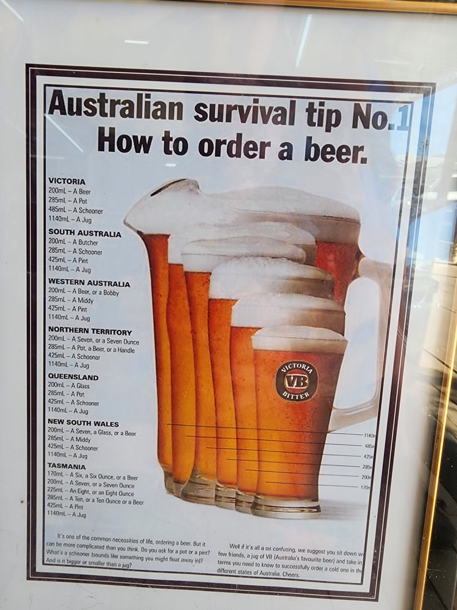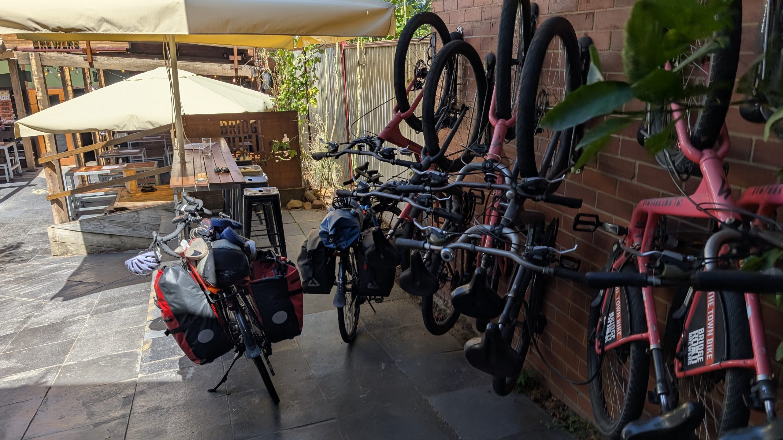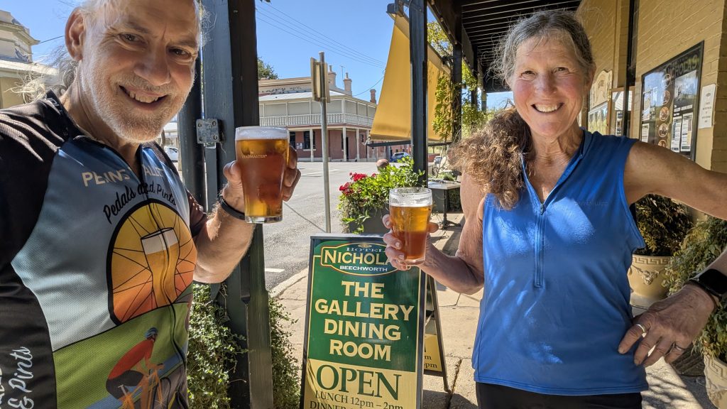 The final push to Yackandandah was much easier than the climb to Beechwood. We soon found the Yack (remember, Aussies shorten EVERYTHING). We had a couple of beers and received tickets for another Aussie tradition — a raffle every Friday at many of the bars. If you “won” this one, you got to pick a playing card off the wall and if it was the Jack of Diamonds, you won the pot for the week. I think this one was a couple thousand dollars. We didn’t win, and the person who did, didn’t get the Jack, so it all went to next week’s pot.