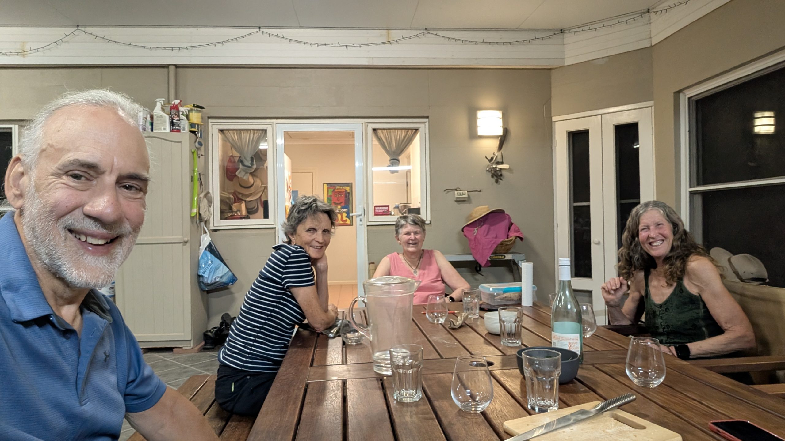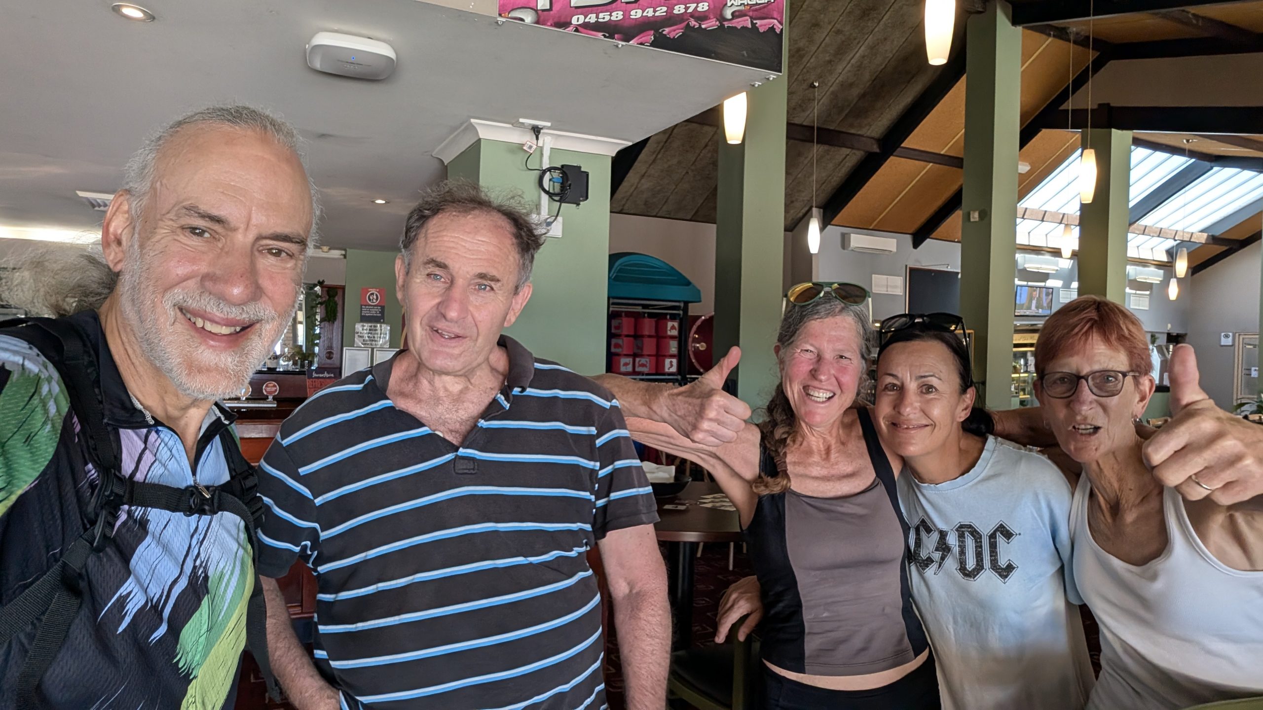Close to Wagga, we stumbled on an afternoon happy hour at the Tolland Hotel. More of a casino than anything else, there were folks drinking, eating, and watching horse races and sporting events — and we assume — gambling on the outcomes. It was a hot day and the beers were a welcome breake. Dana struck up a conversation with a group of folks outside, and later we ran into them again inside (it was a pretty spacious place). We got a quick selfie with them and headed out to explore more of Wagga before heading to Ian’s and Janet’s.
