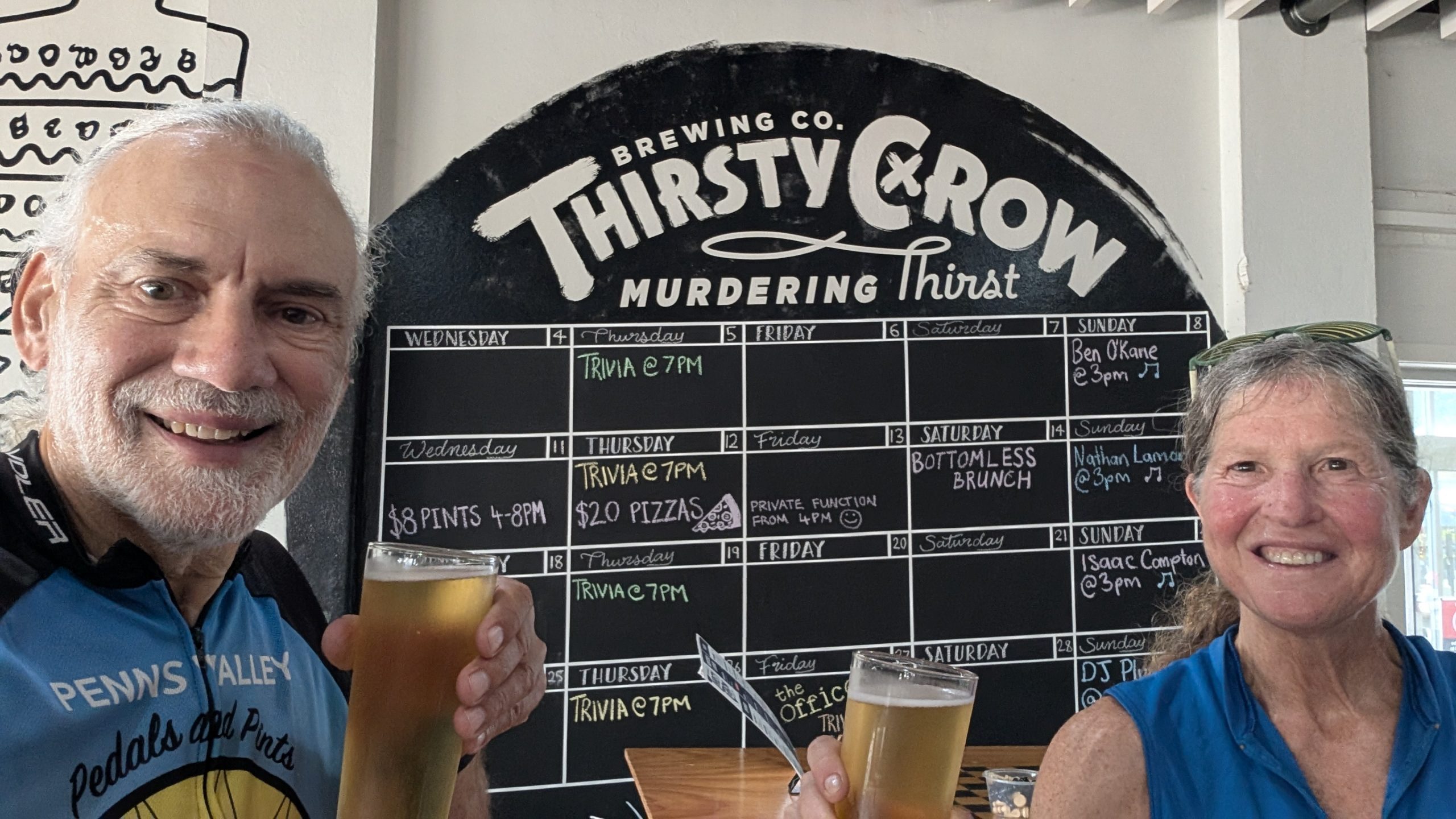 I don’t remember much about this day, and that’s a good thing. Means I was resting and not riding a 100 km or anything. Dana and I did go back into town on the bike trail and did some shopping for groceries for our ride tomorrow. We also stopped at the Thirsty Crow and listened to the live music that was being played only for us and the staff. No one else in the bar on this Sunday afternoon. We felt bad for the performer, but later learned that he’s a lawyer, and he does bar singing (very well, btw) to get out of his lawyer head and maintain his sanity.