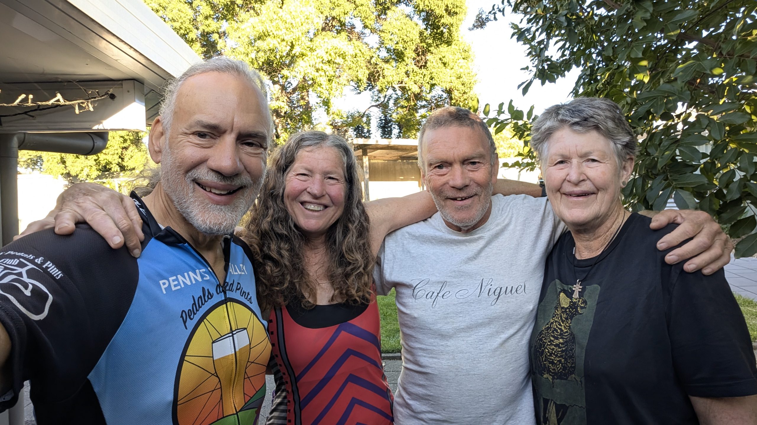 We then rode to our hosts for the night, Anne-Maree and David, and their beautiful home in a nearby neighborhood. David is semi-retired from the real estate business, and they both work with/for a bicycle touring company – Ride and Seek. They’ve been all over the world and in 2027 will be supporting a Sydney-Hobart ride — David riding sag, and Anne doing the meals and logistics. They also have a rescue pup — can’t remember his name — but he was quite shy and though he warmed up to us enough to stop barking, he still shied away when approached. We had a lovely meal and bevees (another Aussie abbreviation) and headed to bed. David and Anne were leaving at 5 am to go to the French embassy/consulate in Sydney to get their visas for an upcoming trip with Ride and Seek. Apparently, you have to show up in person to get a visa for France. Both NZ’s and Australia’s procedures were pretty painless — scan your passport, pay your fee, and you’re in.