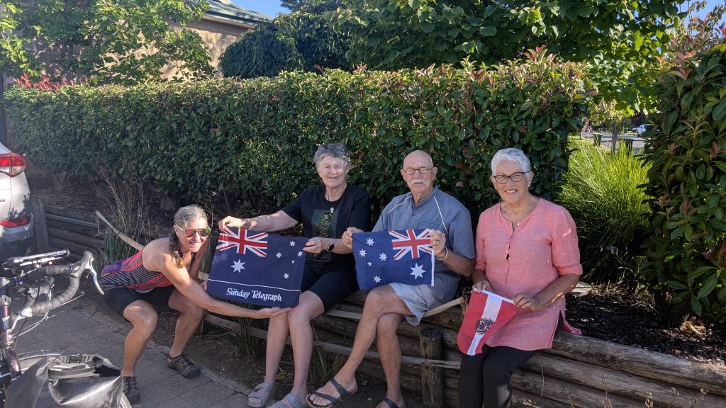 Janet’s neighbor Max came over at breakfast and we chatted with him a while. His wife Crista (originally from Austria) joined us in the driveway and we chatted a while and Max brought flags to wave as we started off for Coota-bloody-mundra.