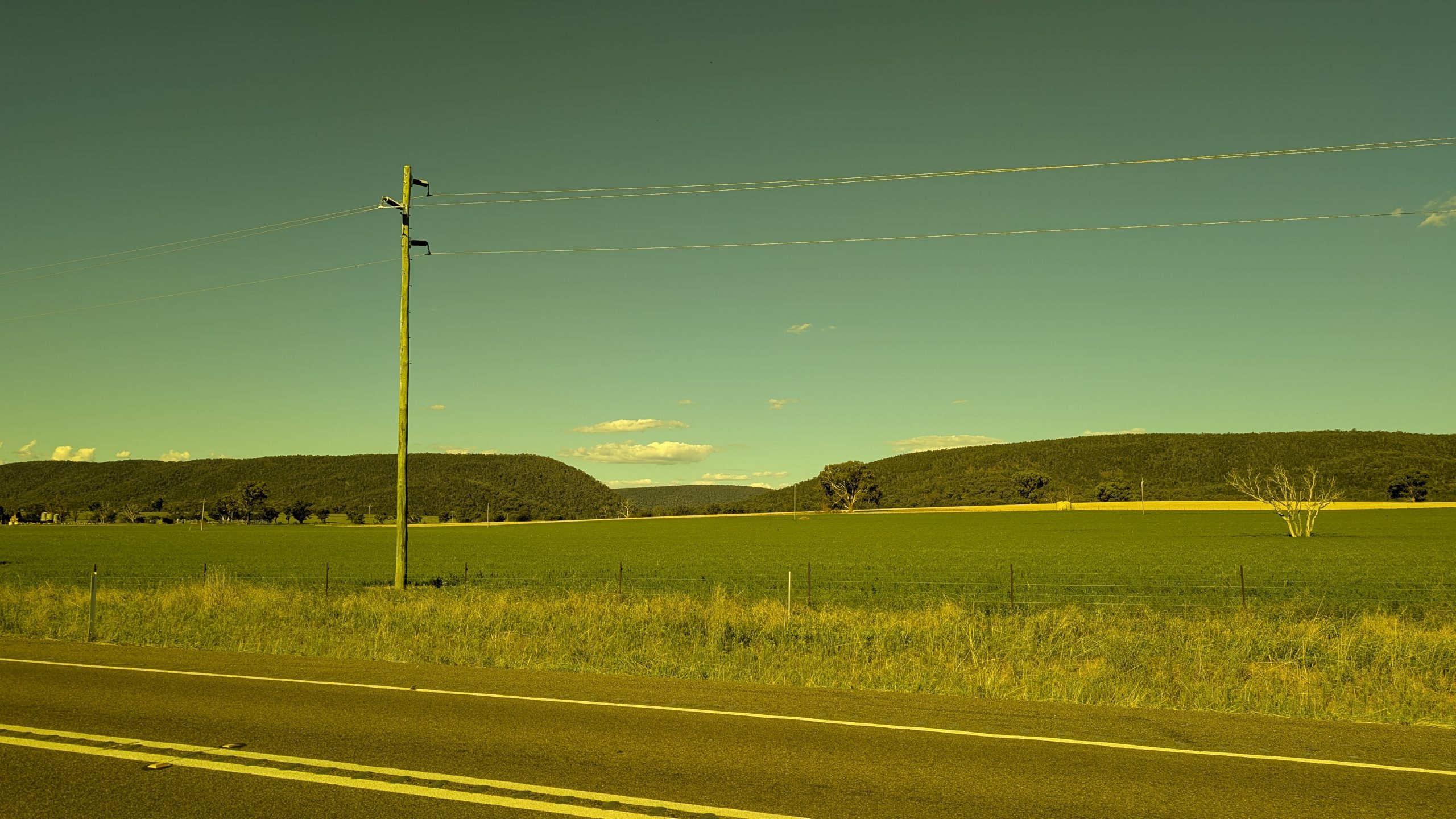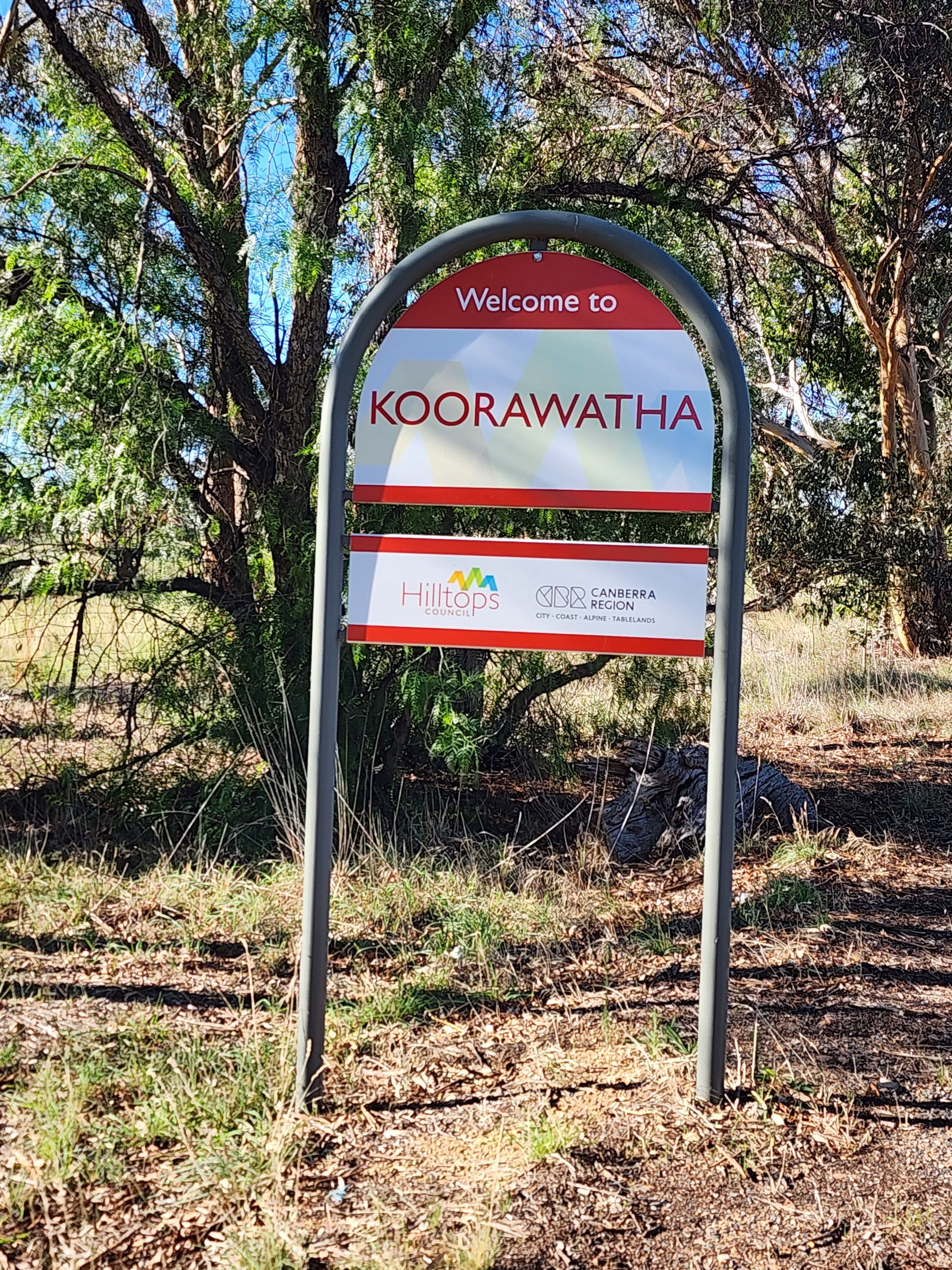 It was a pretty hot day and we took the back road out of Coota-bloody-mundra heading north and then northeast. We lunched at Young — first Woolworths for a coke and some lunch supplies, then a park where we used the ubiquitous public restrooms, and then to Aldi’s to get supplies for camping since there were any stores where we were heading.