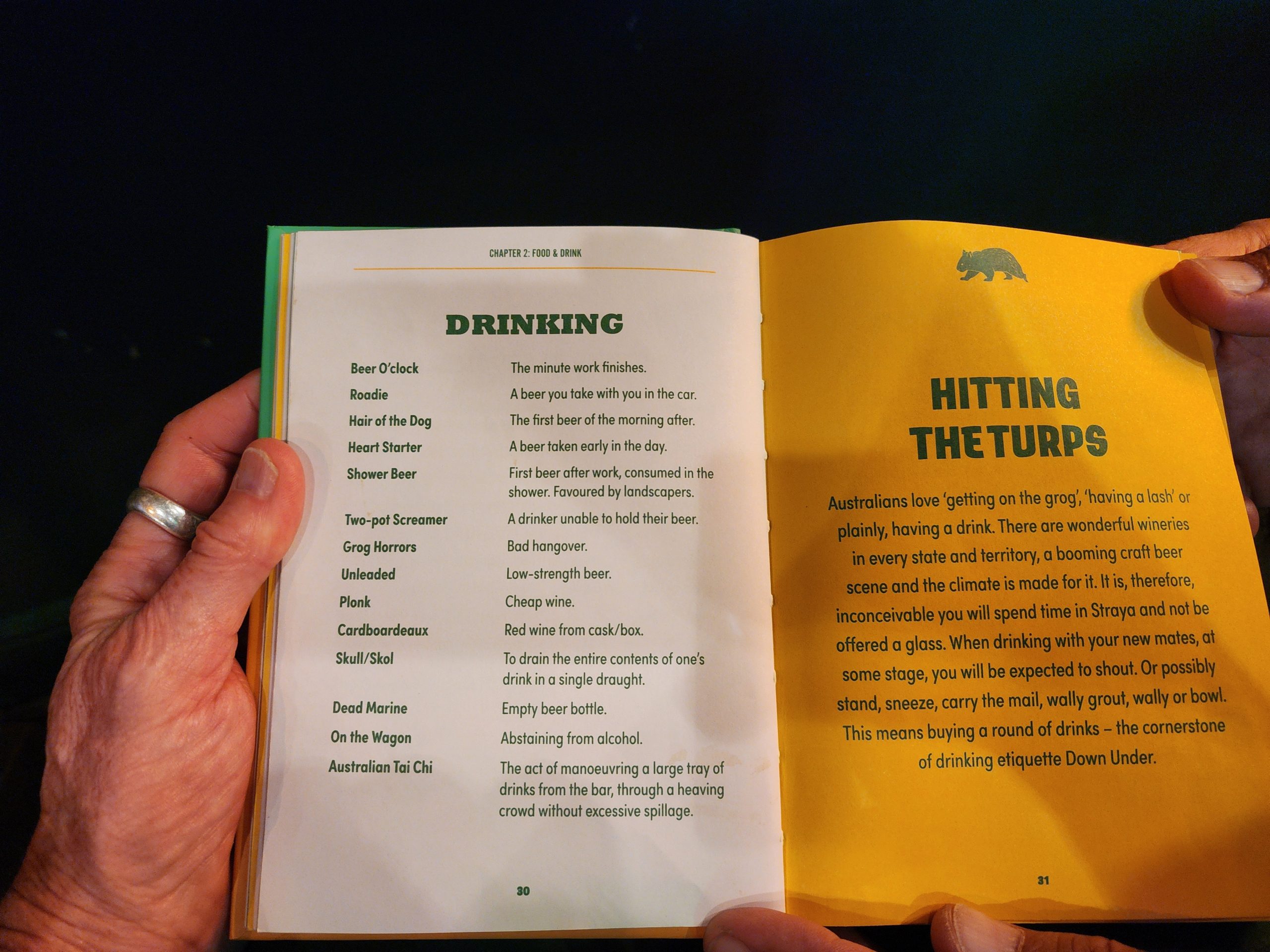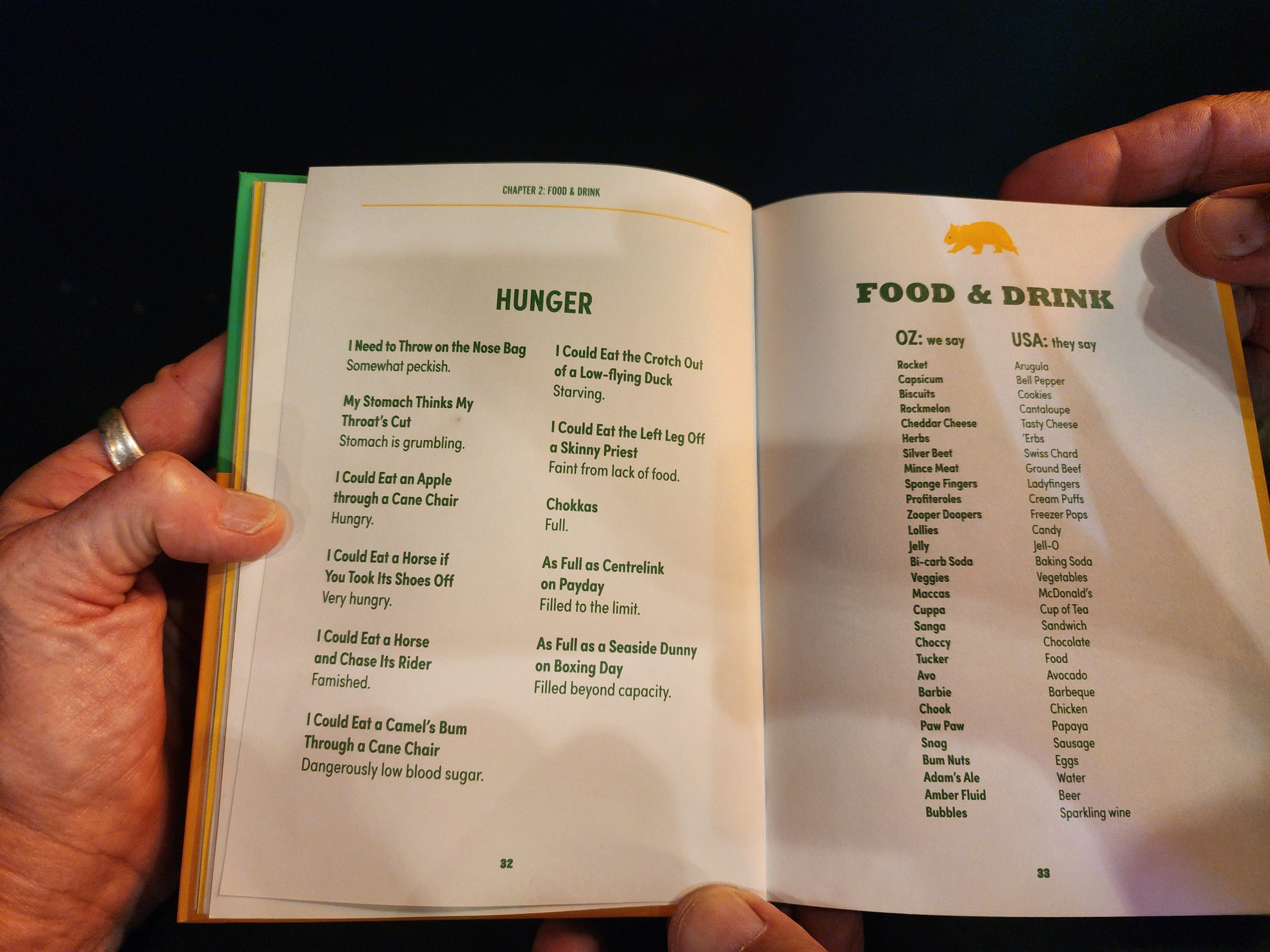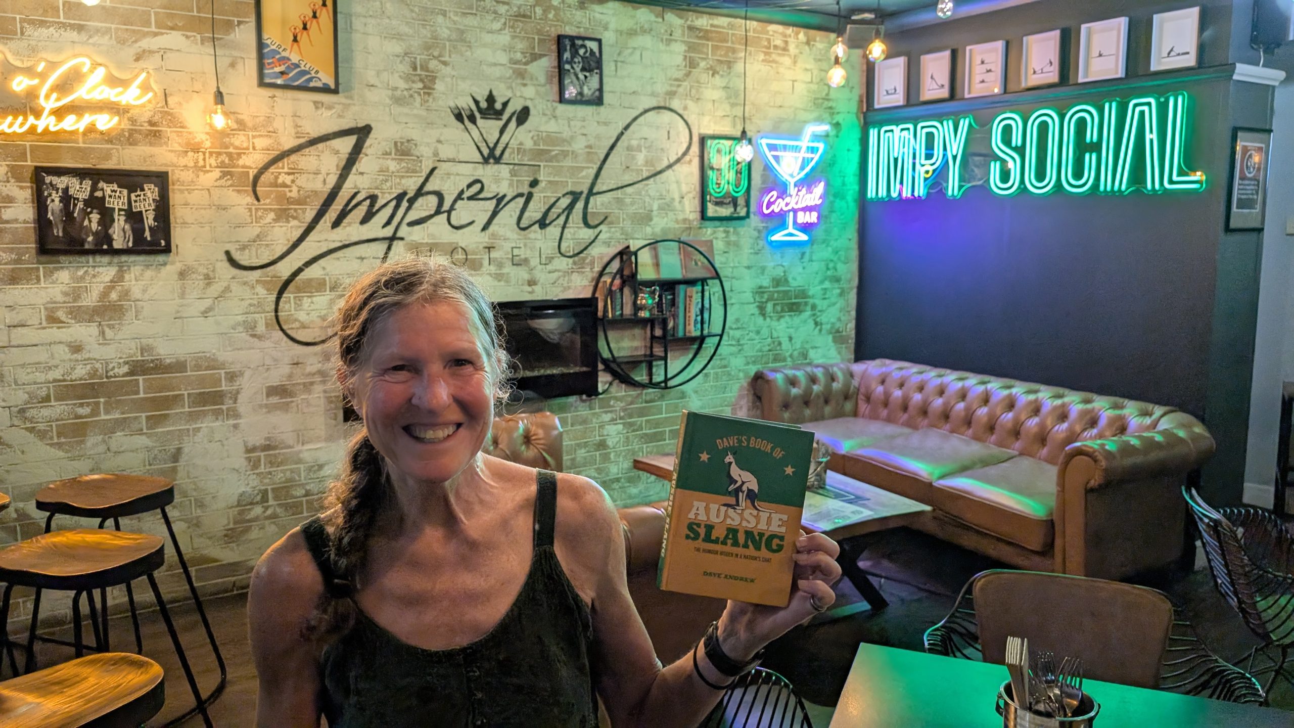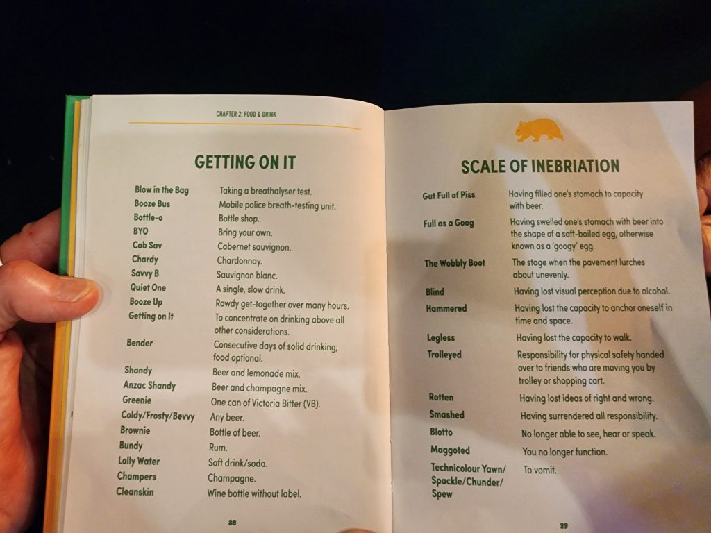 Our room was just a shade above the Cowra Hotel’s offerings, but it was clean, cool, and we were tired after the long day. We had a couple of beers at the Imperial Hotel where we found a book on Aussie Slang. Perfect entertainment while we drank our beers. We tried to find it on Amazon, but it was out-of-print, so we just took some pics, included for your reading pleasure below. Back at our hotel, we made dinner with our camping food, and settled in for a needed rest.