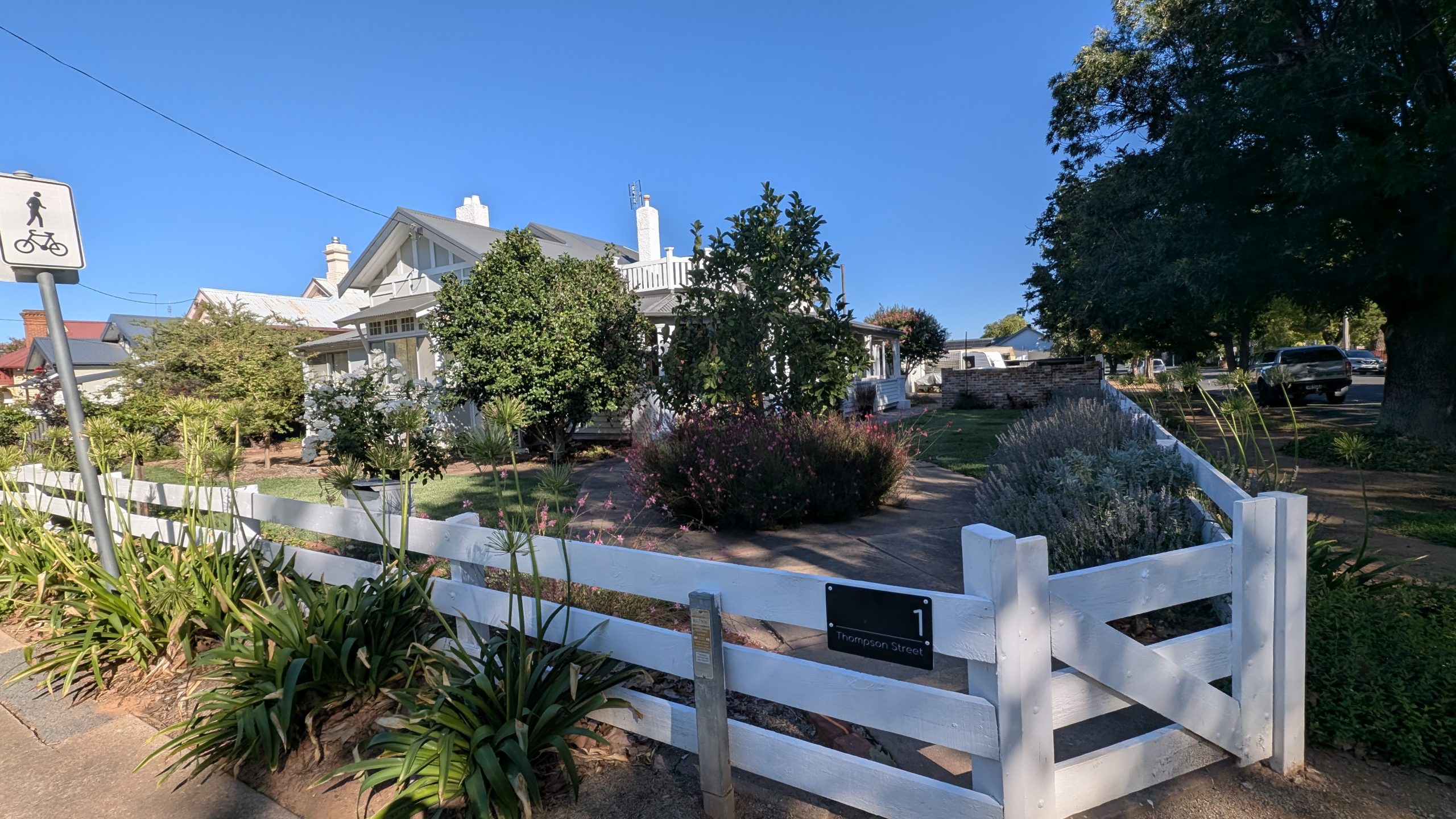 Anne and David were long gone by the time we got up. We got the instructions for closing up and taking care of the dog from them last night. Dana tried to take the dog for a walk, but he was having none of it. We made our breakfast and tried to make friends, but he was very recalcitrant. I pumped all the tires up with David’s real pump and off we went toward our next destination, a hotel/campground in Koorawatha.