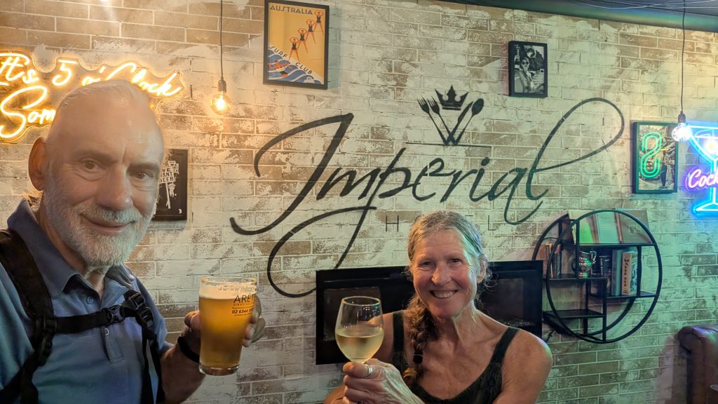 Flat is my groove, and I was, for once, ahead and the first to get to the town. As it was almost dark and there weren’t any indication of campgrounds nearby, I started scoping out hotels. I first landed at the Cowra Hotel, which was pretty much a 1-star. Shared bath, small rooms on the 2nd floor. They did have a bar and I bought a couple of cans as Dana was close on my heels. When she got there, we downed the beers, had a chat with a young girl on a e-scooter who was visiting her dad (who could apparently only afford the 1-star place). She was quite amazed that we rode that far. I made a reservation with Booking.com at the Townhouse motel; much better ratings and just up the street. Dana found a bar/restaurant right across the street from there. I checked in, only to find the reservation never went through, a first, and ended up just getting the room anyway (without the booking.com discounts!).