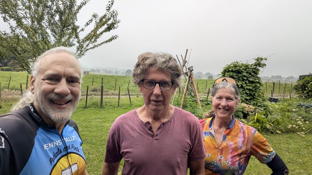 The ride up to Marin’s was short, but mostly uphill. The major hills we climbed were two days behind us so it wasn’t so terrible, and we soon met Marin and her husband John on their farm, Marin holding the reins of their newest horse. John showed us to our cabin — where their son had stayed before he left for college and a career in Mechatronics Engineering. Cozy spot with a great view, John pointing out the different mountains we could see from the balcony (one covered in clouds unfortunately).
