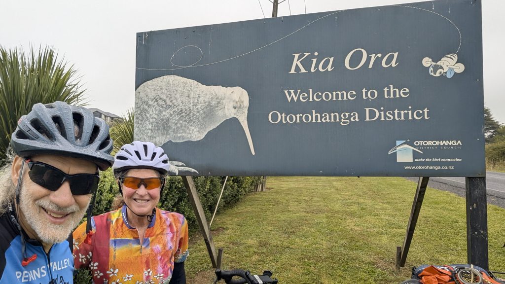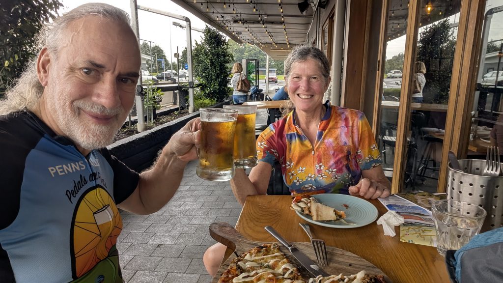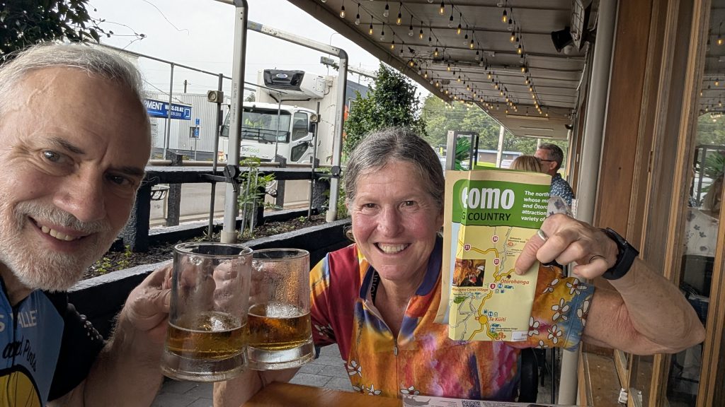 The short 30 mile ride to our next stop in Otorohanga was along quiet country roads. The town itself was quiet and cute and we stopped in the local information center and were helped by a nice woman named Sis who loaded us up with brochures for cycling trips and the Waitomo Caves, which were the reason we had headed this way. After a quick stop at Walgreens (pharmacy AND full grocery store in NZ), we took the brochures and headed to The Thirsty Weta for a couple of beers and some pizza. It soon started raining and I sent a note to our Warmshowers host Marin with an ETA after the rain stopped.