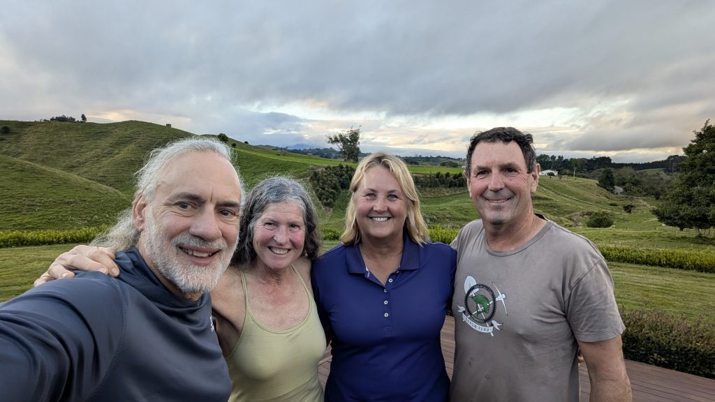 We got settled and cleaned up and joined John and Marin for a lively discussion of their farm and how it’s now run as a “Share Farm” – owners bring their cows to them for care/feeding/milking and split the profits. Their house had a picture window the size of the room looking out over the farm and the spectacular view, including a deer farm across the road. Marin & John had done a guided bicycle tour in Kenya and Tanzania and we wanted to pick their brains about that. They delightedly related their experiences there and in Thailand and more.