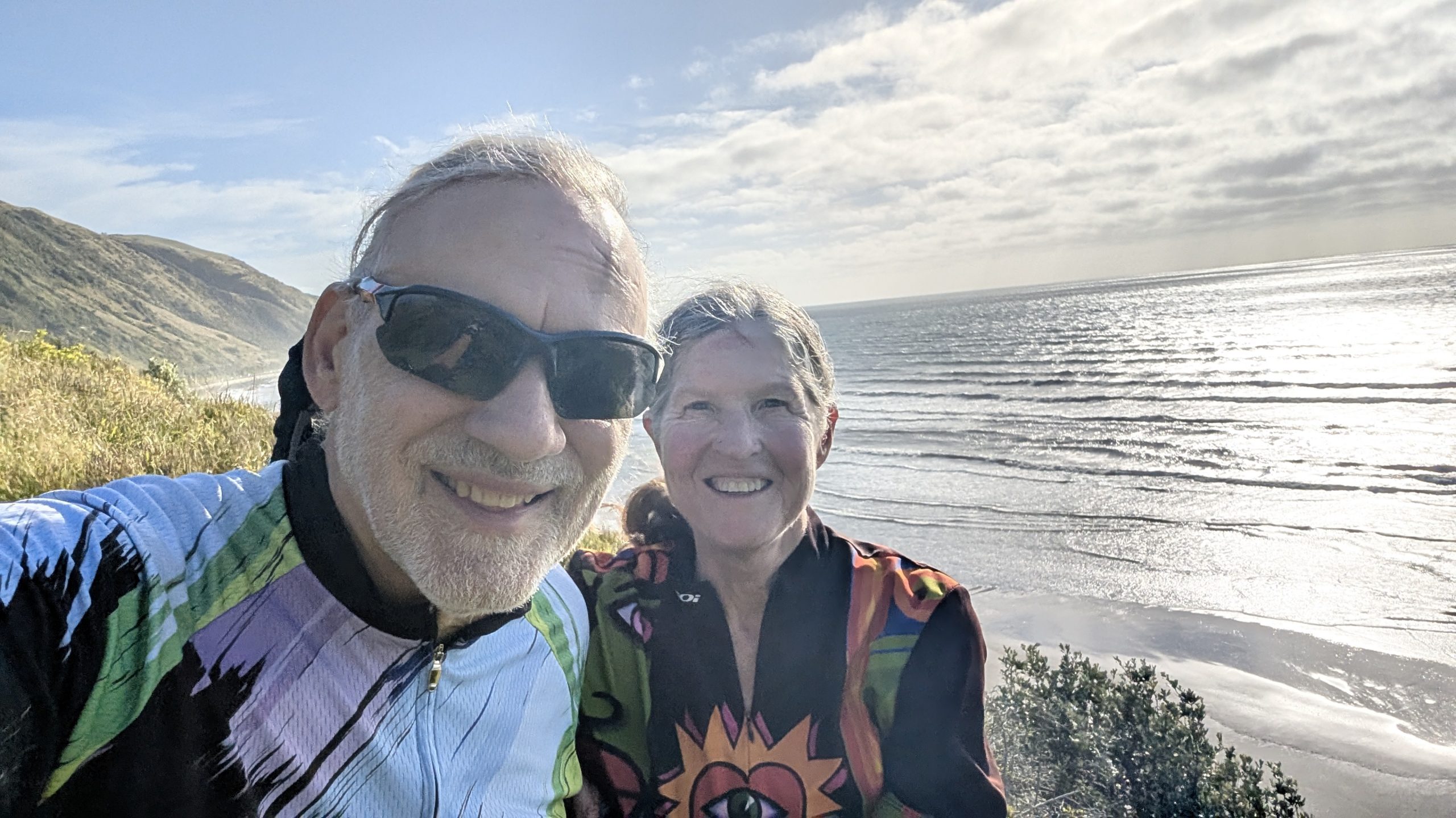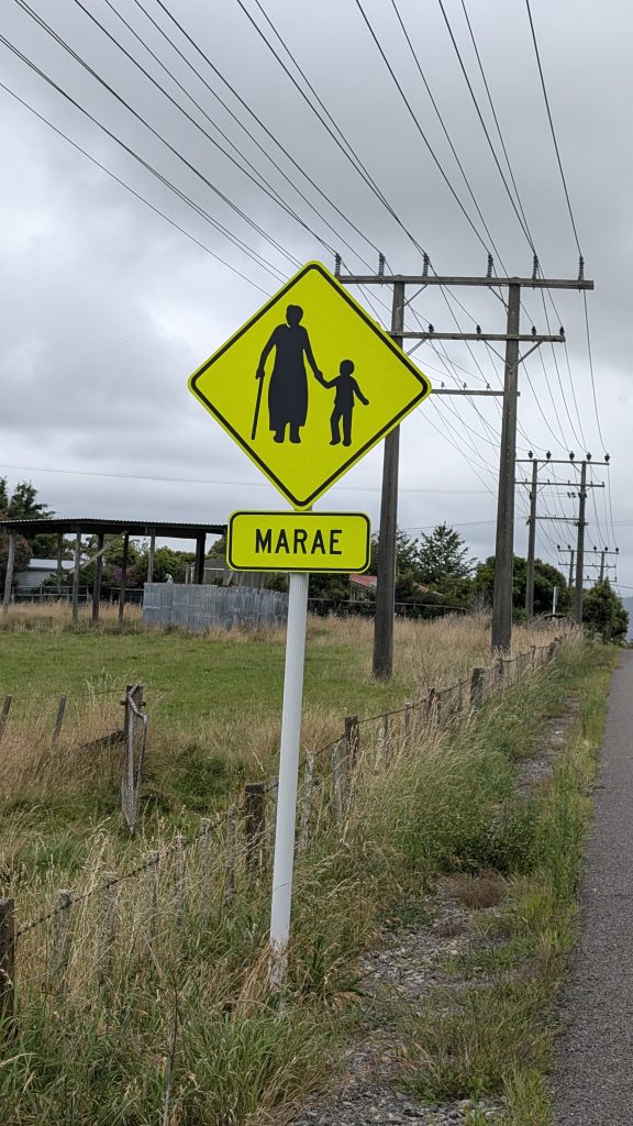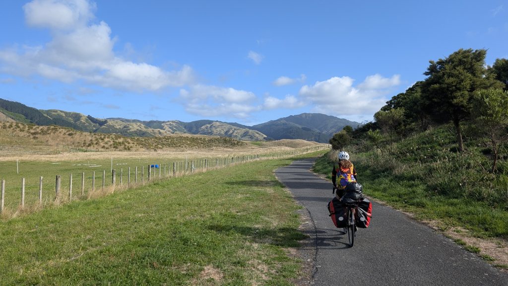 The end of day took us to Catherine’s and Dylan’s, a Kiwi couple in their 30s, our Warmshowers hosts for the night. They were so kind as to host us even though they had another guest, Butch from the UK, staying with them. They also had a rescue Greyhound named Sponge. Dylan was a wealth of information about everything from gold mining to the Maori language — truly a Renaissance man (and he builds his bikes himself), and Catherine was equally astute. We chatted over a wonderful meal of Dahl & rice, and heard their touring stories and learned that Butch toured the world working Burning Man festivals. Quite an interesting evening and at the end we slept in the living room on very comfortable cushions in our sleeping bags.
