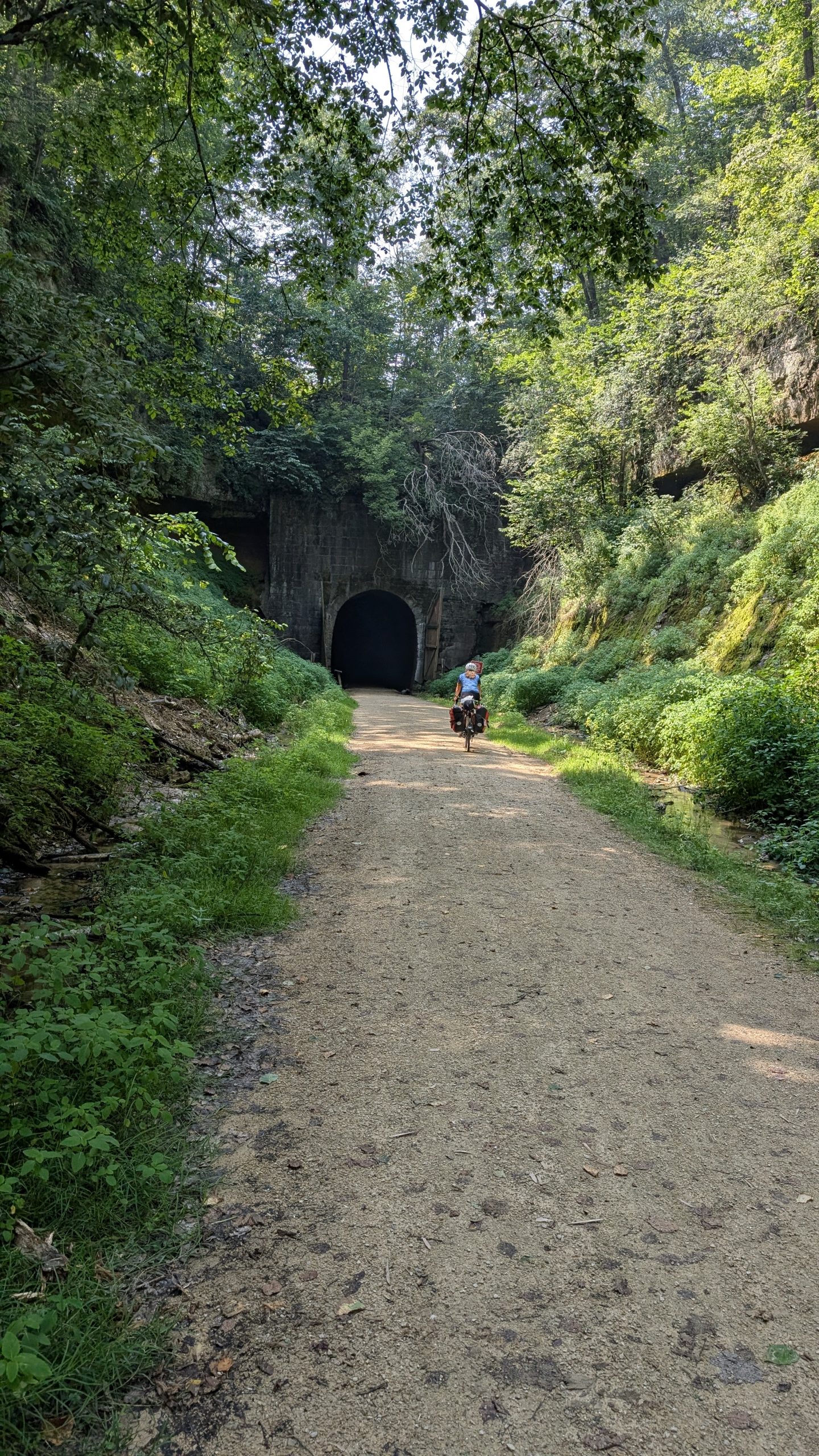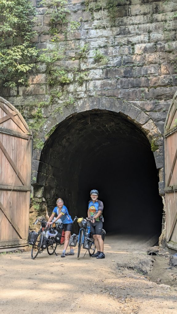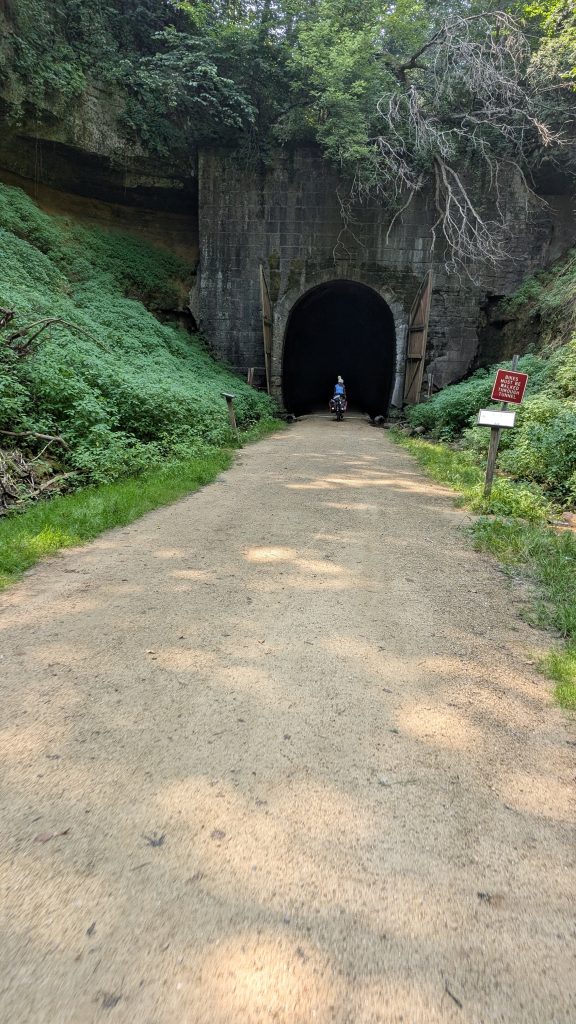 But before all that fun, we had a good, early, start with breakfast in the hotel, and only about a mile to cover to get to the trail. The trail itself was a nice hard-packed surface (stone/sand/dirt) and dry considering the rains of yesterday. Trails are great, but they do get monotonous after a while and Dana wanted to get on the highway that paralleled the trail. At least for a while. The trail had three tunnels, and when the first was coming up, I caught up to Dana on the road and pointed out that the trail was to our left and there was a big hill coming up.