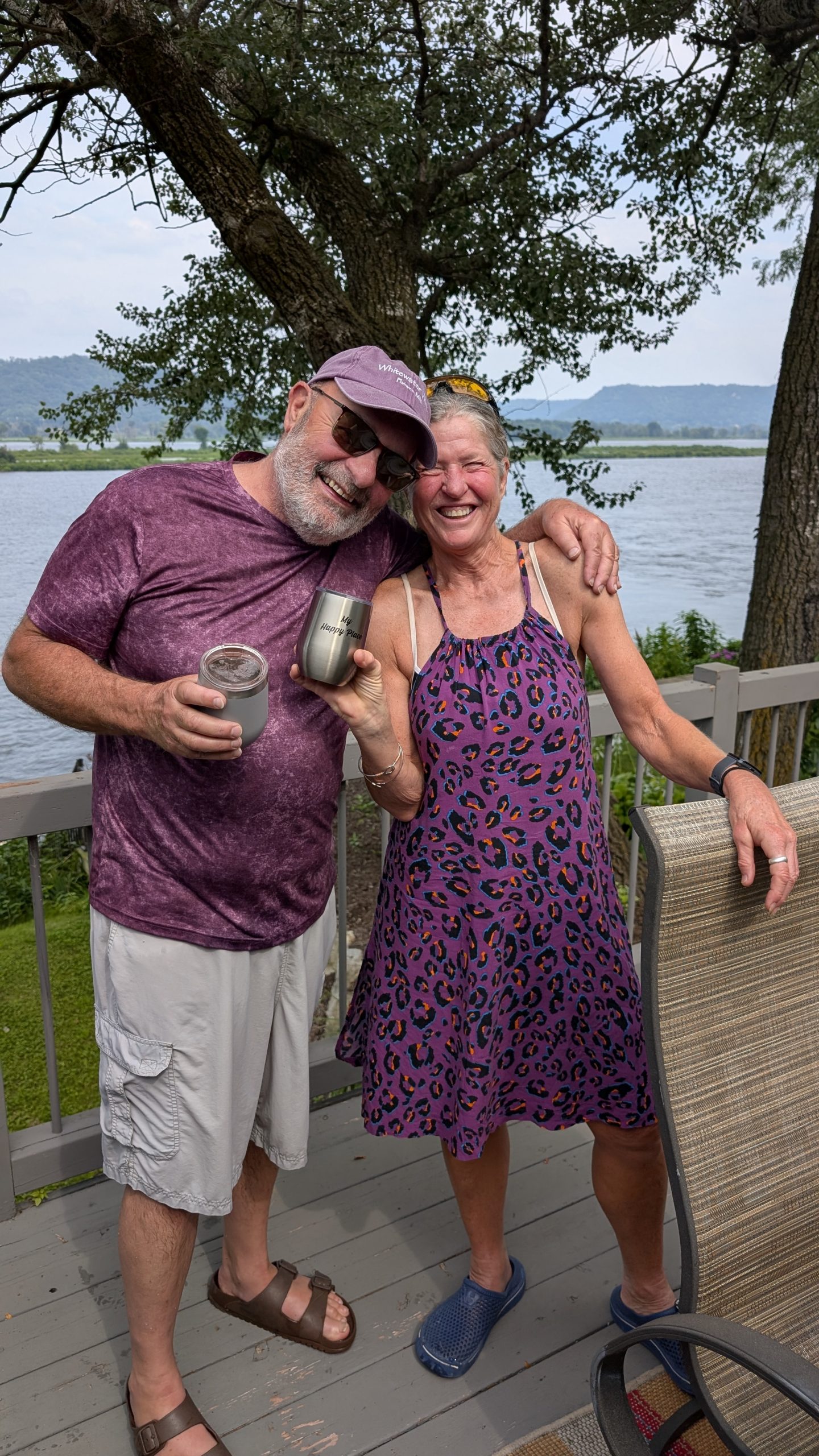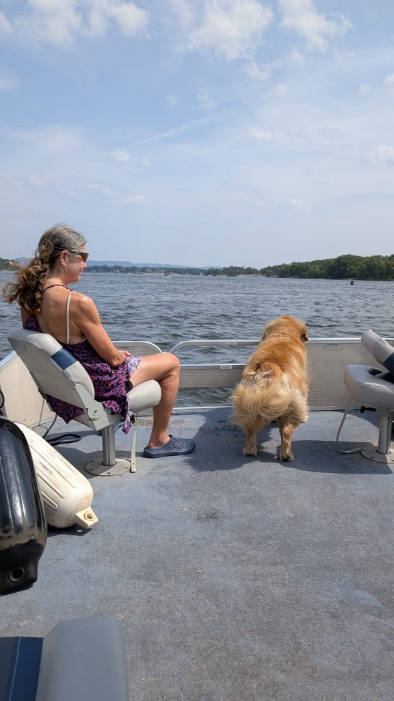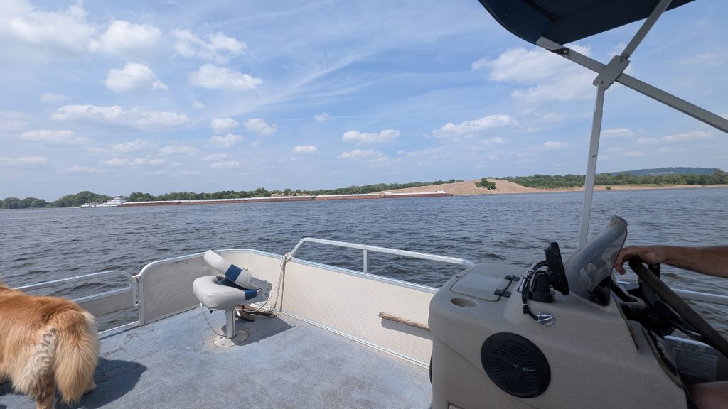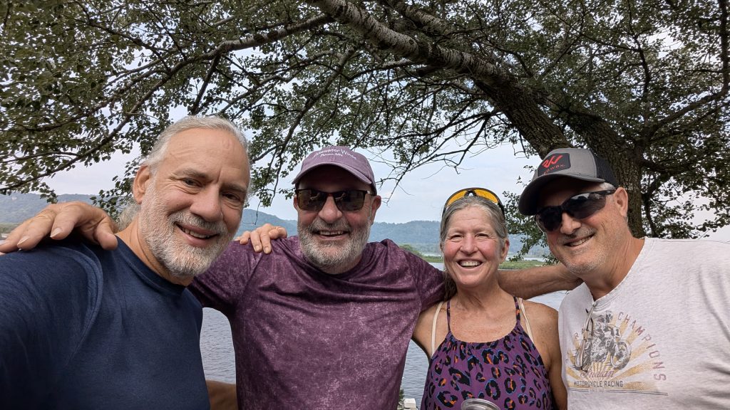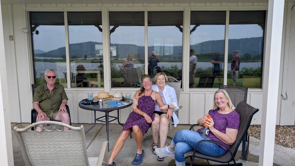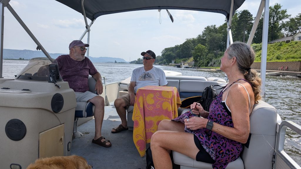 On Sunday, I helped Eric with a few more chores, and that afternoon he took us to their friends Tom & Patty. Tom took us onto the Mississippi on his pontoon boat — a beautiful day for a boat ride and we learned a lot about the river, too. That evening, we were treated to sushi and Ahi tuna steaks, and a little party for my 70th birthday.