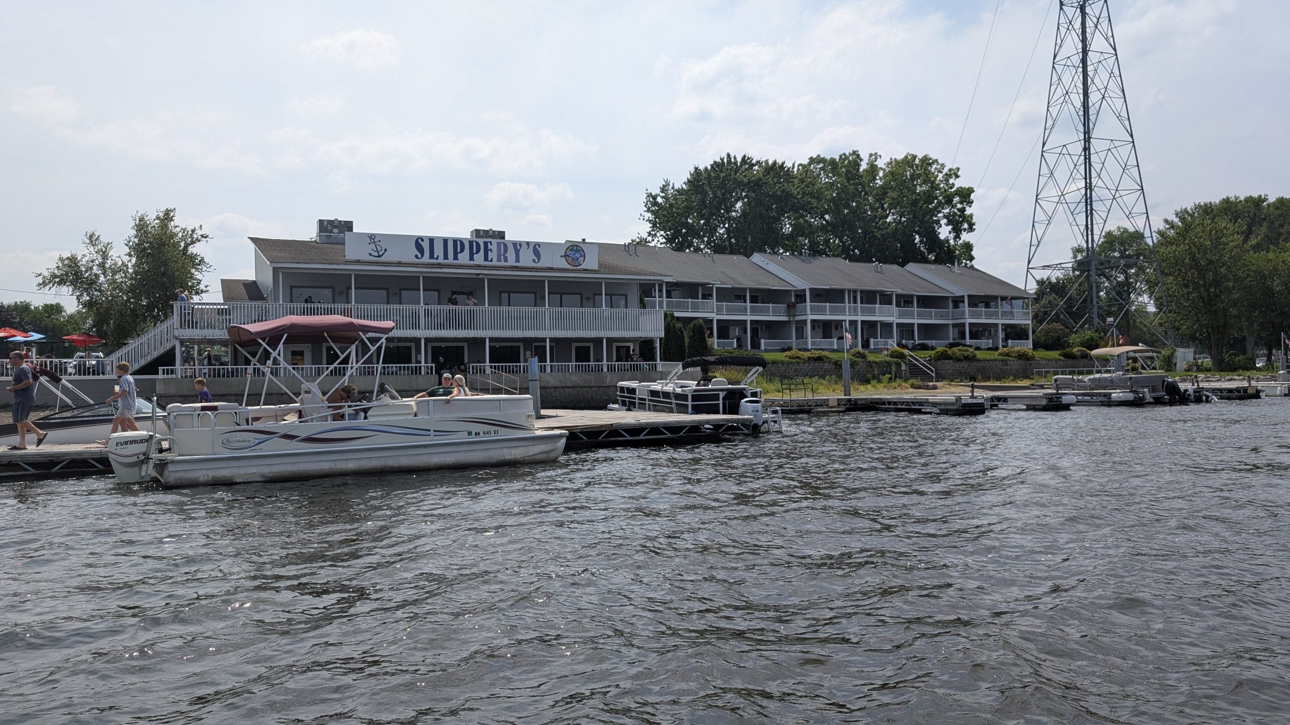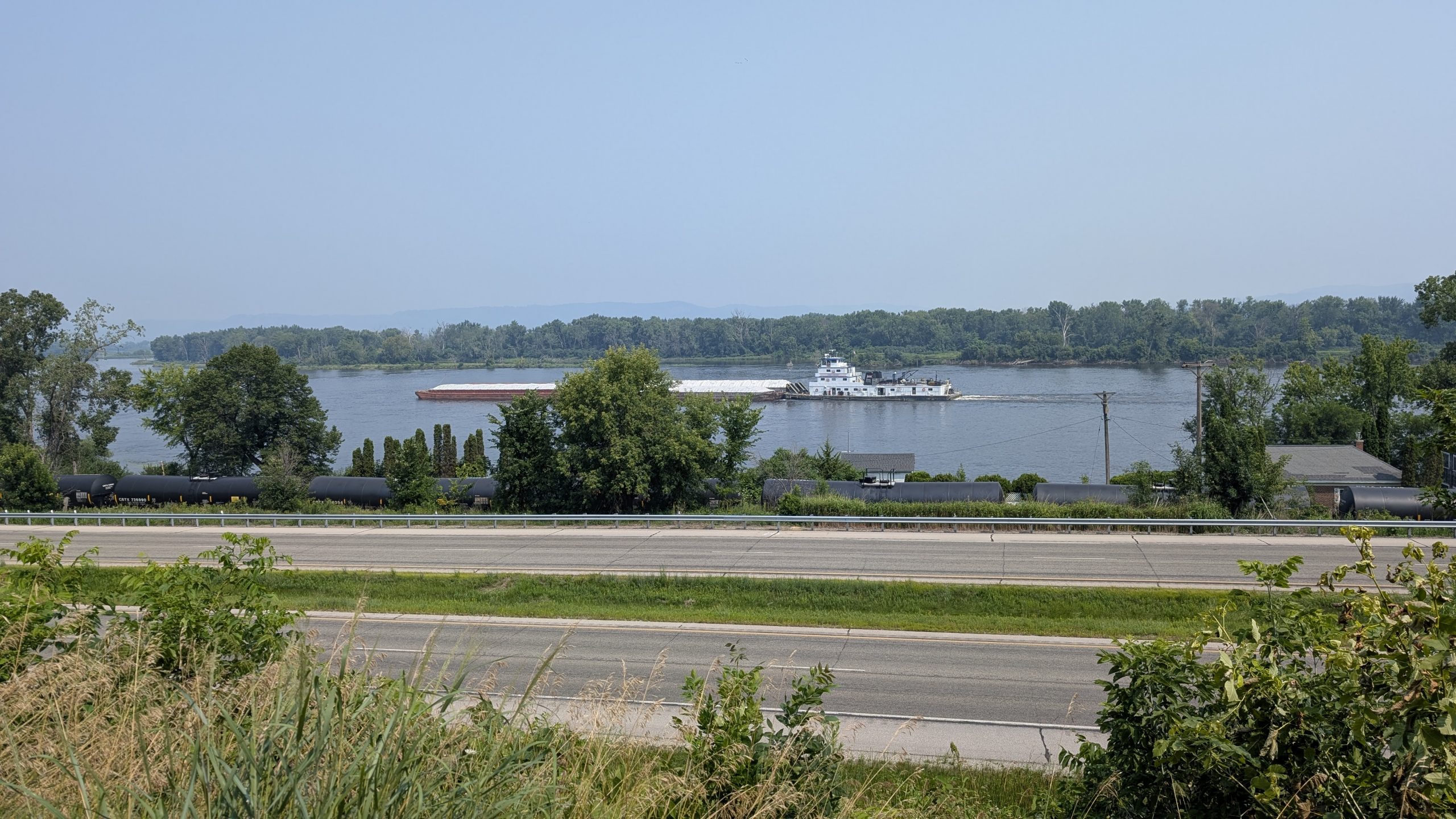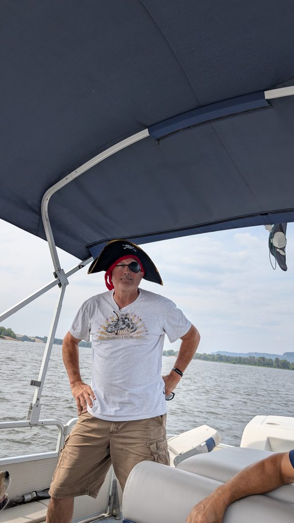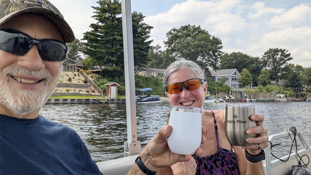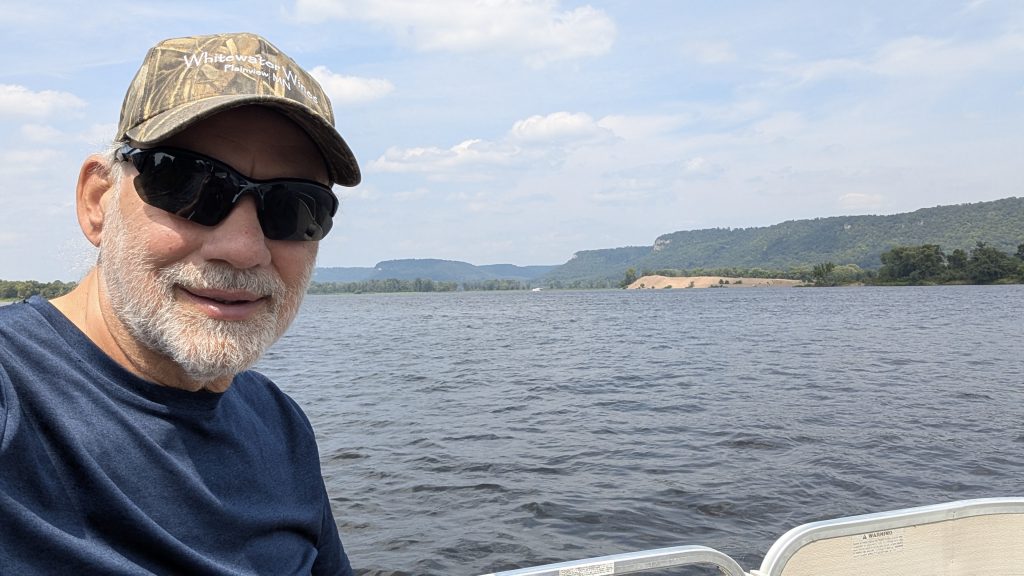 On Sunday, I helped Eric with a few more chores, and that afternoon he took us to their friends Tom & Patty. Tom took us onto the Mississippi on his pontoon boat — a beautiful day for a boat ride and we learned a lot about the river, too. That evening, we were treated to sushi and Ahi tuna steaks, and a little party for my 70th birthday.