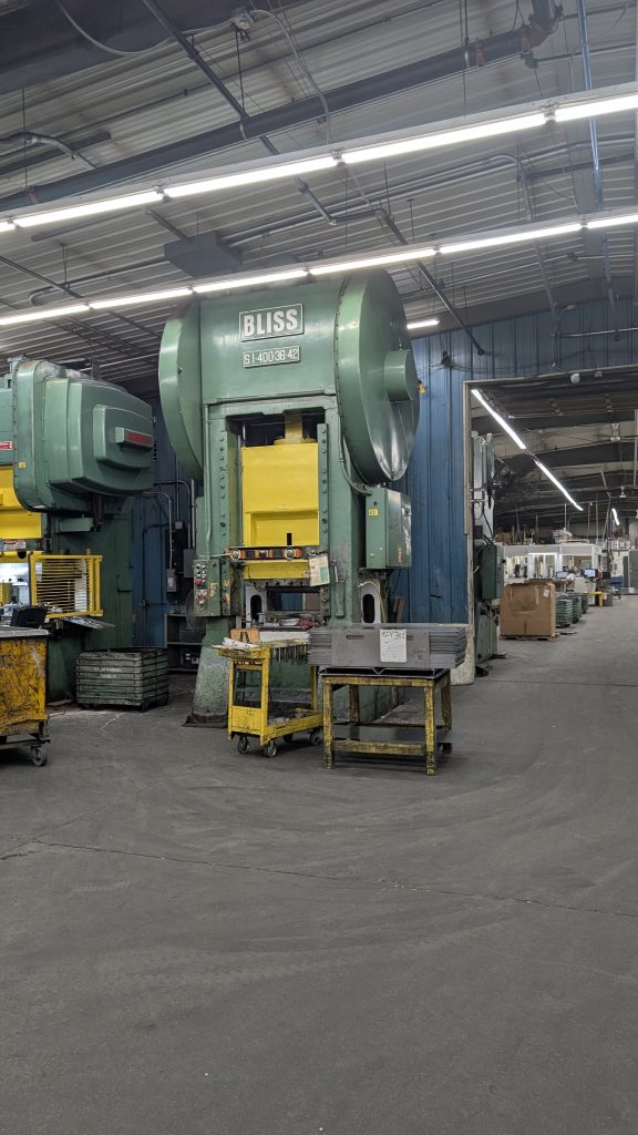 With the grocery stop, we didn’t get to Division Stampings until around 12:00. Robin greeted us, we donned safety glasses, and headed into the plant to see the operation which included many older stampers run by a person, but also modern CNC and laser cutting machines. We saw it (and heard it) all.