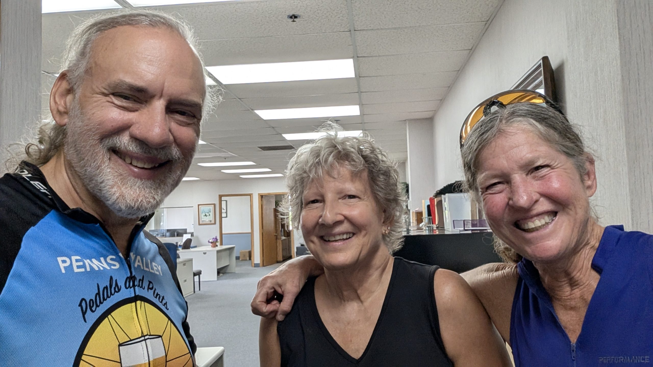 Before that, however, there were chores to do. We stopped at a grocery store and got stocked up for the days ahead. Dana also needed a lock as she left hers at a stop somewhere. Groceries for us that means tortillas, peanut butter, tuna salad packets, some fresh fruit and occasionally yogurt. Except for the fruit, they all pack easily and last for days. On the way to the store, Robin passed us on the highway and honked.