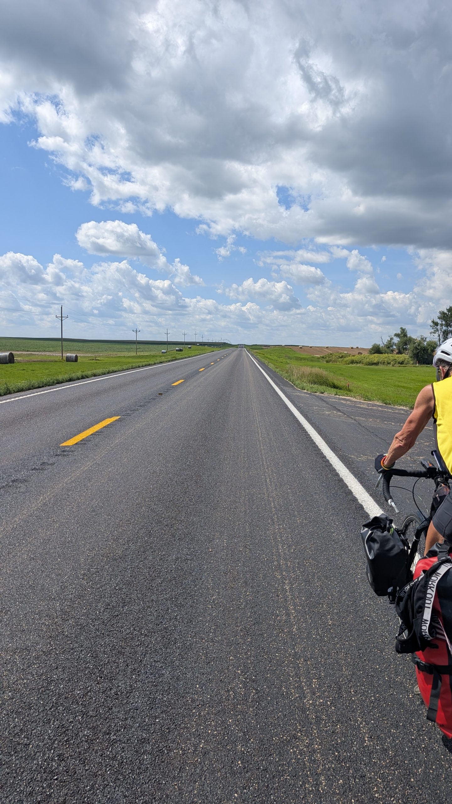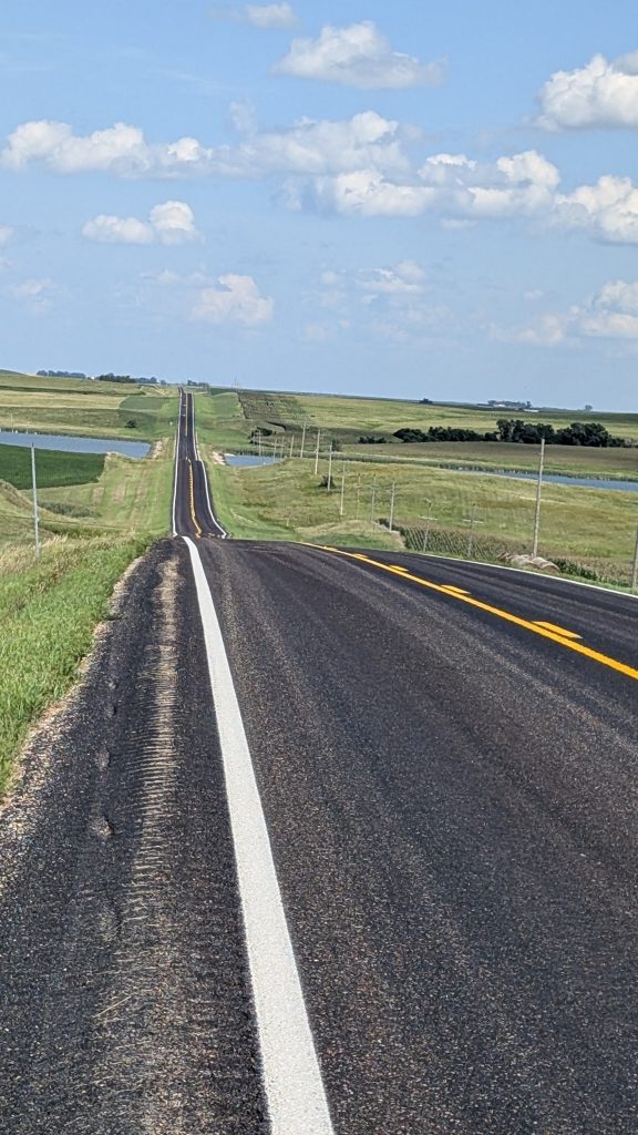 The terrain was still pretty flat, only exceeding yesterday’s ride with a 400′ gain vs. a 300′ gain over the last 20 miles. But the wind! In the high teens with gusts in the 30s. It was a slog all day and today, there were no little towns to stop in and get refreshed. We actually stopped at an Ag business on the highway and asked for water which the exceedingly disinterested receptionist pointed out in the conference room. “Thanks!” “Uh-huh.” It kept us going.