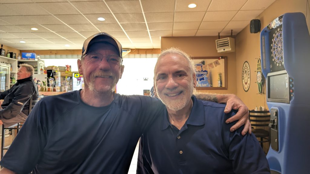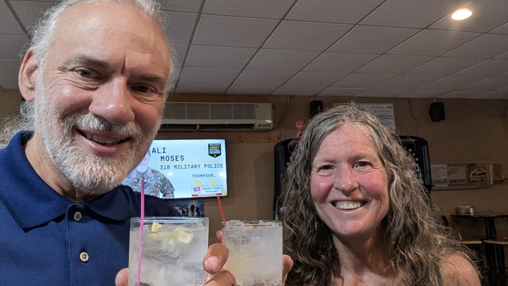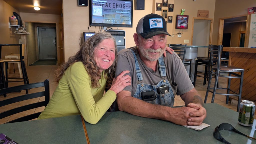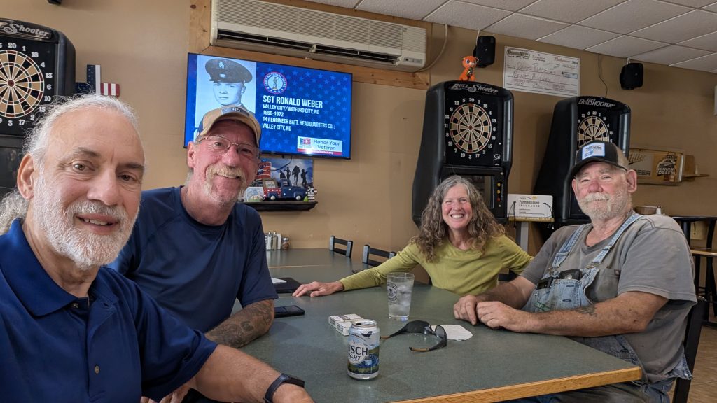 At Dani’s we met Jake and Mike and learned that they were rodeo performers in their youths. I asked how many broken bones they had and Jake pointed to his sternum, arm, and pelvis — he was a bronco rider. Mike said, “None, I rode broncos.” “Ever gored?” “Nope, but Jake was.” Jake also tried bronco-ing, and a bull slashed his thigh open. That was the end of the rodeo for him. Hard lives. Both were married and divorced multiple times, and Mike was left $1M by his father, but his sister stole it out from under him. Let’s just say they don’t have a great relationship. Jake lives in Spokane WA and was here to visit Mike.