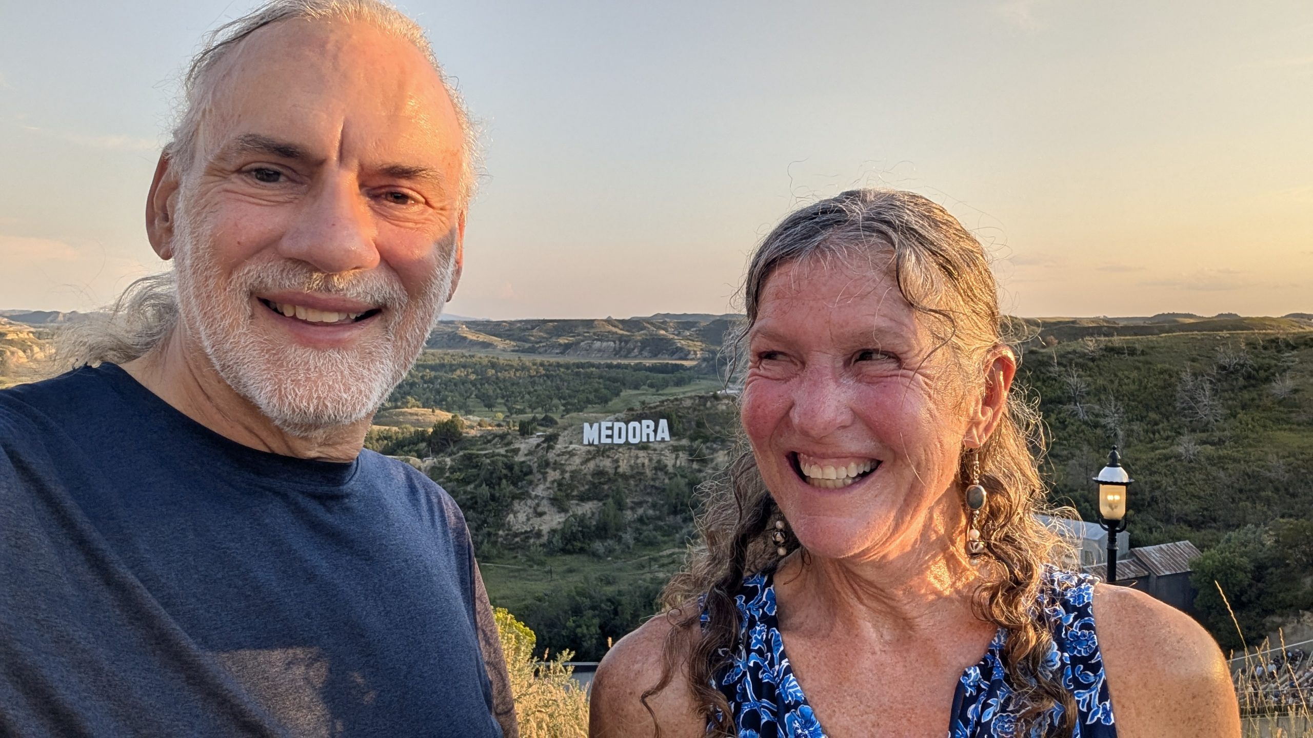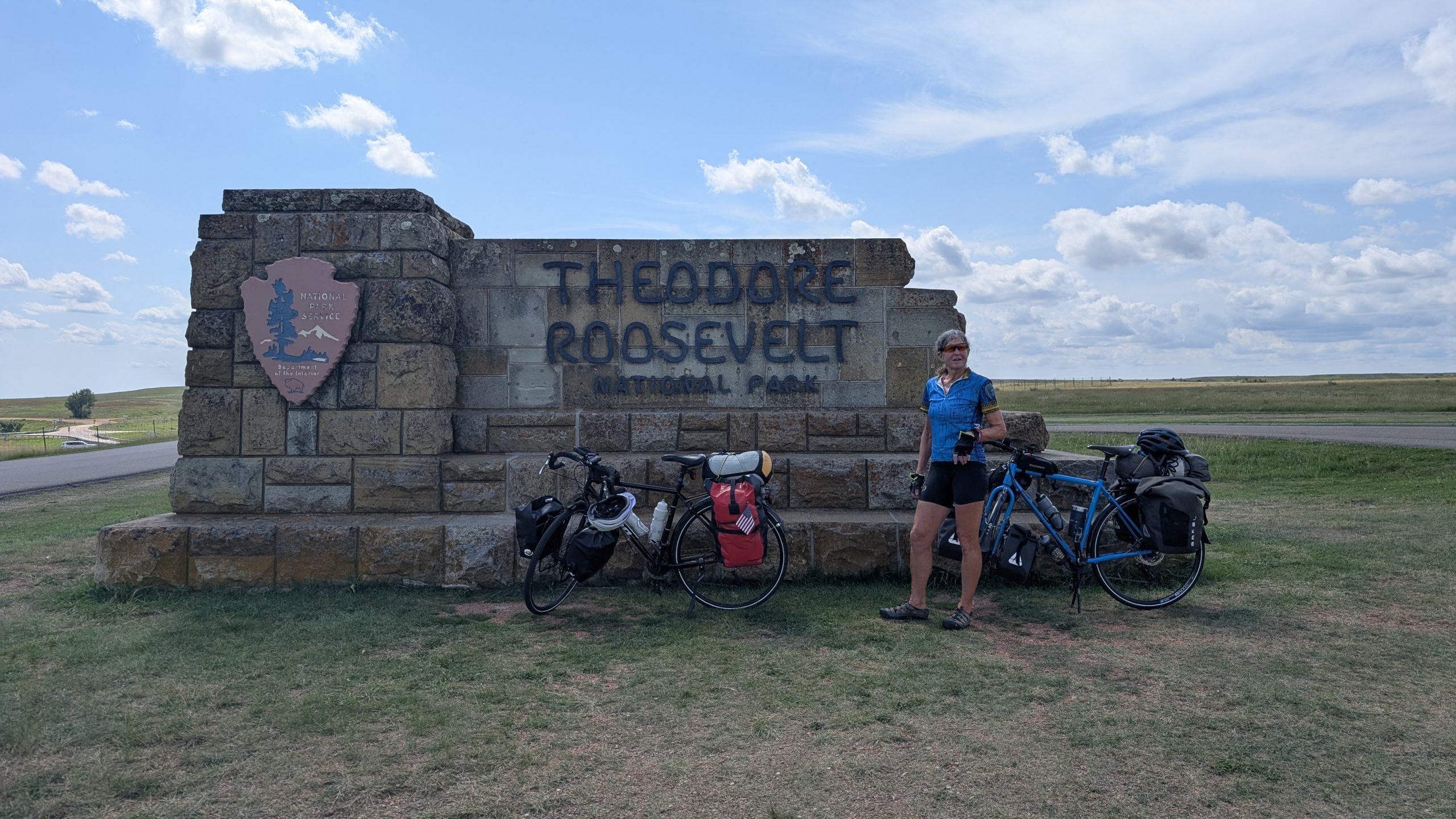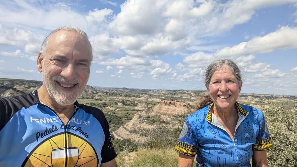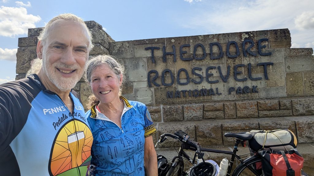 Today we reached out Western and Northern-most points in Medora and the Theodore Roosevelt National Park South Unit. On the way in we stopped at the Painted Canyon Visitor Center where Bonnie from Bellefonte saw my Penns Valley Pedals & Pints jersey and introduced herself. We got a good first look at the Badlands and headed on to Medora.