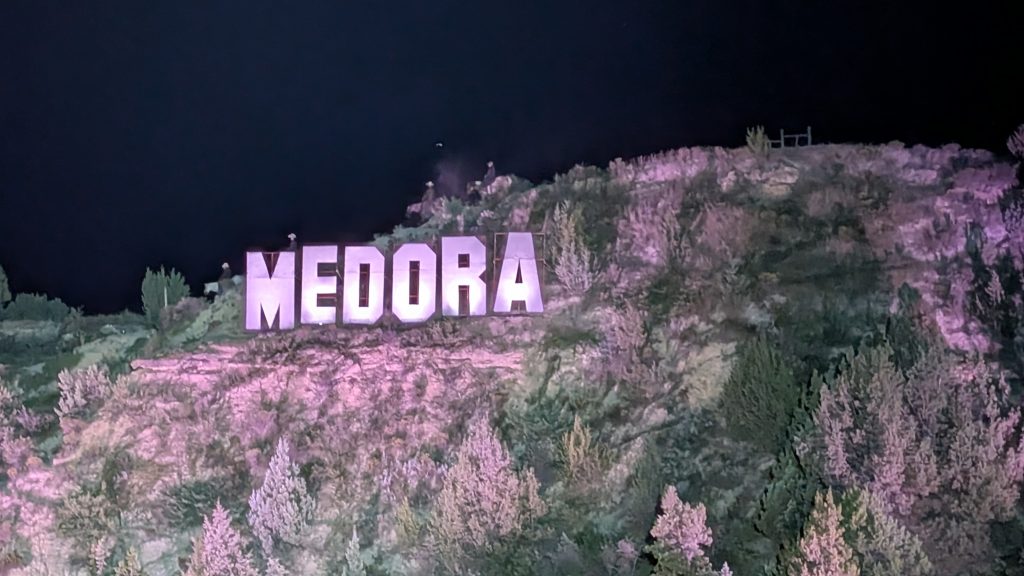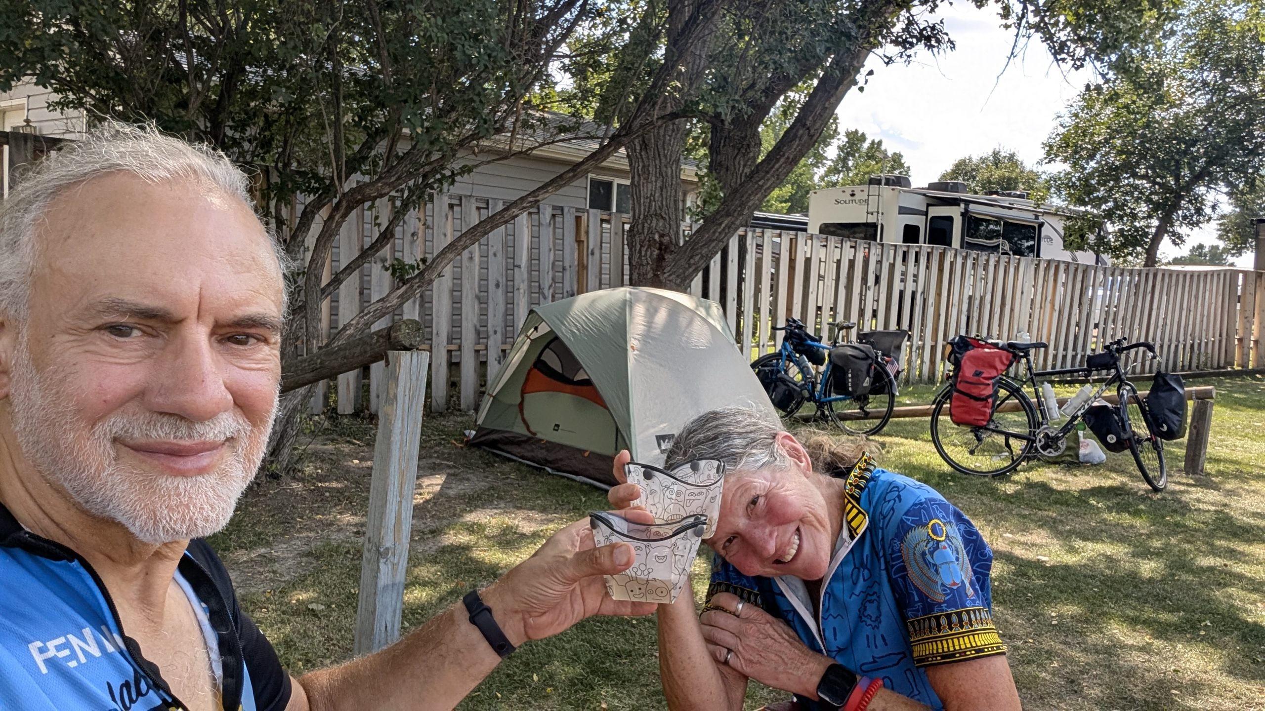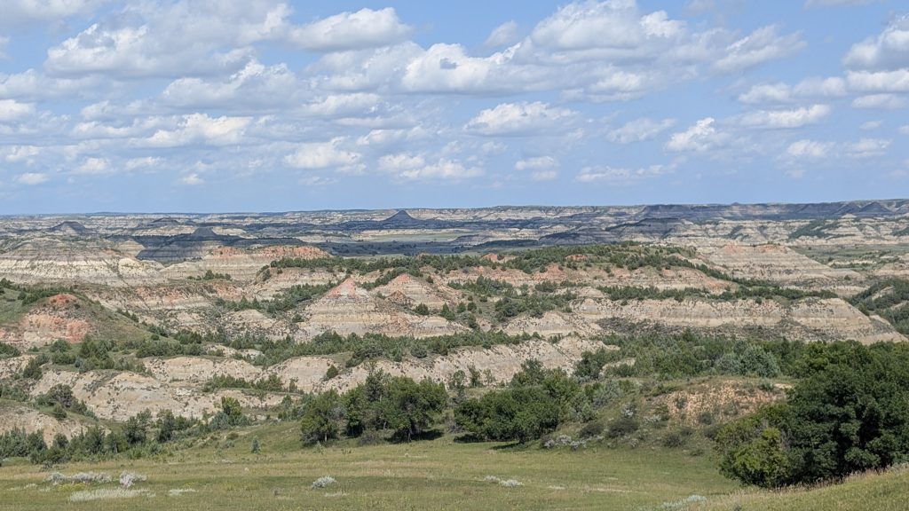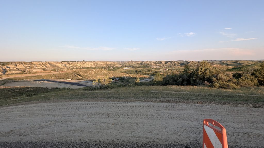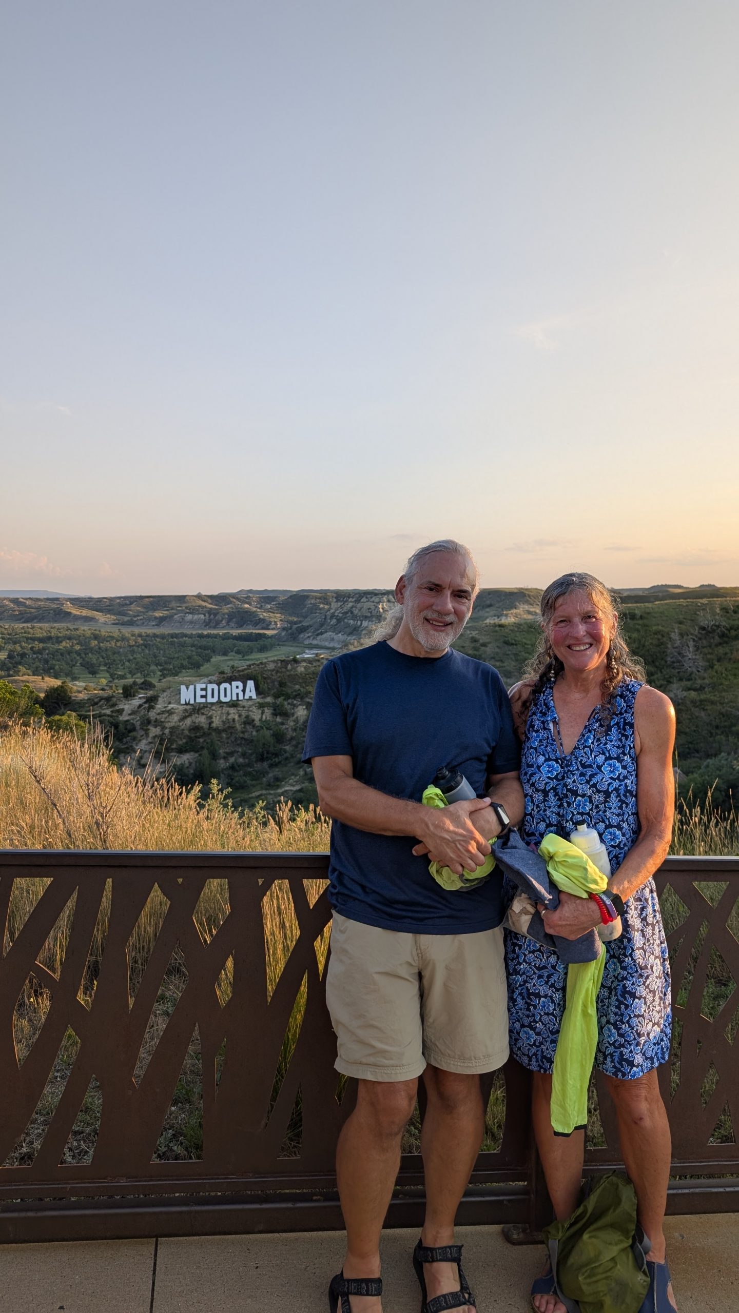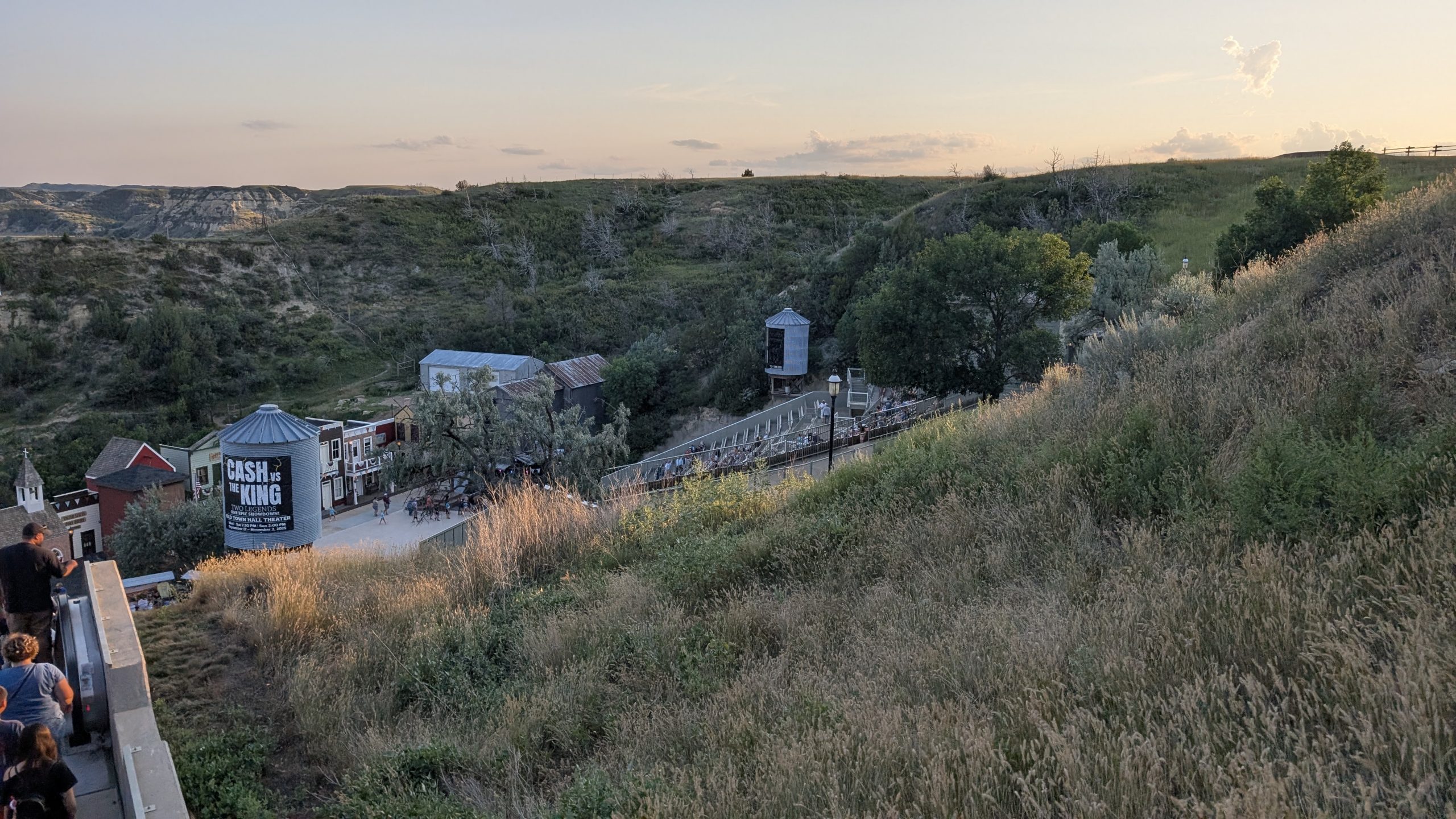 It wasn’t. More a revue than a musical, it offered a lot of classic songs with the lyrics changed and a little history — very little. We expected to hear about Medora’s history and the Roosevelt park and got a smattering of that but most of the “history” presented was about the founders of the musical and the musical itself. Campy and velveeta-y would be the best definition of what we saw. The amphitheater itself is quite an operation replete with an elevator tower and escalator down to the seating. The stage was a reconstruction of the town on rails and it would open and close depending on the scene. The most exciting part for us was the climb up the 15% grade hill on our bikes with people in cars yelling out encouragement, and the speedy descent in the dark. After the musical, it was back to the camp for a rest before hiking the badlands in the morning