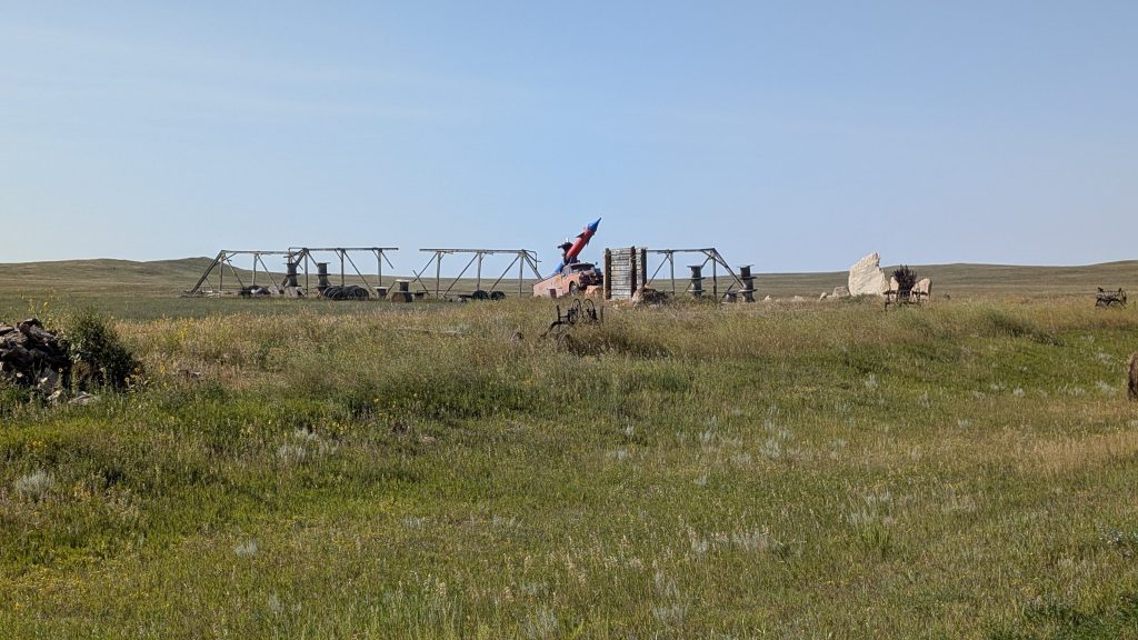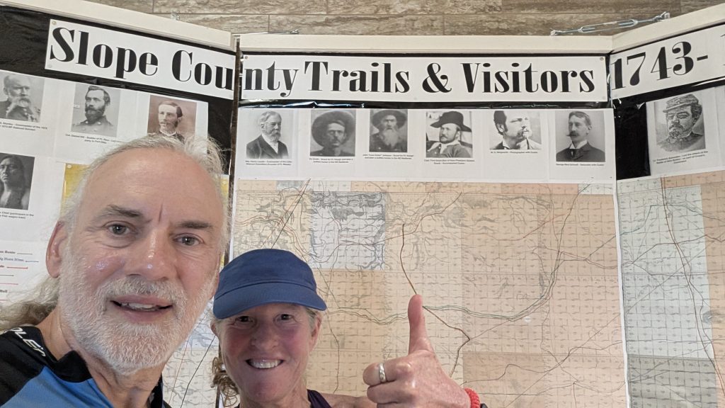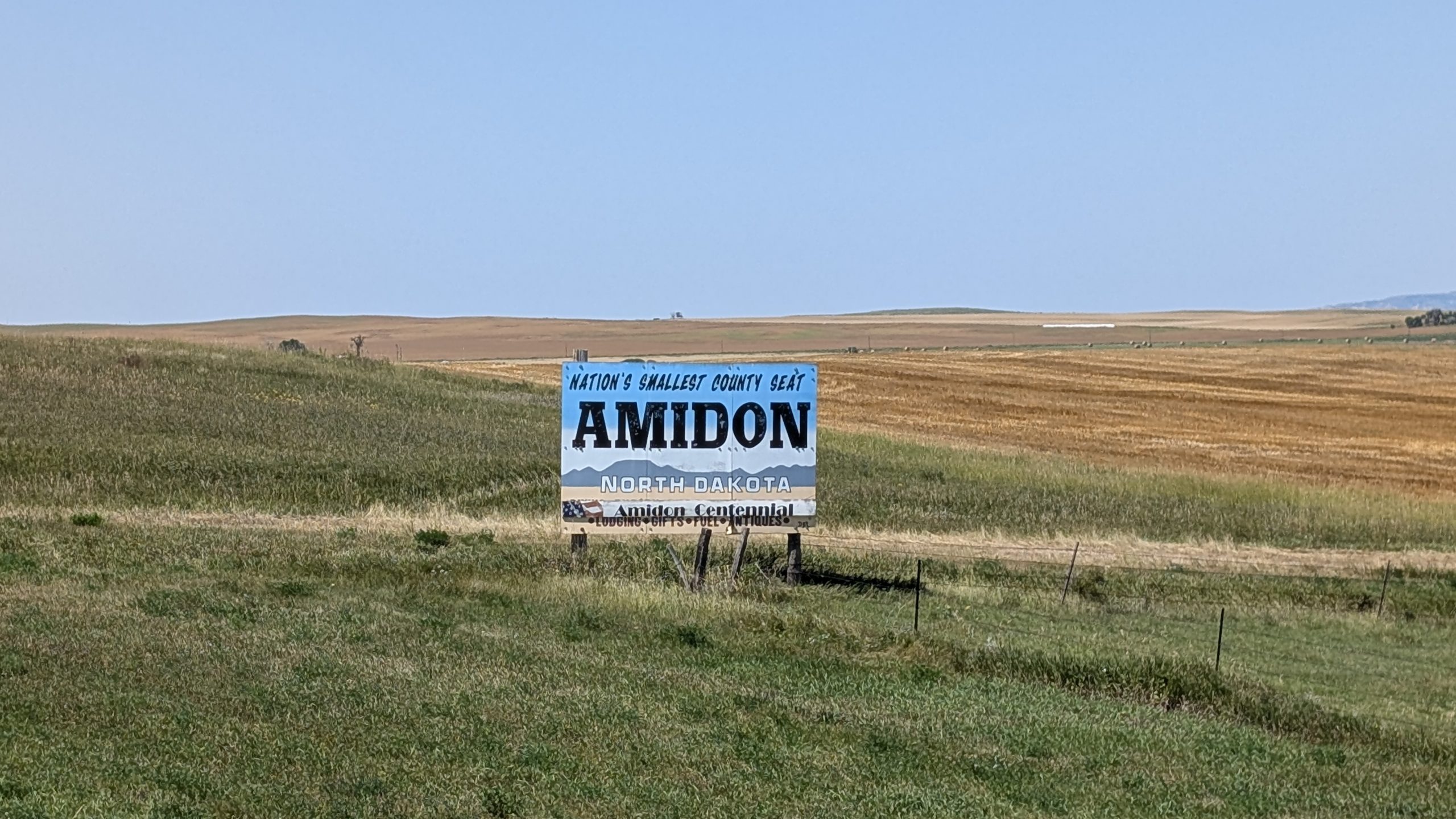 We were backtracking our way to Belfield to catch US 85 south to either Amidon or Bowman. High heat warning forecasts were on our mind as we made good time to Amidon (the smallest county seat in the US with a population of 11), which was our first option for camping. Just in time too as we were out of water. We got to the campground around 1 PM. There’s also a bar there and the door to it had a closed sign on it, but the office next door was open and not marked closed. We went in and were pleased ther was air conditioning. No one came in so we went and got a PBR and used the last ice I had to cool it and went back to the office to wait for someone to come as is usual procedure at a campground.