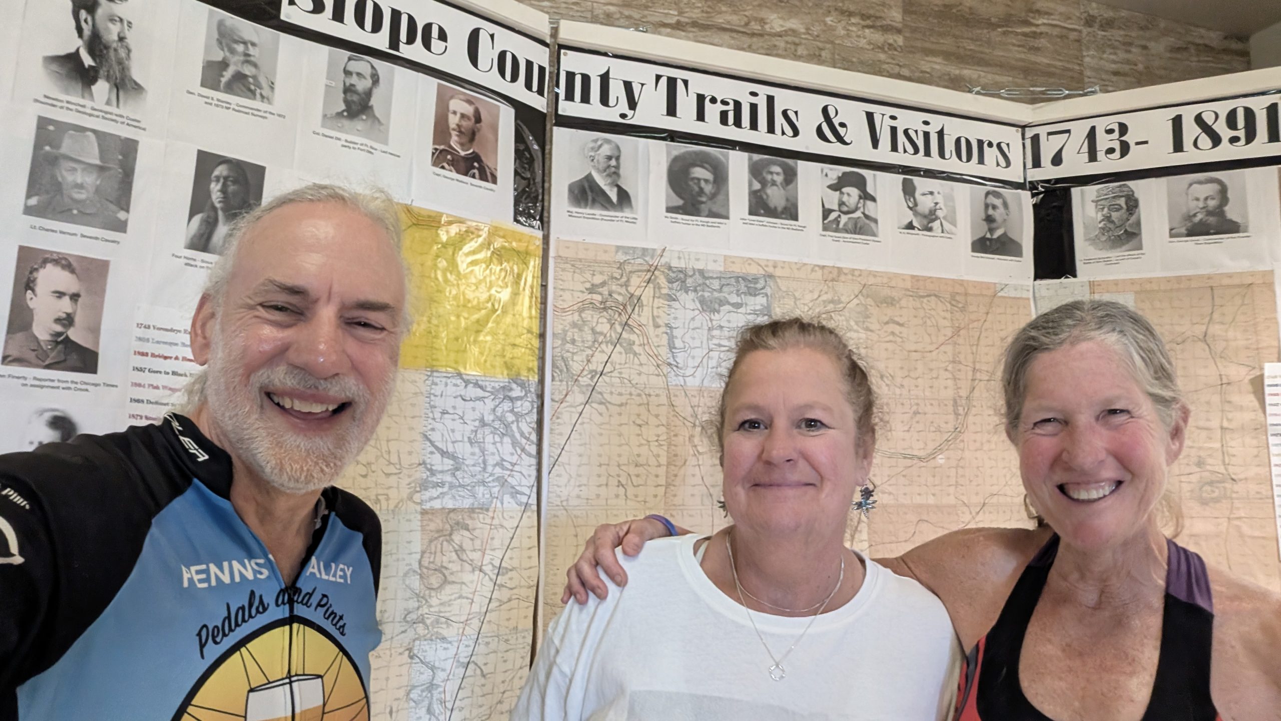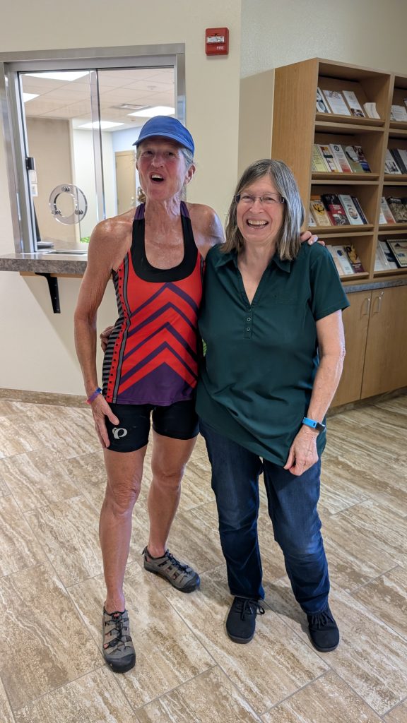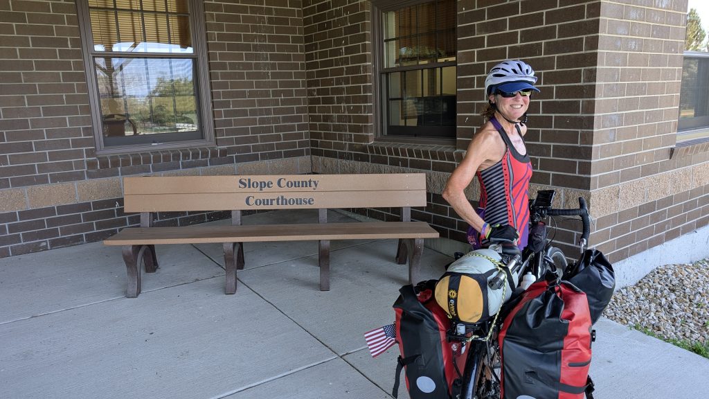 We had passed the county courthouse and it was a fairly new building, so we went there. We were greeted warmly and when I asked if we could use the water fountain, Cindy led us back through the building to the break room where there was a refrigerator with ice and filtered water. We chatted with the Ag Extension agent for a bit – she said she wished we’d met the owner — he’s much nicer and likable than his wife. Got a couple of cokes from the machine, snapped some pics with Cindy and headed out into the heat for 20 more miles to Bowman.