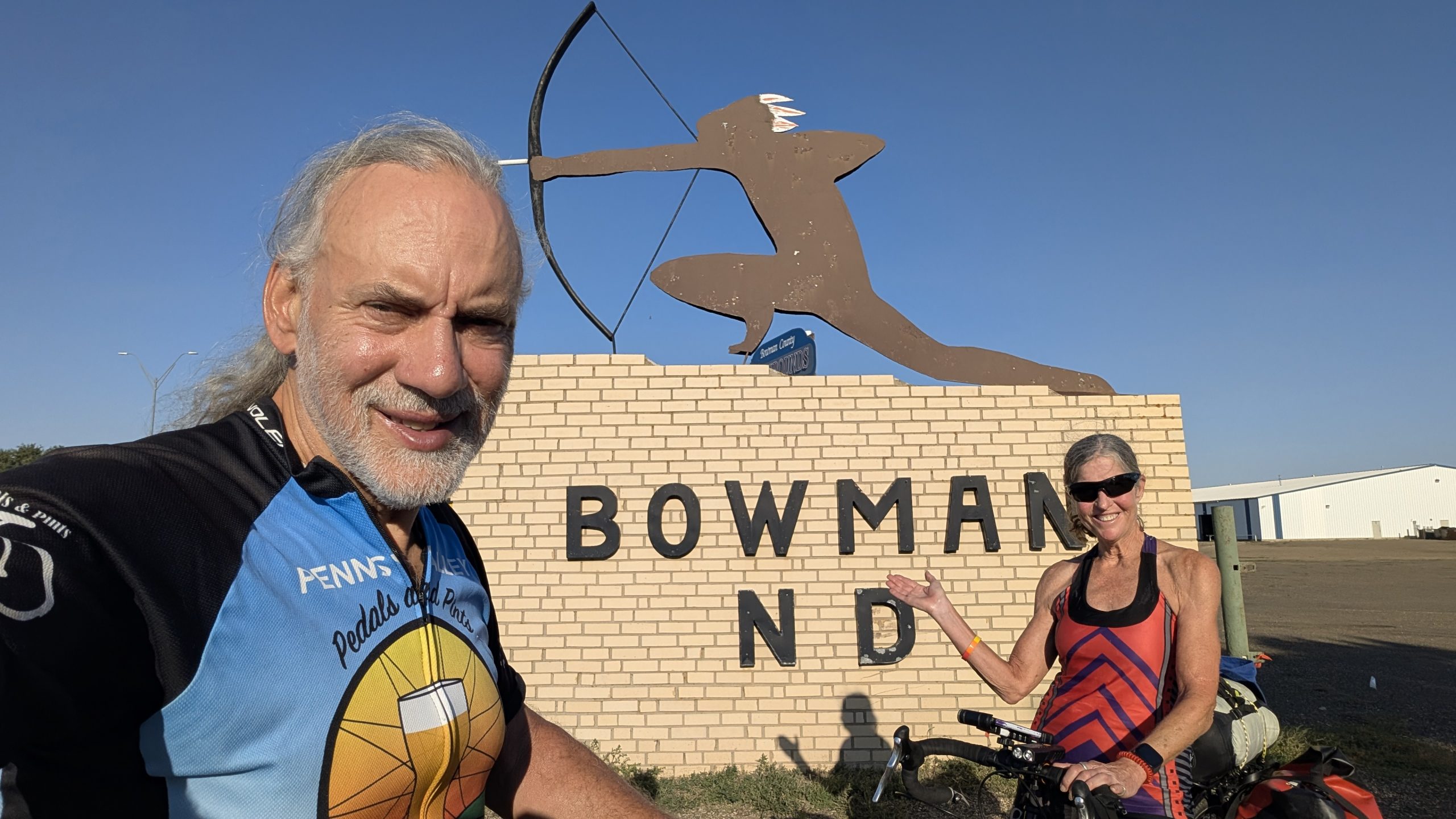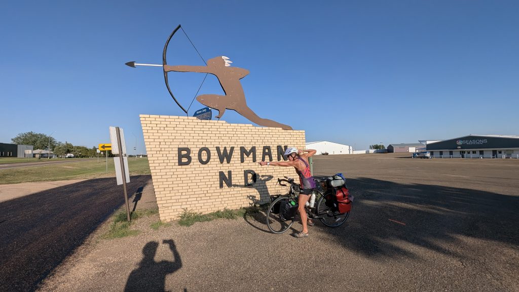 Well, that was quite the adventure. Dana was far out in front and we both managed to ration our water to make it to Bowman unscathed. Did I mention that besides the heat, this was now full into a 20 mph+ headwind. We met up at a local bar, had some water and a couple of beers, and went to set up camp. Had dinner at another local bar, and then back to the tent for another well deserved rest and to get rid of some of our testiness after the hard day. The heat isn’t supposed to let up tomorrow, so we’re trying for an early start.