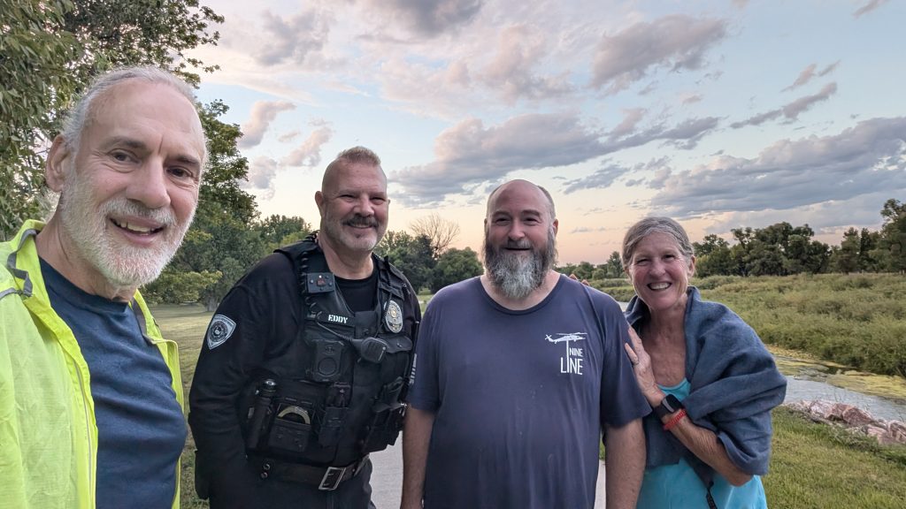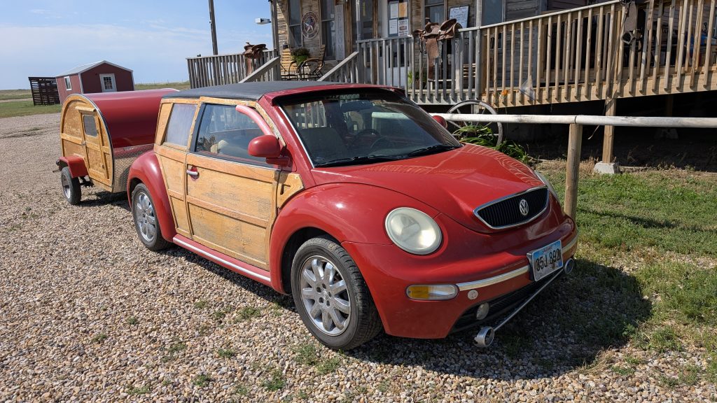 Back at the campground, there was a dog across the river just howling and howling like it was trapped on something. When Dana got back, she called the campground owner and he called the police. In the meantime, a local who was walking his two dogs, forded the river and got to the dog. In a few minutes, an officer in a squad car showed up, and another from animal control. The dog had a weasel or ferret cornered and wouldn’t give it up. Paul was the guy who retrieved the dog — and thankfully so else it would’ve been a long, sleepless night listening to the howl. We talked with the officer for a while until he got another call (incl. how to say Belle Fourche — Belle Fooche). All in all an exciting evening.