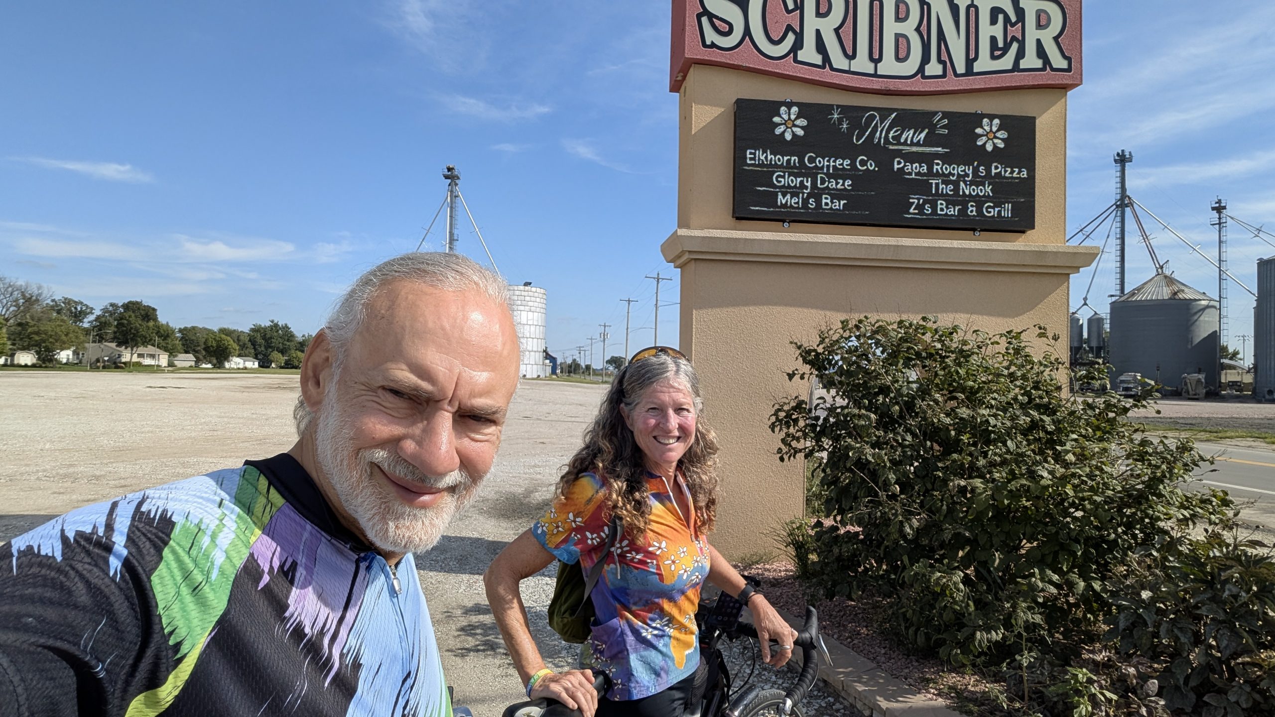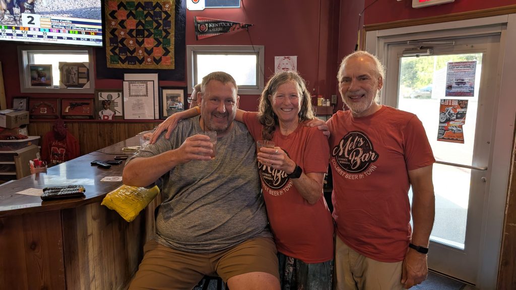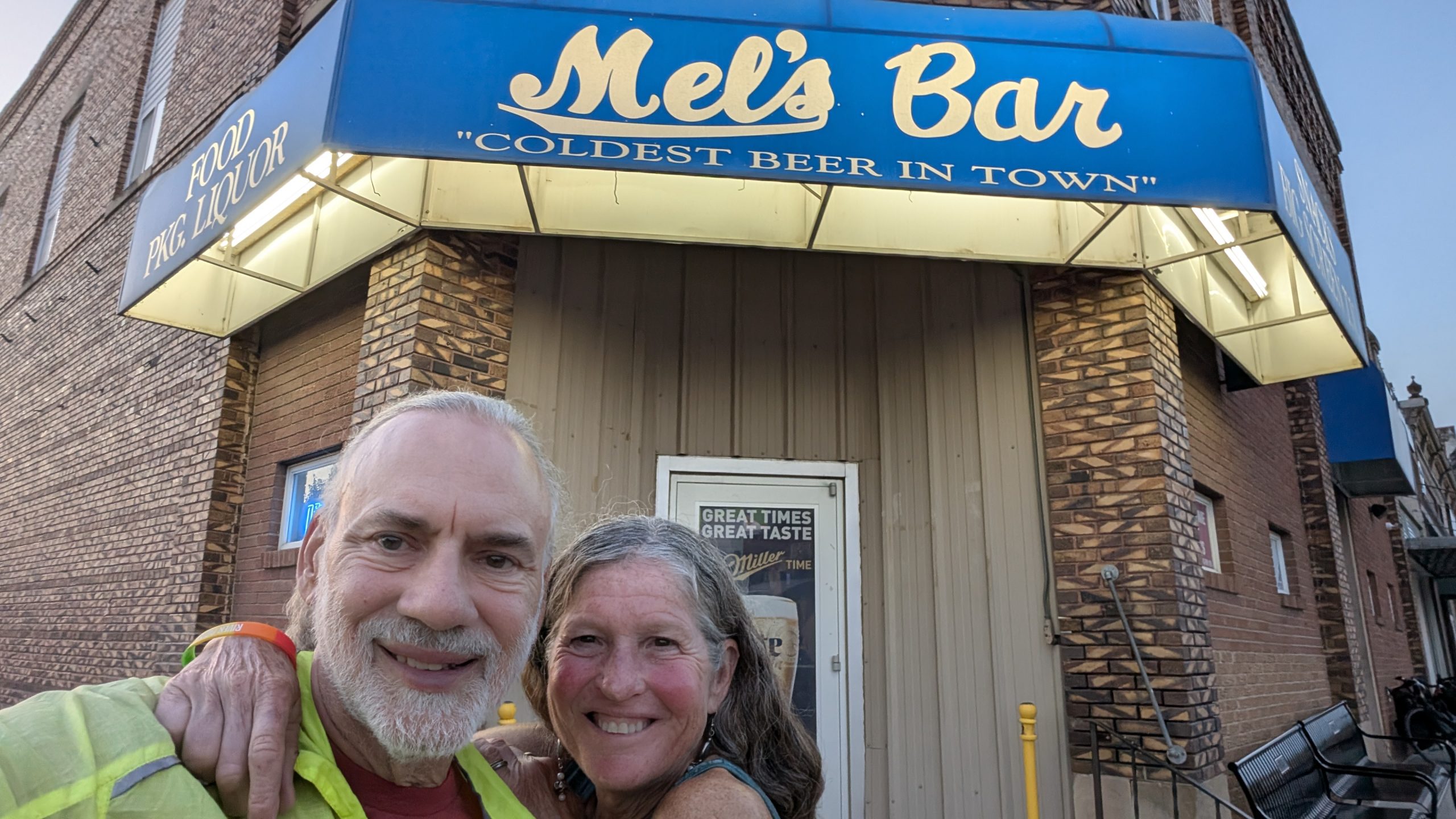 We had to pass the fairgrounds on the way in to Scribner so we checked them out and found that all the restrooms were locked. So we stopped at the Swanson Insurance Agency on Main Street and talked to Laurie and Colleen. Laurie made some calls and said she would go and open one of the restrooms for us. They also recommended Mel’s bar as a right currently only place in town to go because the other restaurant was closed on Tuesdays. So we headed to Mel’s, almost next door. We soon found out Mel’s was owned by a guy named Joe, and his daughter Sydney was behind the bar.  Joe got up and tossed us a couple of “Mel’s” t-shirts.