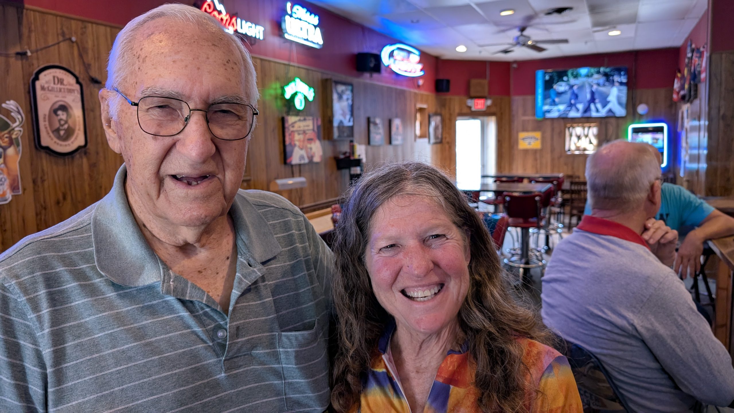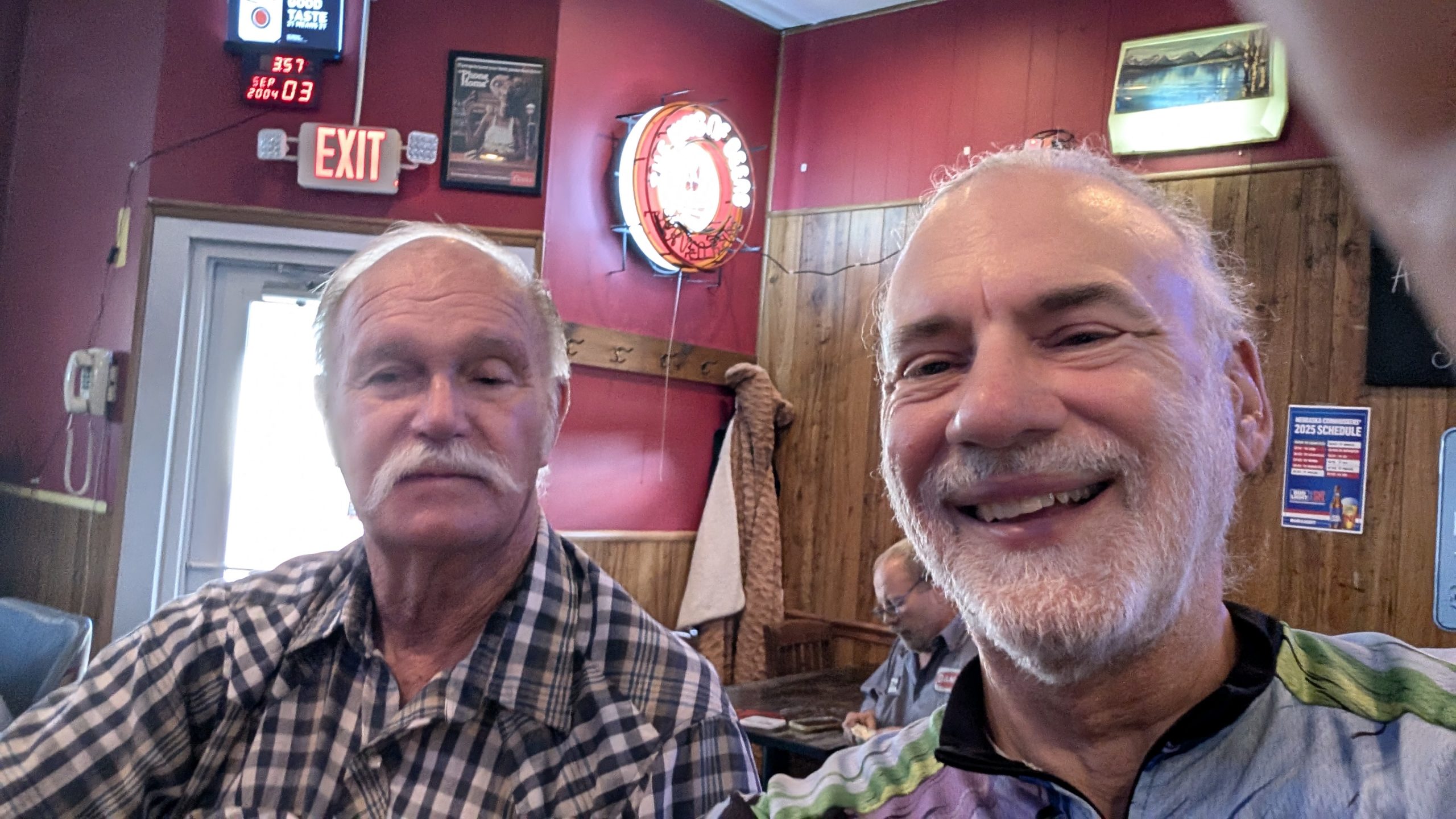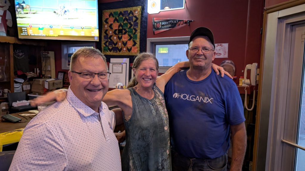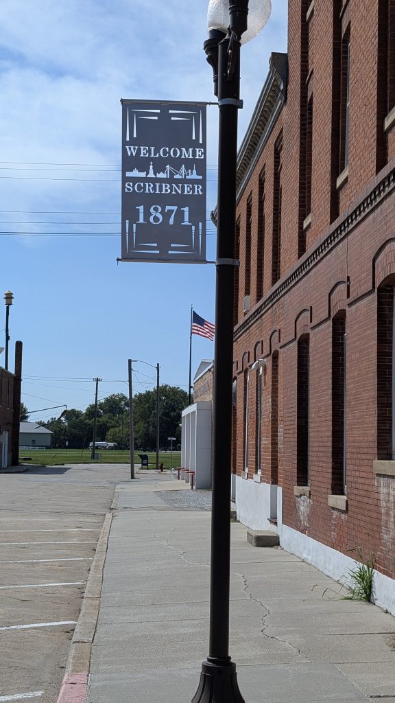 We had to pass the fairgrounds on the way in to Scribner so we checked them out and found that all the restrooms were locked. So we stopped at the Swanson Insurance Agency on Main Street and talked to Laurie and Colleen. Laurie made some calls and said she would go and open one of the restrooms for us. They also recommended Mel’s bar as a right currently only place in town to go because the other restaurant was closed on Tuesdays. So we headed to Mel’s, almost next door. We soon found out Mel’s was owned by a guy named Joe, and his daughter Sydney was behind the bar.  Joe got up and tossed us a couple of “Mel’s” t-shirts.