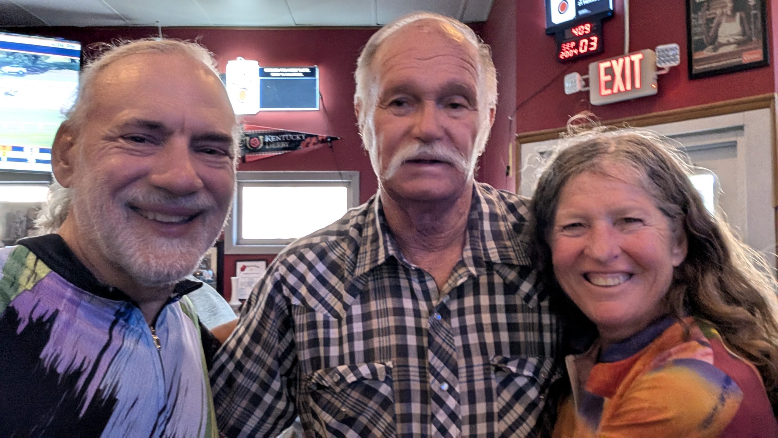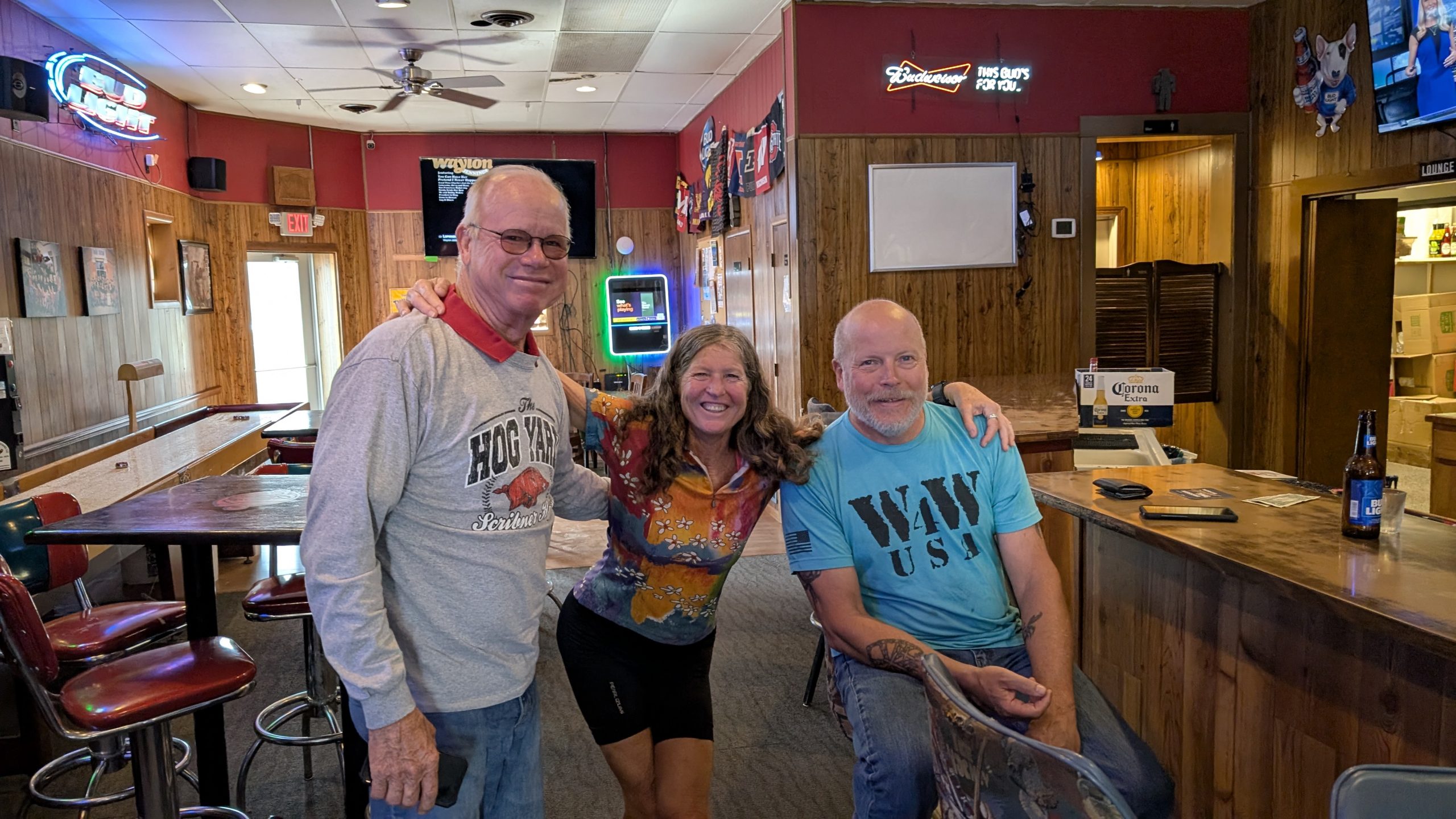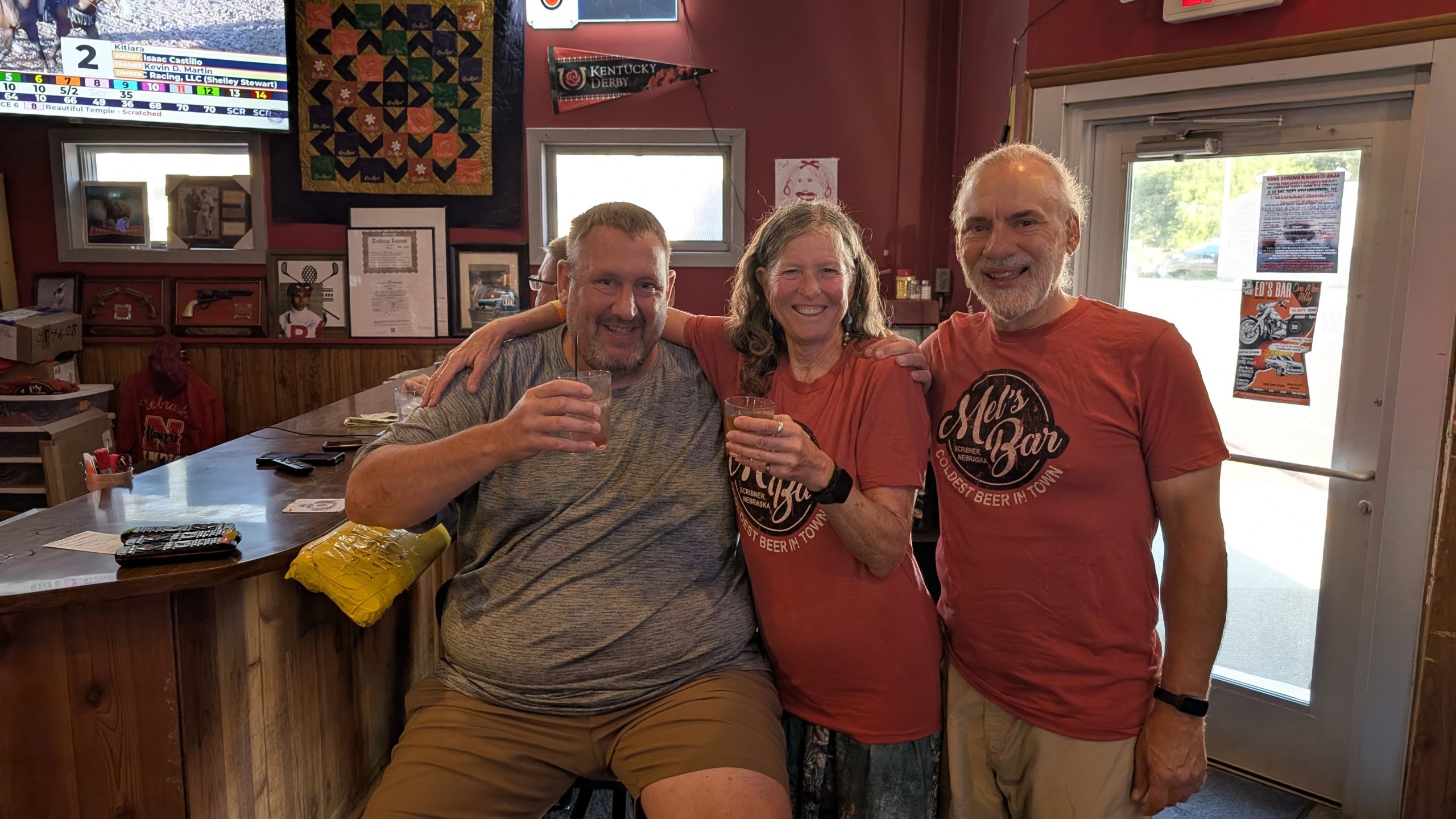 We met and talked to everybody in the bar. I sat beside Tim and he bought us a round. Dana chatted with Paul and Ernie. We then left to get showers and set our tent up with the goal of coming back for happy hour and dinner.