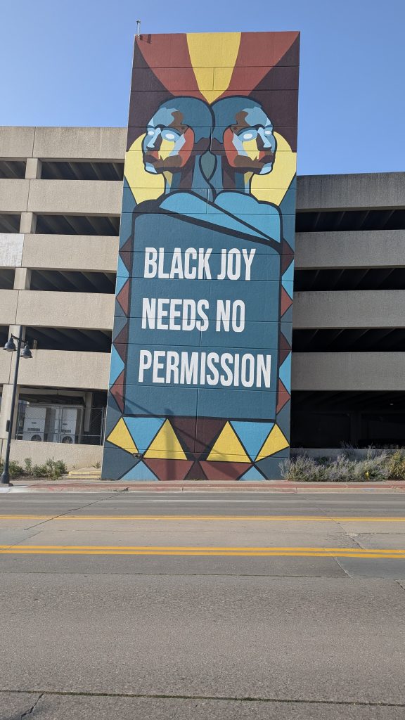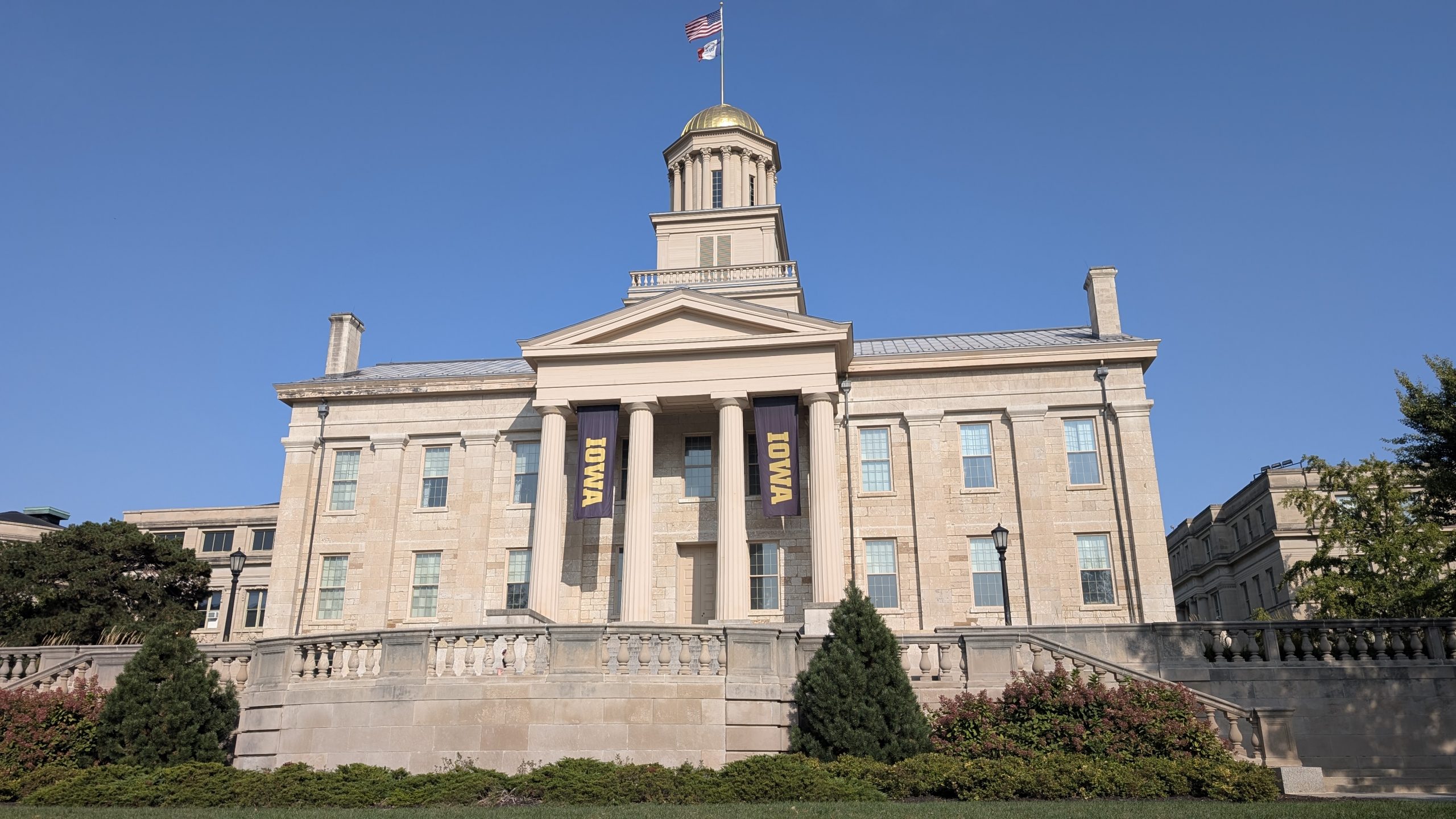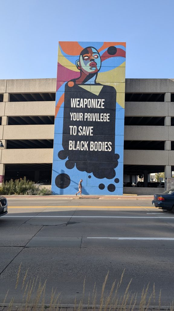 This route followed the now familiar pattern of Iowa hills and I only made one short stop until I got to the outskirts of Iowa City. Dana was ahead as usual and had stopped at a Casey’s and called me — we met at a grocery store and did a little shopping for the next day. Our Warmshowers host, Peter, had been in touch and even sent us a pic of their backyard so we would know where to go. I texted him and asked if it was OK if we dropped our bags off to lighten our load as we explored the town. “Of course, and that’s a good idea.” He gave us some suggestions of things to see, too. We got to the house and there, right where it was in the pic, was our home for the evening: a fully restored (and improved) Airstream trailer. We grabbed quick showers, dressed, and headed in to explore Iowa City.
