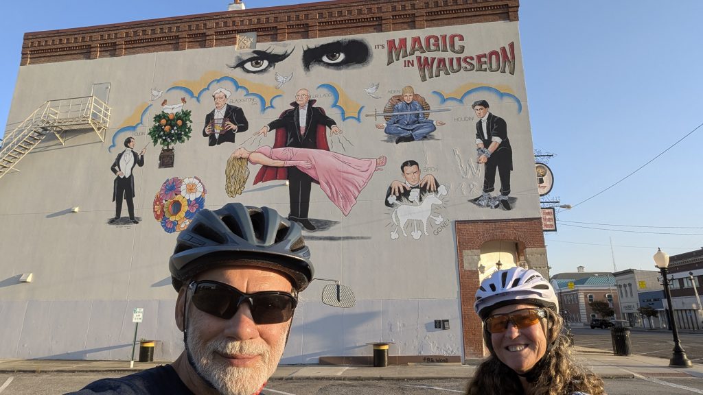 After coffee and some breakfast, on we went to Wauseon. Neither of us had ever heard of it, so it would be new to us as many of the small towns we have visited have been. The ride was pretty flat with a tailwind to start the day, but that switched to a headwind by noon. Other than an 8 mile stretch on US 20A at the end of the ride, we were on very quiet back roads, passing lots of fields of corn, soybean, and occasionally tomatoes.