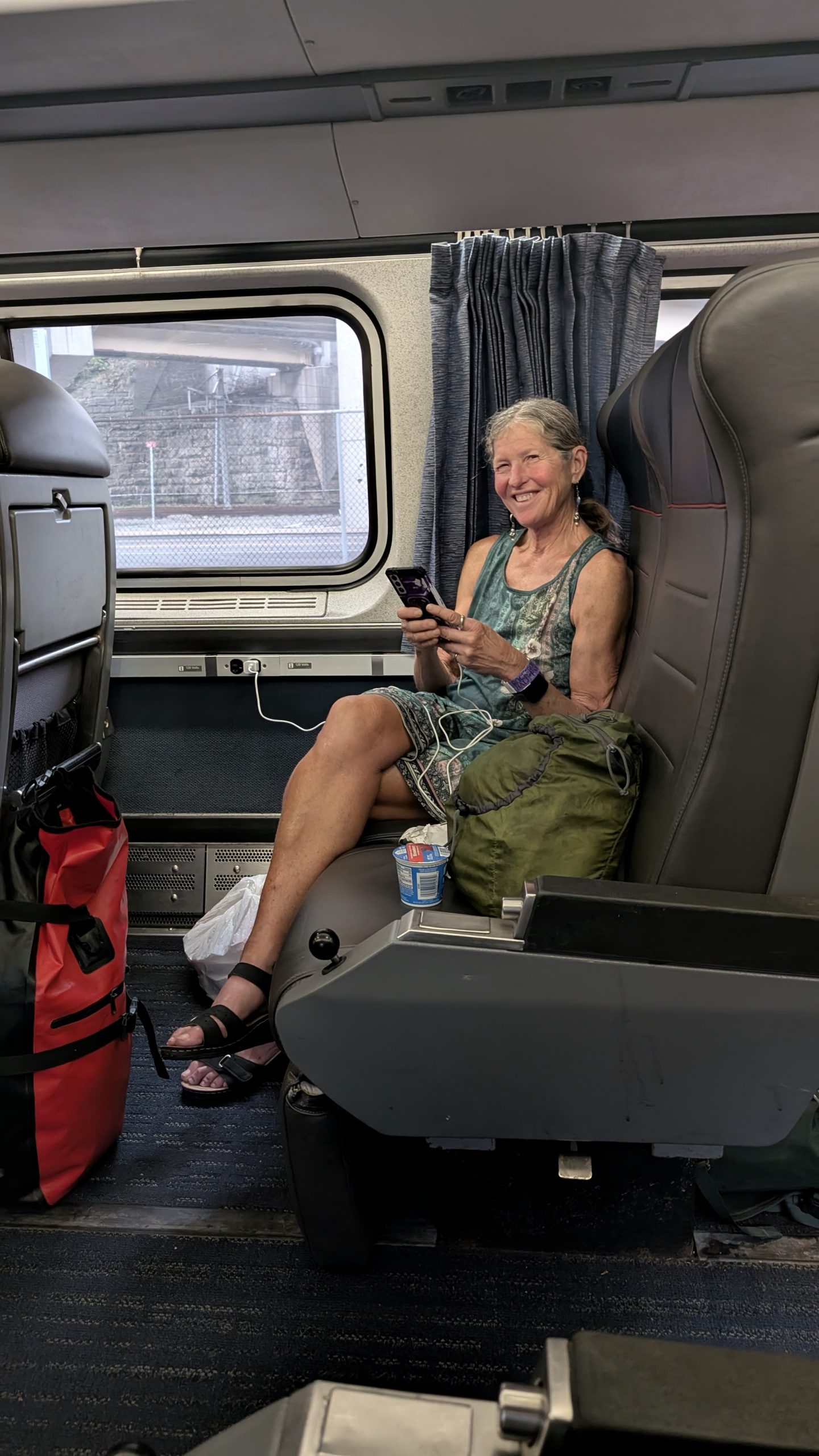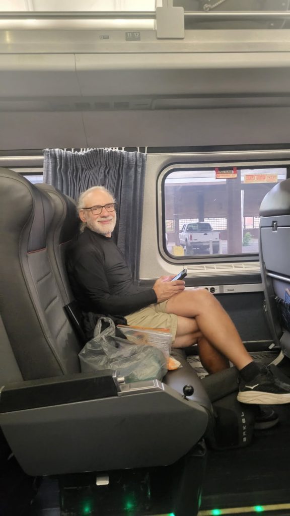 We got up at midnight and finished packing, stripped the bed, fetched the bikes from the garage, and carried our panniers to the bikes. Then it was a dark, but warm, ride to the Amtrak station. It was a good thing that we found it yesterday, because finding that station in the dark would’ve proved daunting. Not in a very accessible place. We checked in and got baggage tags for the bike, and settled in for the long wait until boarding. The train was about 1/2 hr late, so the wait would be a bit longer.