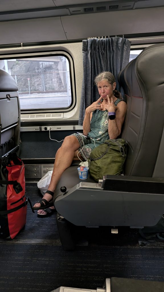 When the announcement came, we wheeled our bikes to the baggage car and hoisted them up to the baggage agent. Amtrak requires that any bags be removed, but thankfully we didn’t have to take the sleeping bags or tent off of the top racks It’s a crap shoot with Amtrak as this procedure varies from station to station, but three less items to carry back to the coach car.