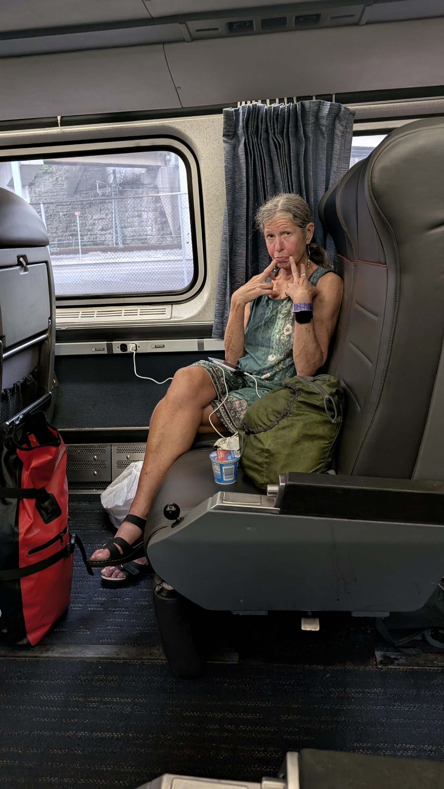 Trains are long, and it’s a long way from the baggage car back to coach and we were the last two to board. We found seats together and lifted our panniers up to the overhead storage. Plenty of space, too, and the seats on Amtrak trains are wide and comfy. We settled in to try to get some sleep during the 3 1/2 hr. trip to Pittsburgh where we would change from the Floridian to the Pennsylvanian. I kinda knew from past experience that I wouldn’t be sleeping much. Dana tried, but a really loud snorer across the aisle interfered with that endeavor, as did the lights that are dimmed (somewhat) but never turned off. I decided to work on the blog and one plus of this trip was that there was WiFi on the train.