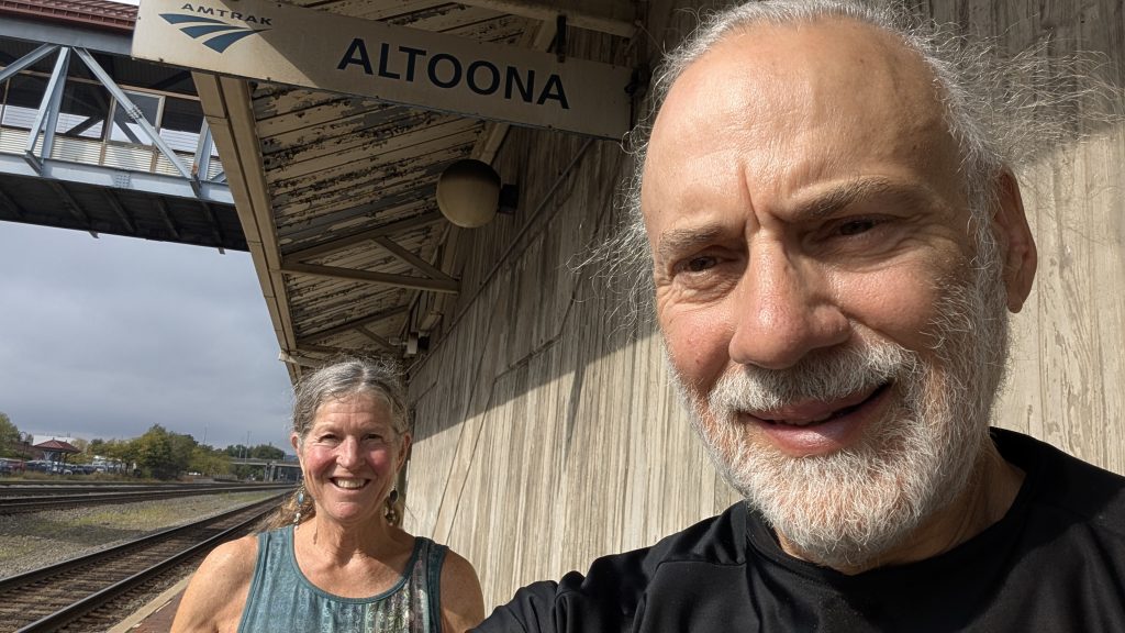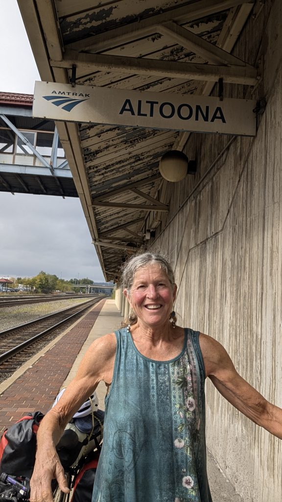 We got to Pittsburgh about 5:15 AM. I left Dana with the bags outside the coach car and retrieved the bikes from the baggage car. Amtrak doesn’t transfer the bikes for you, so you have to repeat the process described above every time you change trains. We took the elevator down to the station level and got them re-checked to Altoona. I tried the decaf from the coffee machine — pretty poor with lots of grounds. Dana wasn’t having any of that and we took a walk in early morning Pittsburg to a smoke-shop-convenience store and got her a real cup of coffee. Then it was back to the station for the next wait. We did get to take our bikes up early and board first — that itself was a first for me. We took seats across the aisle from each other and settled in for the 2 1/2 hr. trip to Altoona. We did manage to get a little rest this time – at least an whole hour for me (so, 3 hrs. for the night), before we got to the World Famous Horseshoe Curve and saw our engine out the right side window!