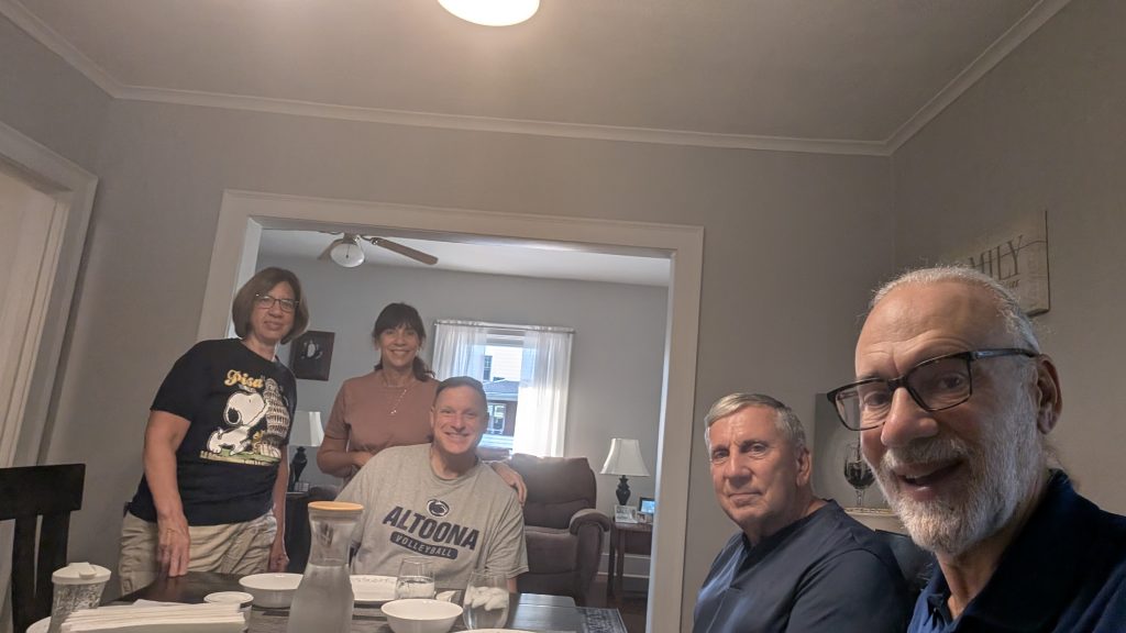 I can only report that Dana had a good time with her cousins and texted me at 12:54 a.m. to say she was just getting to bed. No early start tomorrow! I had a nice dinner at Joann’s with her husband Bob, my sister Carol, and Dave. Good to see everyone after such a long time away. Still, we made it a short night of it and I fell asleep in about 5 minutes while watching Monday Night Football. Dave conked out, too and we woke up about 2 and went to real beds. Tomorrow (well, today, technically), we’ll pack up and ride back to State College for the last leg of this journey.